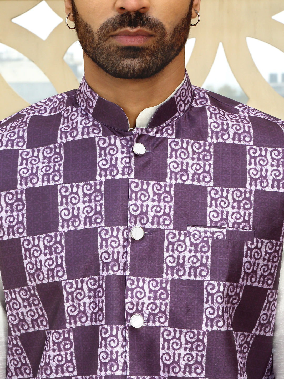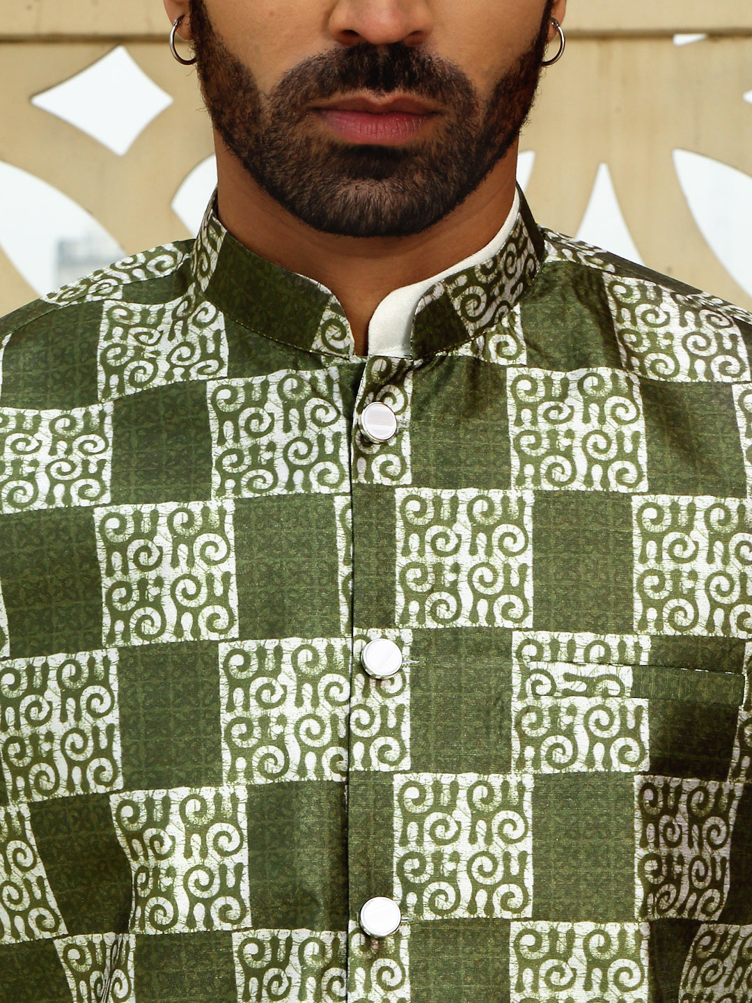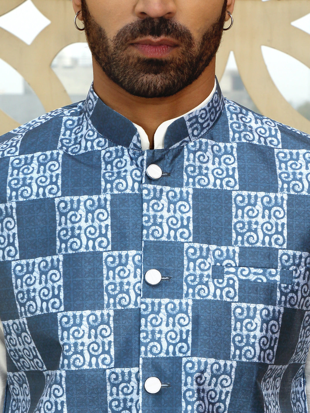Step into timeless elegance with this Silk Blend Solid Kurta Churidar Set, featuring a classic loop button closure for a refined touch. Paired with a sleeveless Bandhani Nehru jacket, this ensemble effortlessly blends tradition with contemporary sophistication. Perfect for festive occasions, weddings, and celebrations, this set ensures a regal and polished look with its rich textures and intricate detailing.