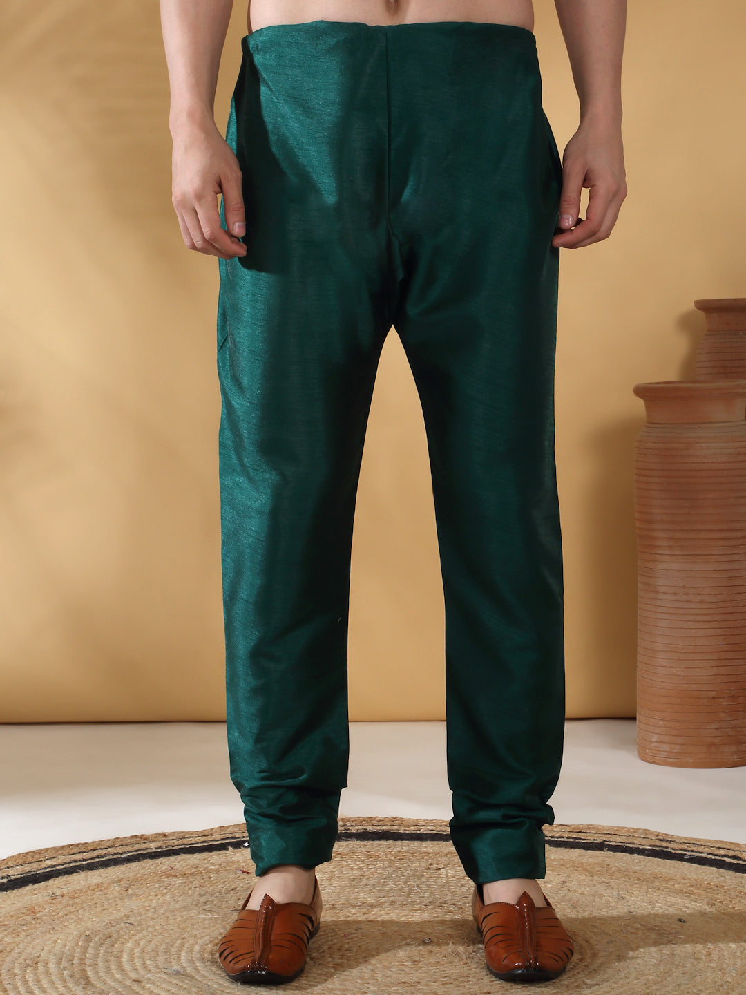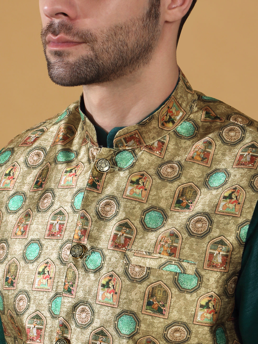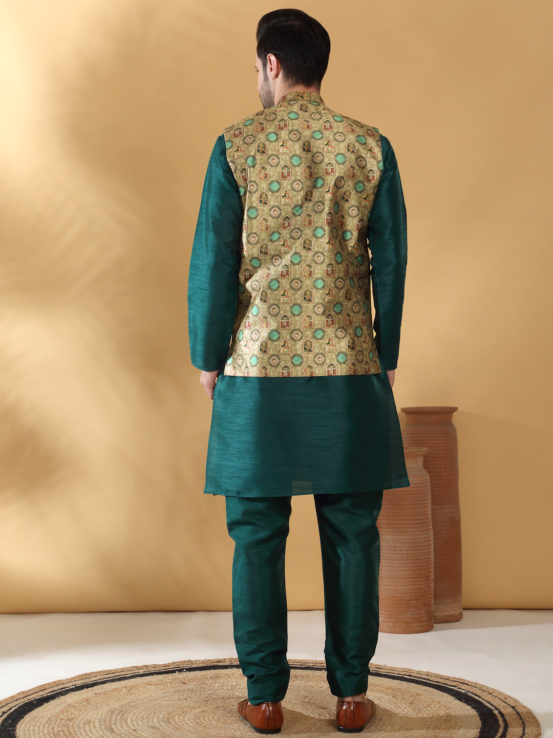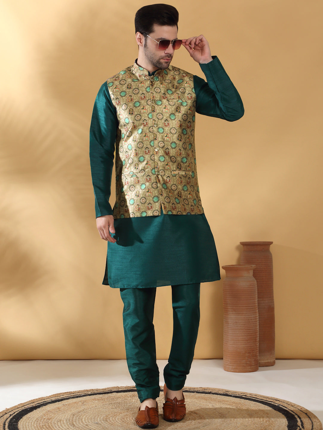 Silk Blend Solid Green Kurta Churidar With Sleeveless Abstract printed Nehru Jacket set