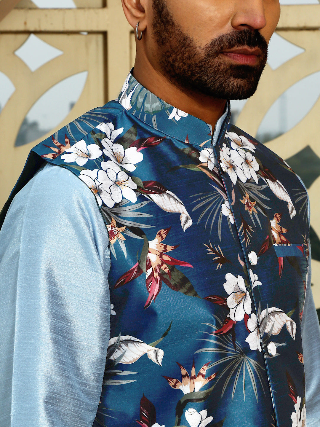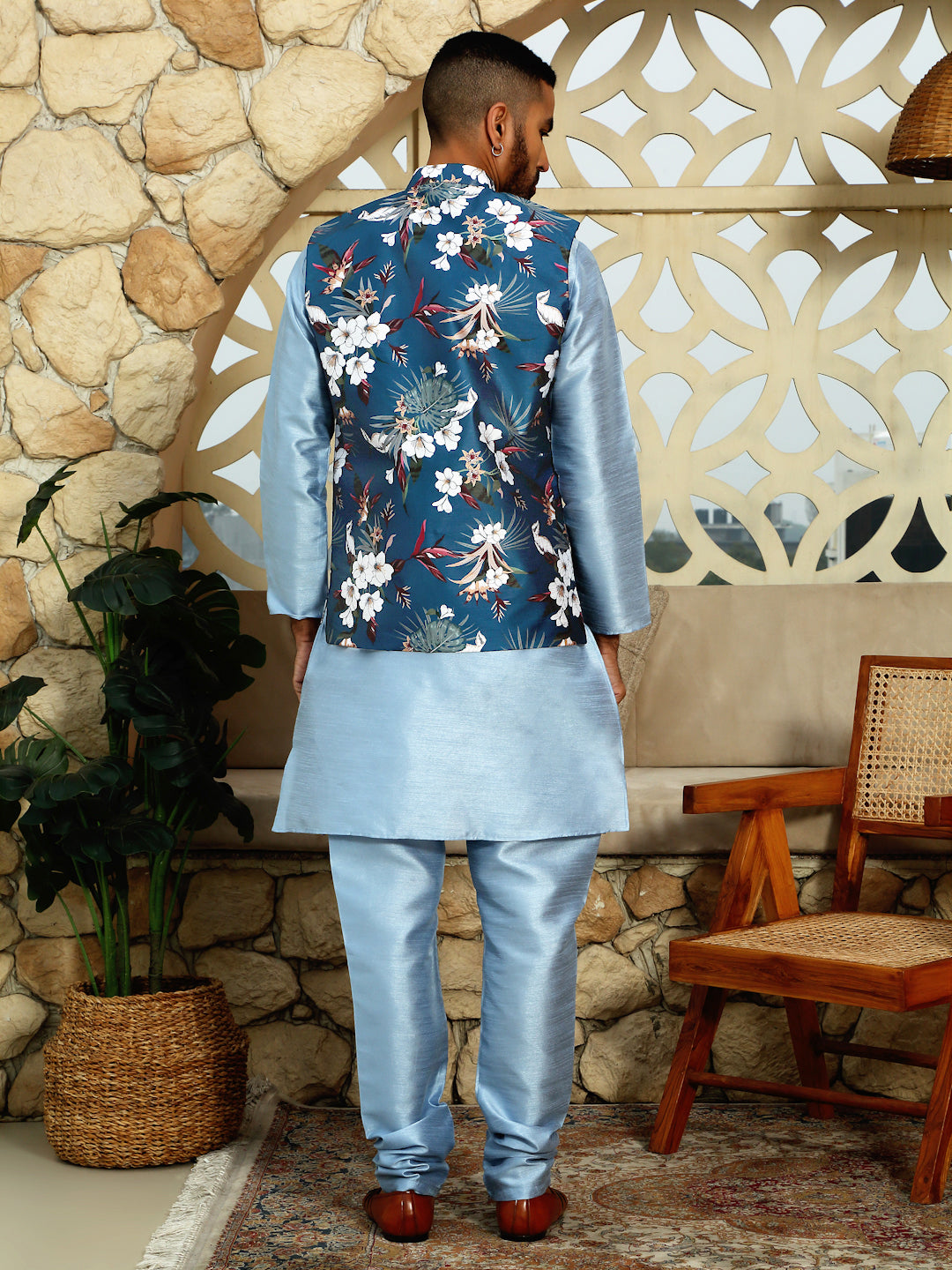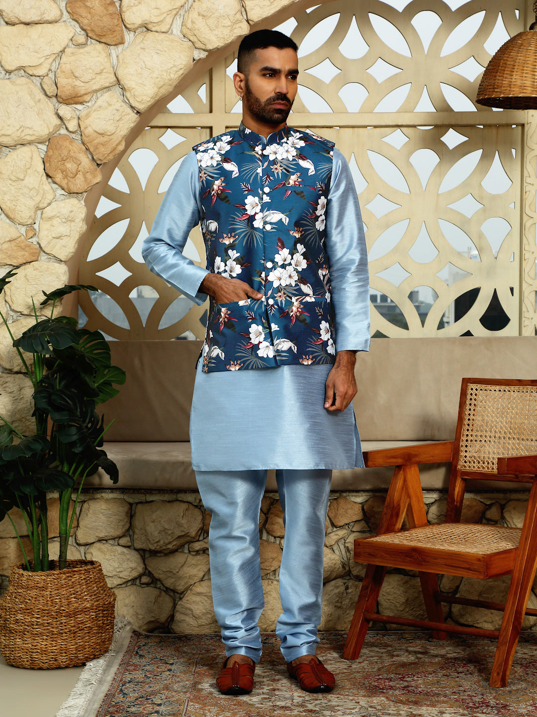 A Kurta Churidar paired with a sleeveless floral Nehru jacket is a sophisticated ensemble that blends traditional Indian attire with contemporary flair. The set typically includes a straight-cut kurta made from Silk Blend, known for its lustrous texture and durability, and a churidar—tightly fitting trousers that gather at the ankles—crafted from the same fabric. The ensemble is elevated by a sleeveless Nehru jacket featuring floral prints or embroidery, adding a modern touch to the classic outfit. This combination is ideal for festive occasions, weddings, or cultural events, offering a blend of elegance and comfort.