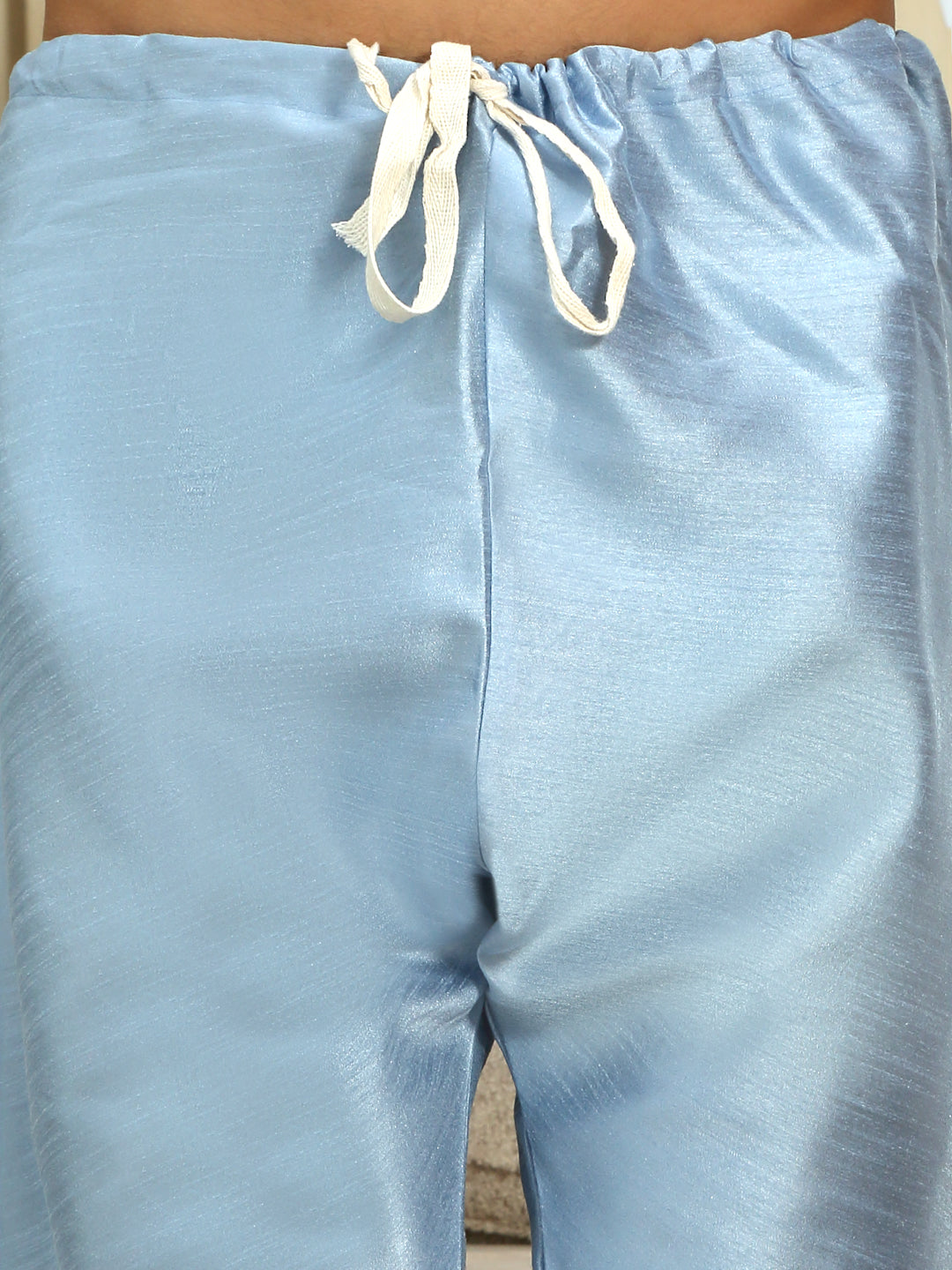 Silk Blend Solid Sky Blue Kurta Churidar With Sleeveless Floral Printed Nehru Jacket set