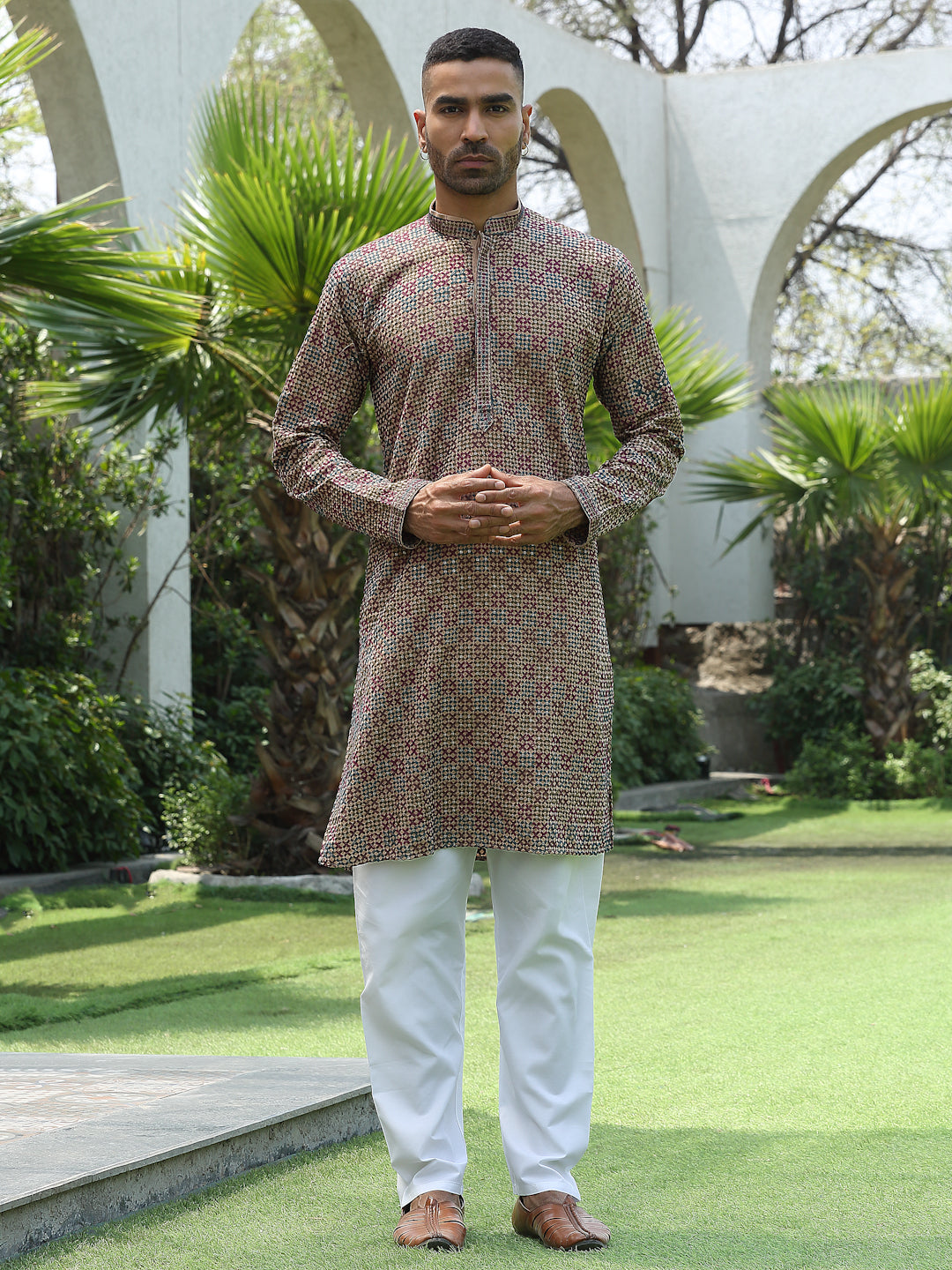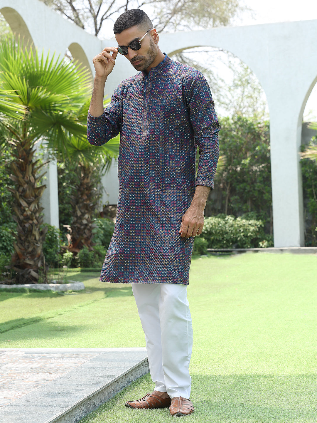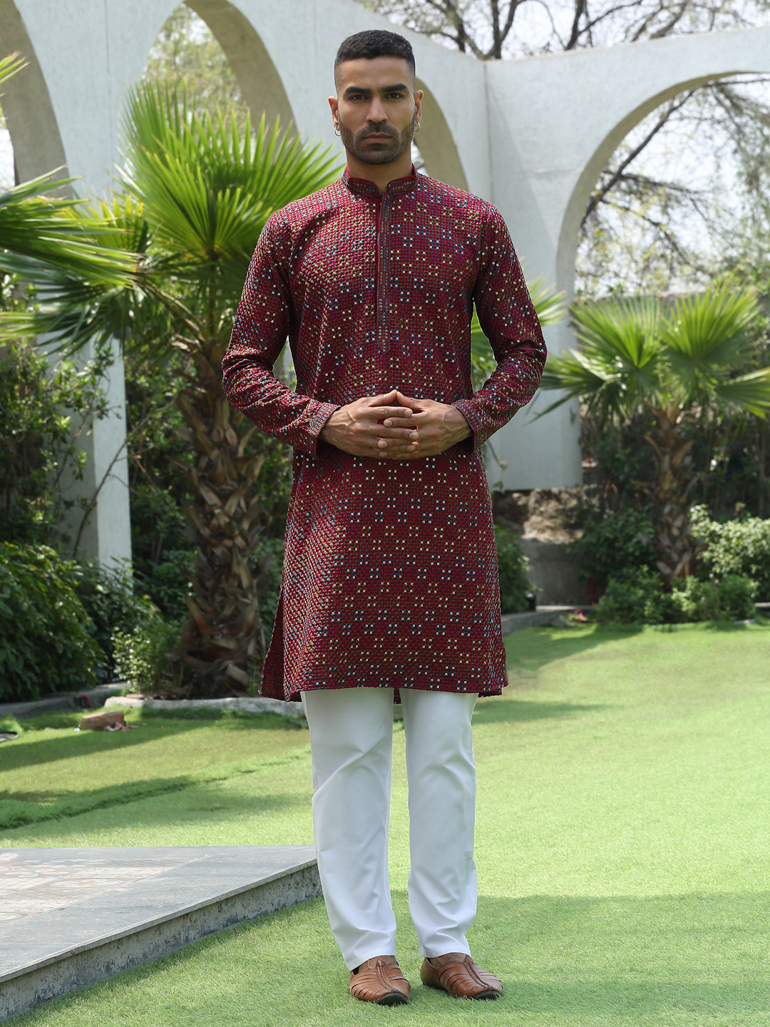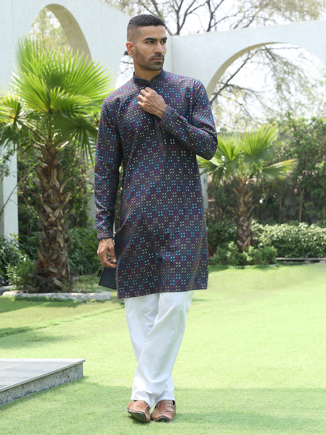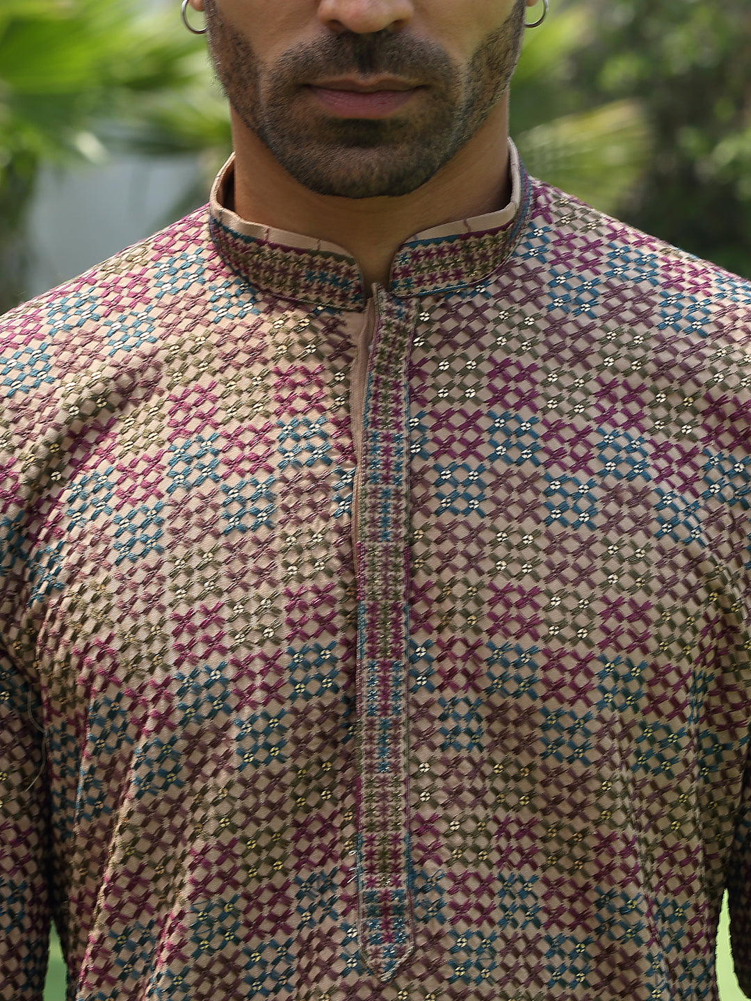 Add a touch of elegance to your festive look with this Men’s Cotton Rayon Kurta Pyjama Set. The kurta features intricate embroidery with shimmering sequin detailing and a stylish Mandarin collar for a refined ethnic appeal. Crafted from soft, breathable fabric, it ensures comfort and style throughout the day. Paired with an elastic waistband white pyjama, this set is perfect for weddings, celebrations, and traditional occasions.