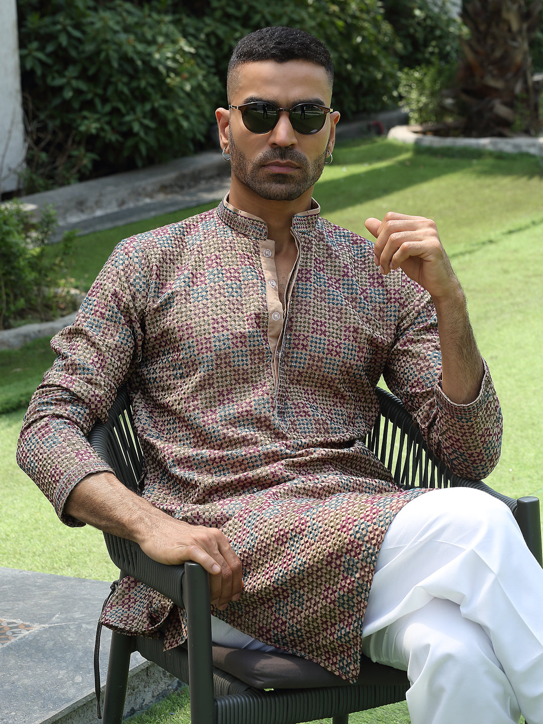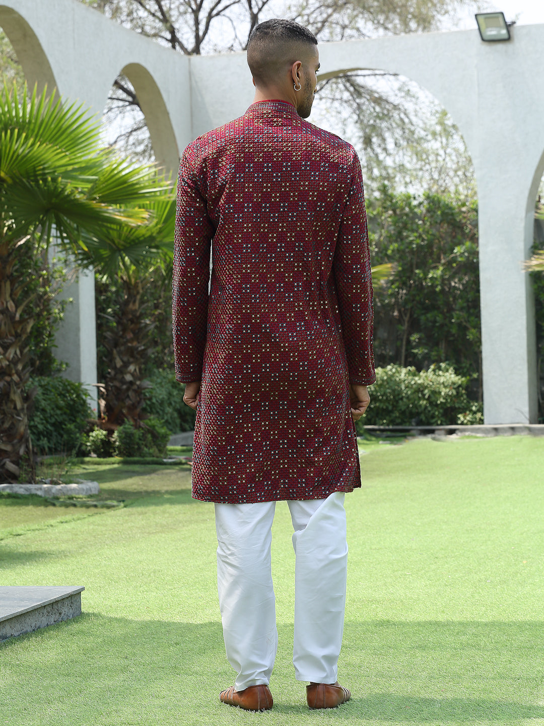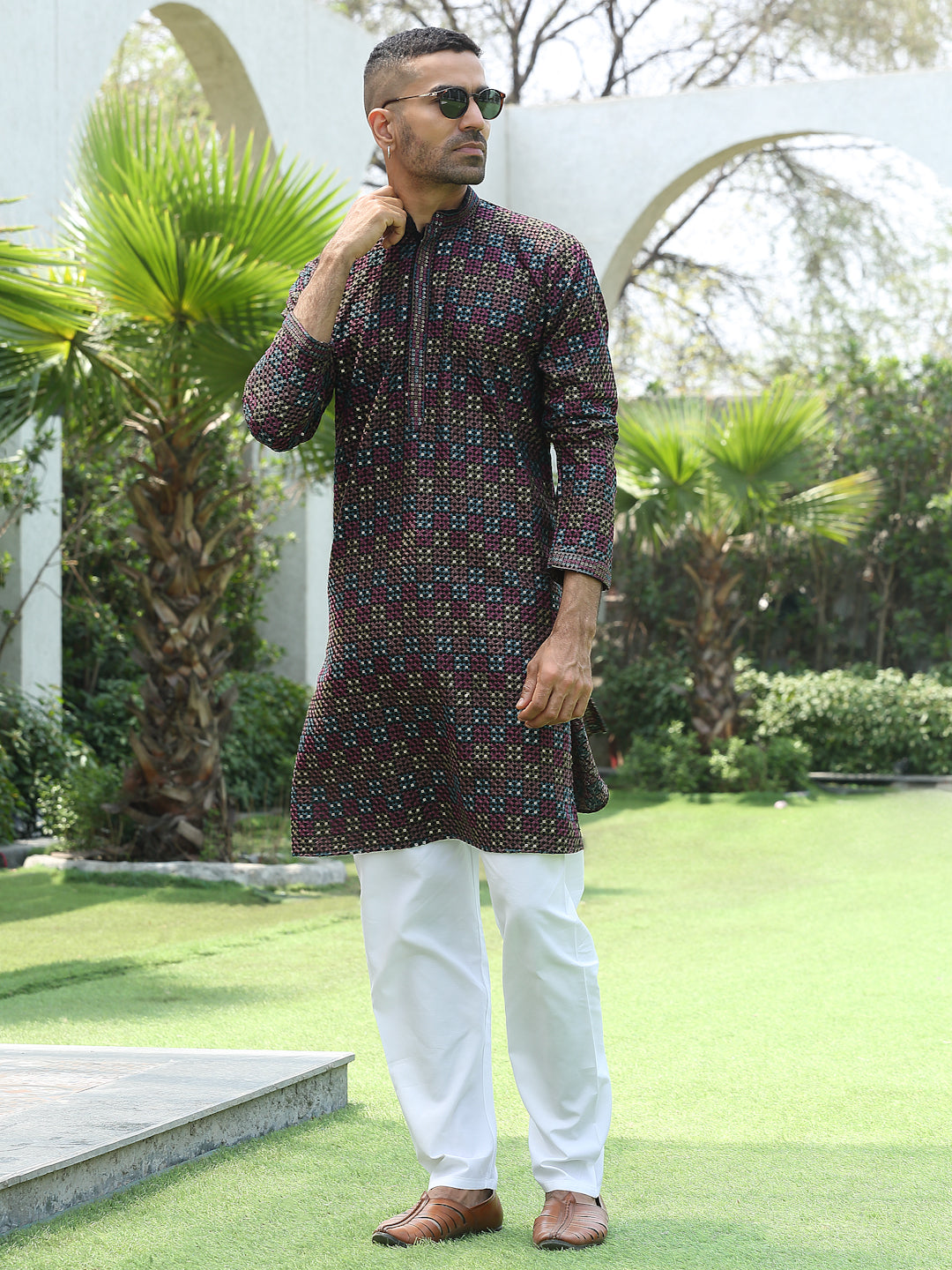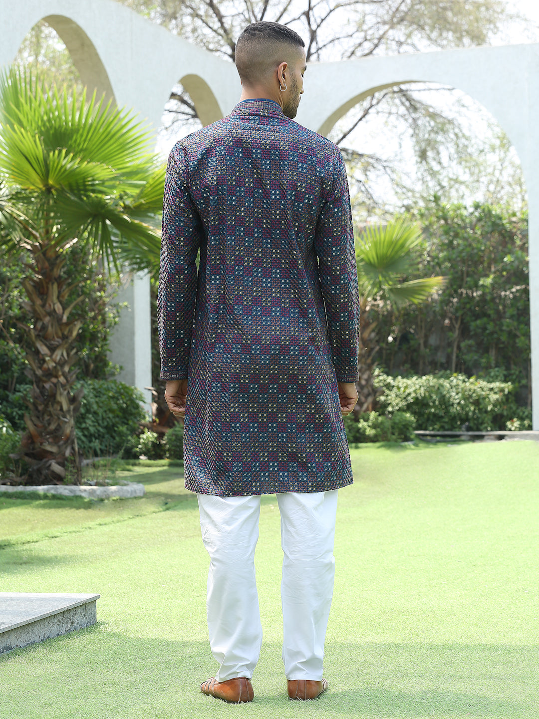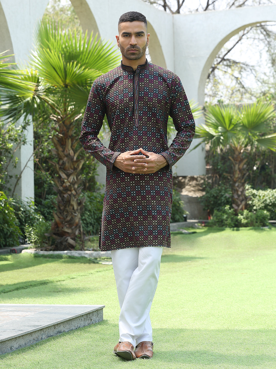 Add a touch of elegance to your festive look with this Men’s Cotton Rayon Kurta Pyjama Set. The kurta features intricate embroidery with shimmering sequin detailing and a stylish Mandarin collar for a refined ethnic appeal. Crafted from soft, breathable fabric, it ensures comfort and style throughout the day. Paired with an elastic waistband white pyjama, this set is perfect for weddings, celebrations, and traditional occasions.