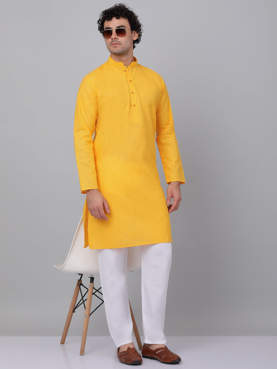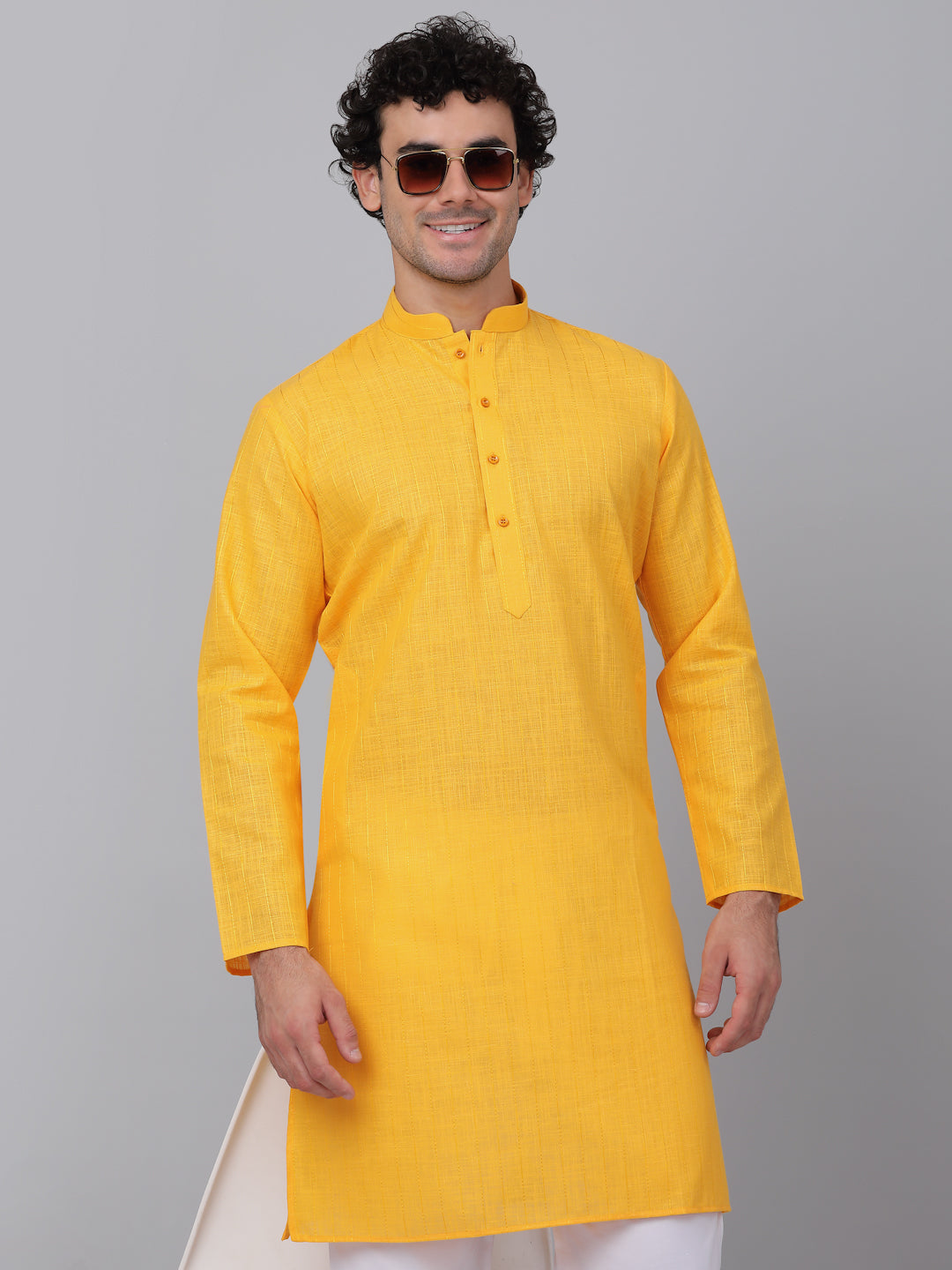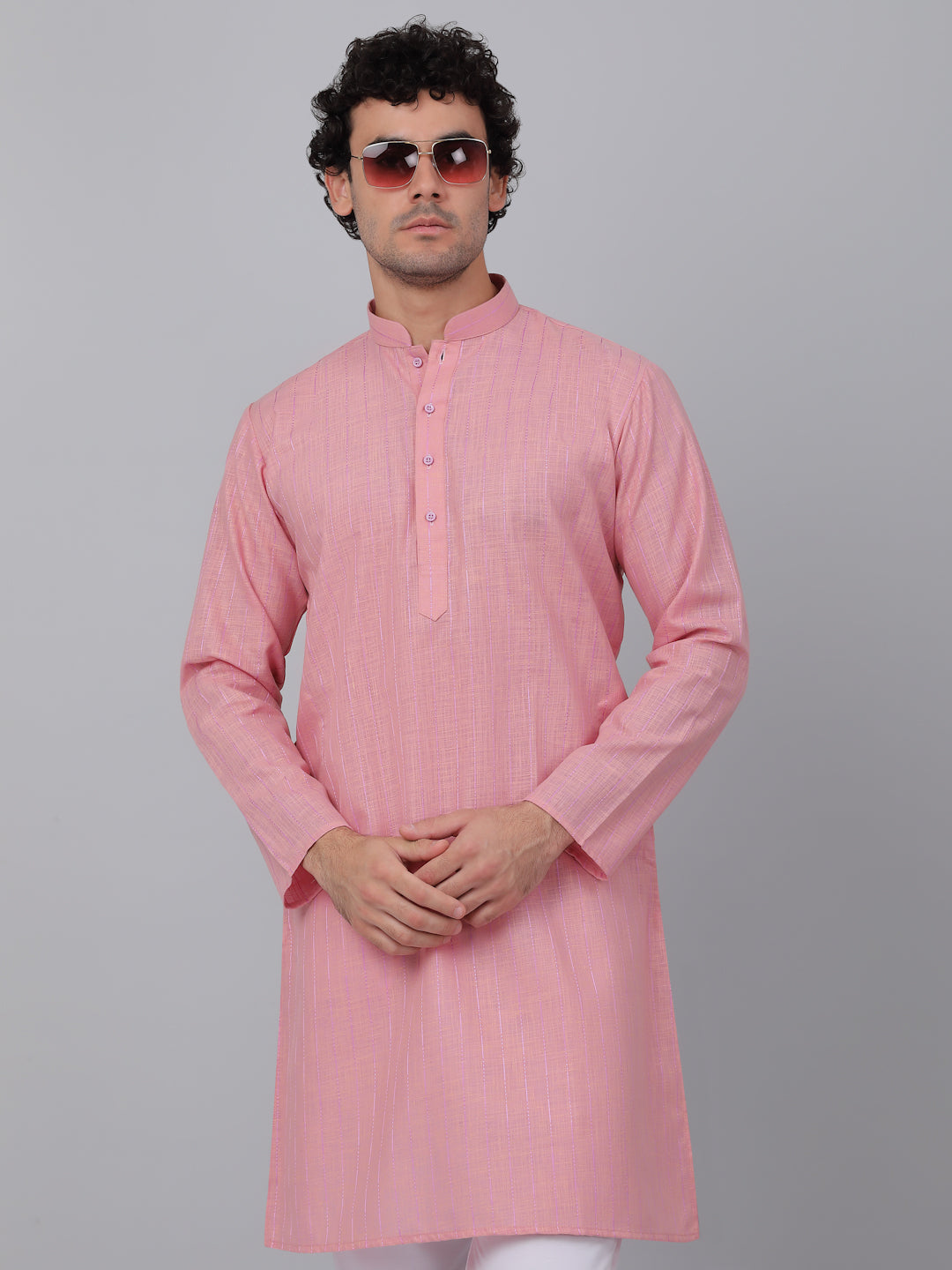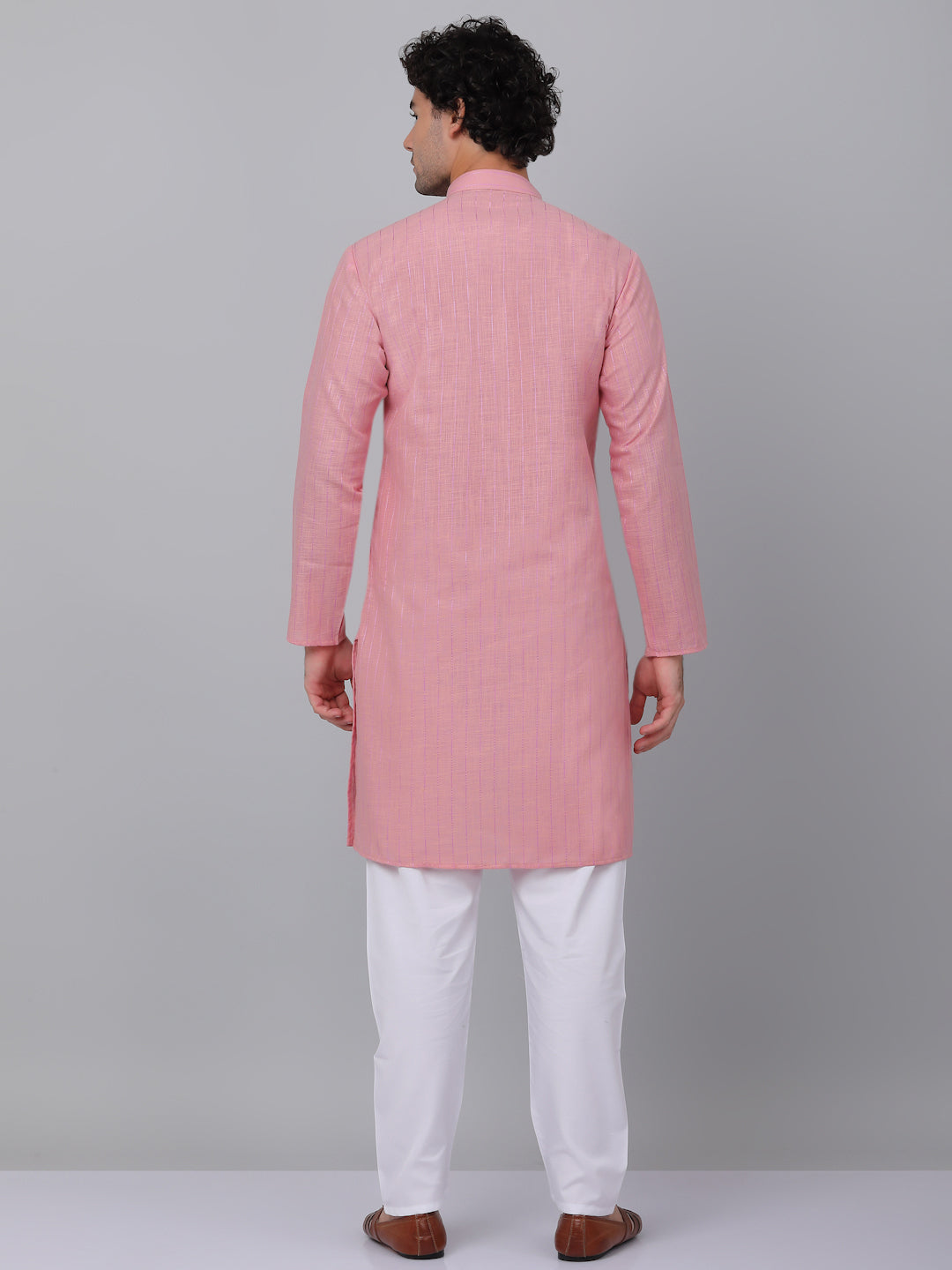 KRAFT INDIA Men Cotton Linen Striped Thread Work Knee Length Kurta With White Elastic Waistband Pyjama Set