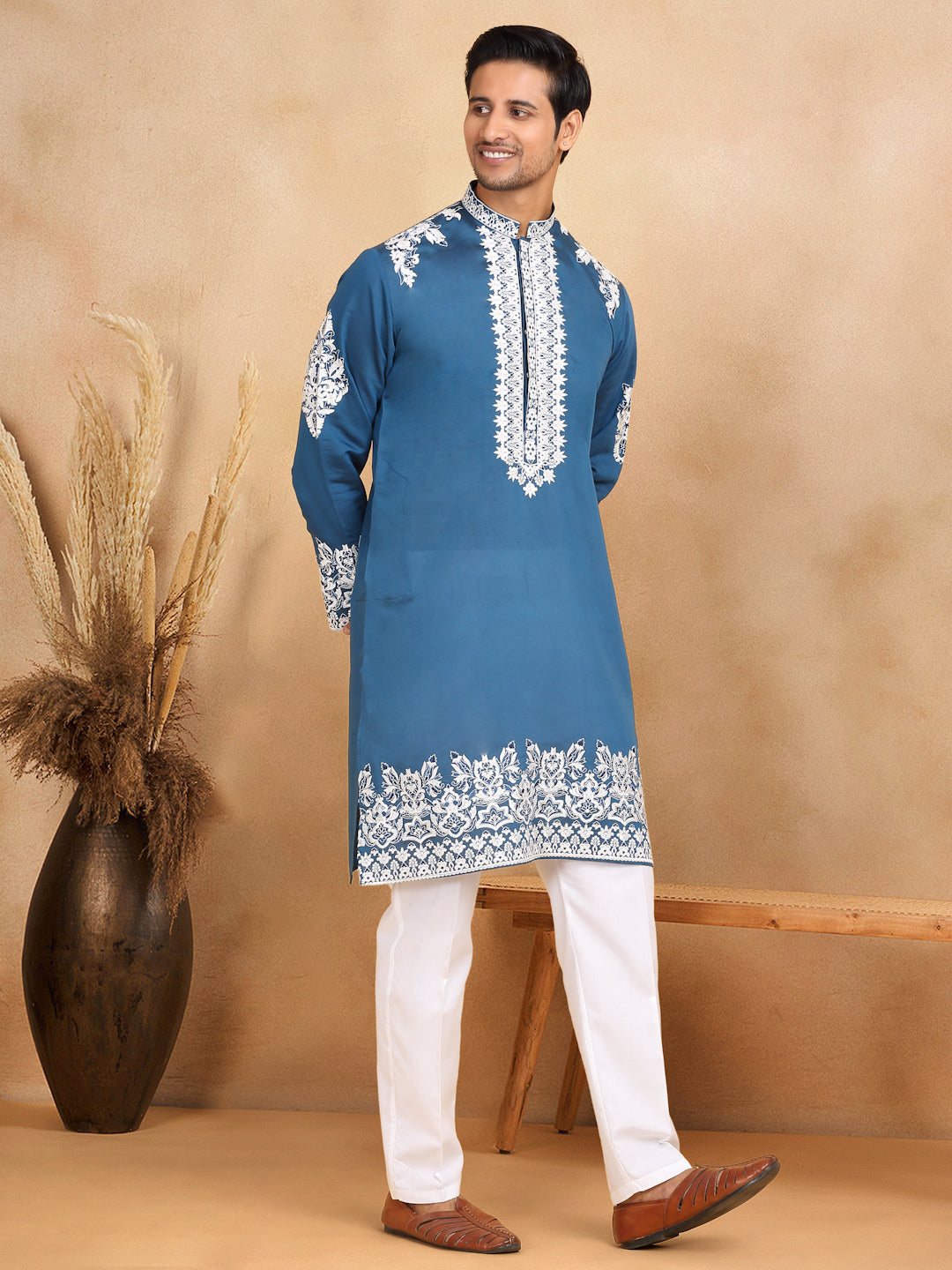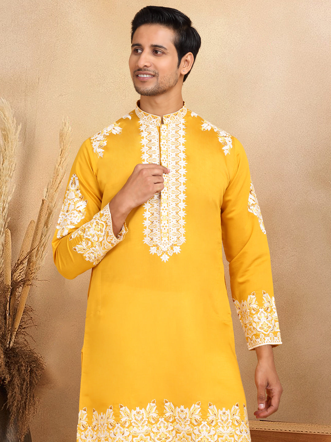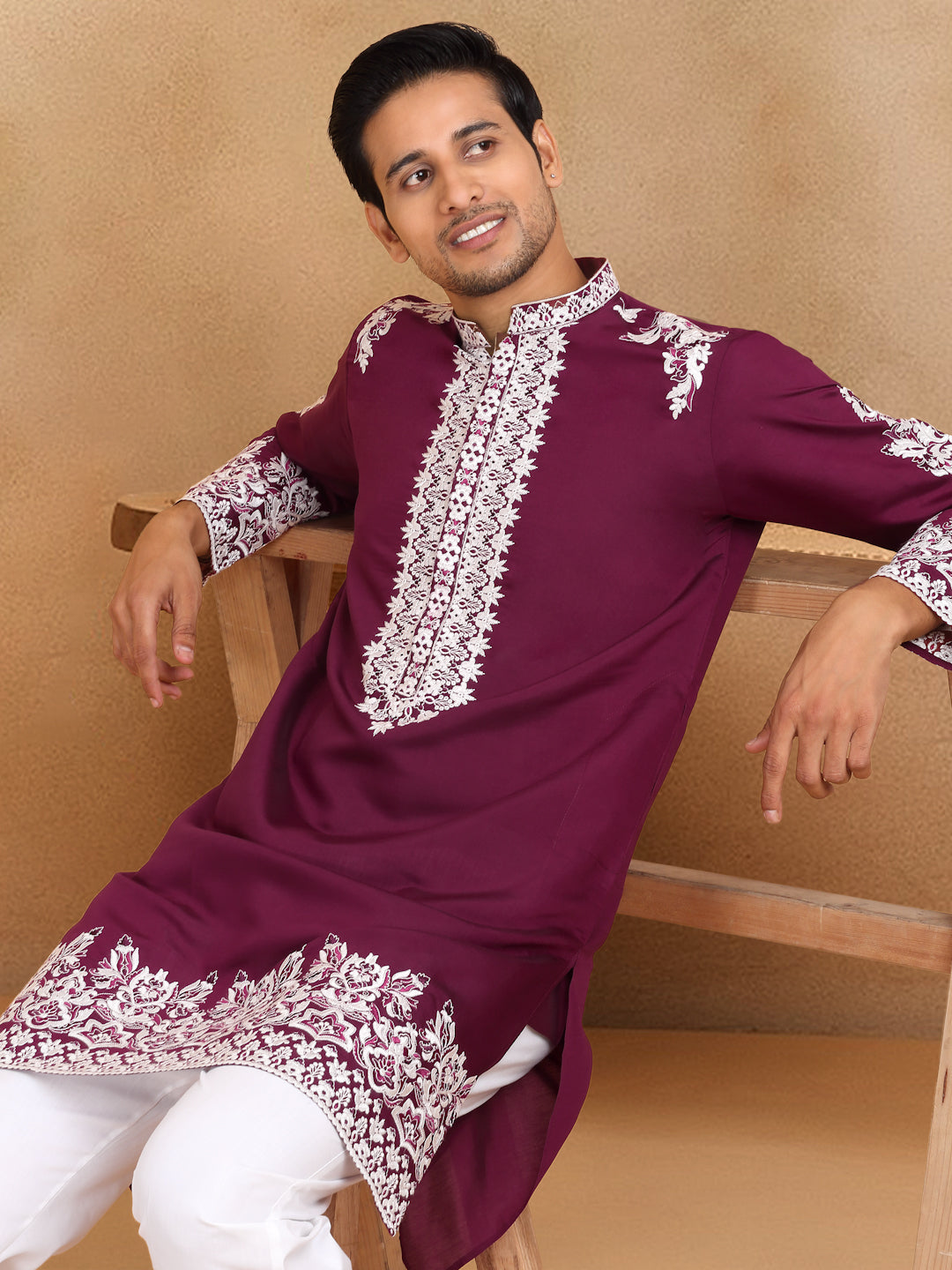 Experience the perfect blend of comfort and style with our Men's Cotton Silk Ethnic Motifs Kurta Trouser Set. Made with high-quality cotton silk fabric and featuring intricate white embroidery, this set is sure to turn heads. The mandarin collar and long sleeves add a touch of sophistication, making it perfect for any occasion. Elevate your wardrobe with this timeless and elegant kurta trouser set.