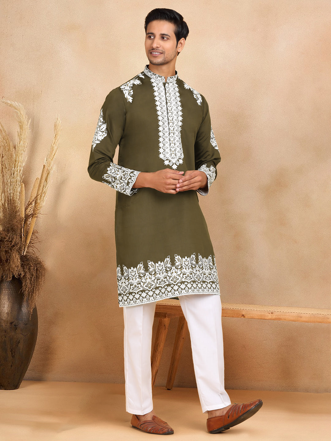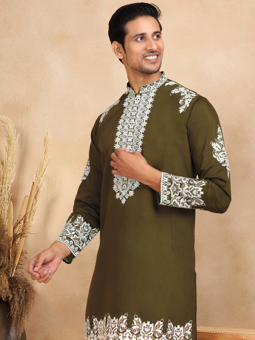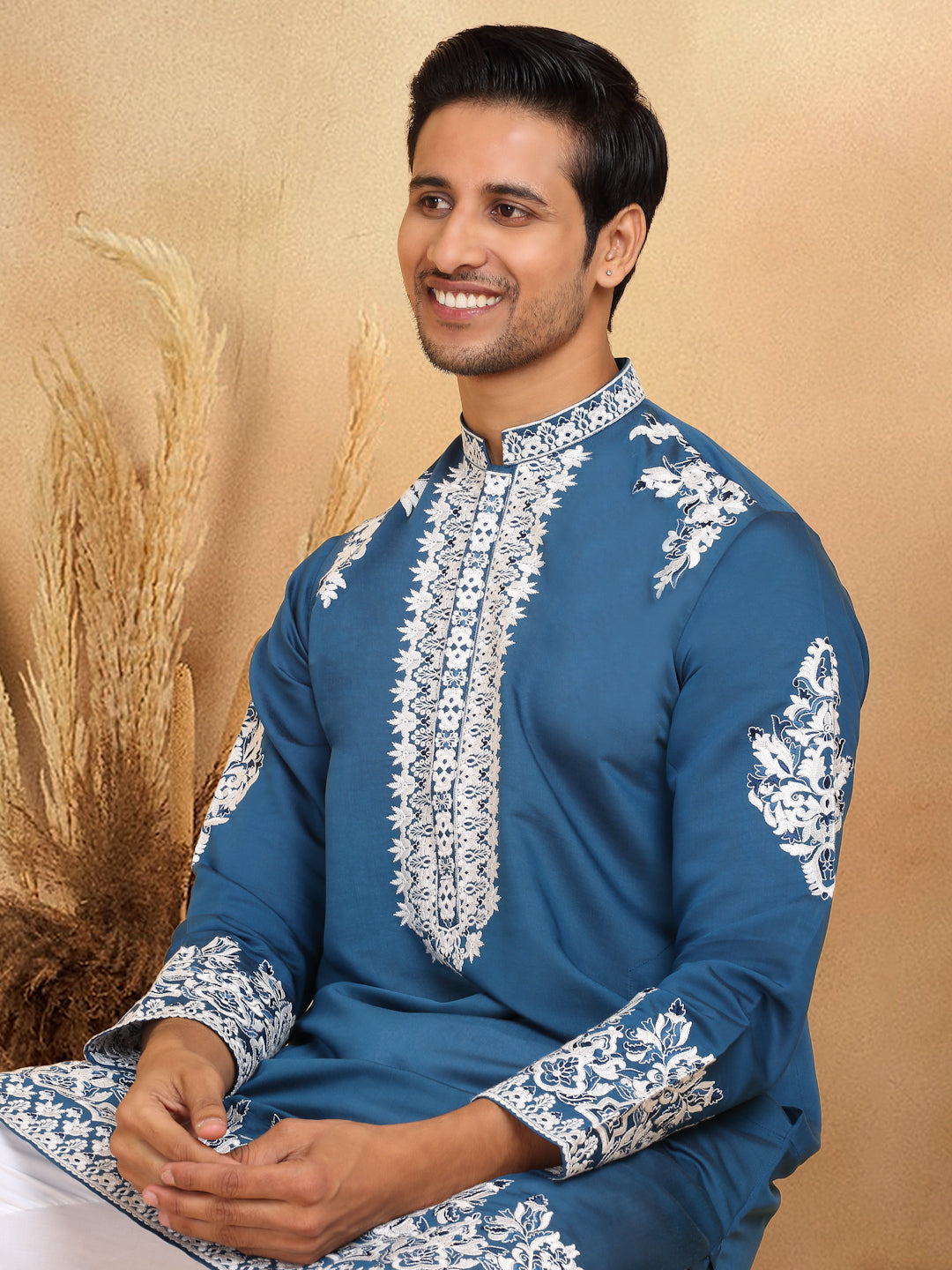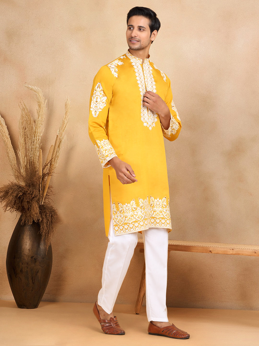 Experience the perfect blend of comfort and style with our Men's Cotton Silk Ethnic Motifs Kurta Trouser Set. Made with high-quality cotton silk fabric and featuring intricate white embroidery, this set is sure to turn heads. The mandarin collar and long sleeves add a touch of sophistication, making it perfect for any occasion. Elevate your wardrobe with this timeless and elegant kurta trouser set.