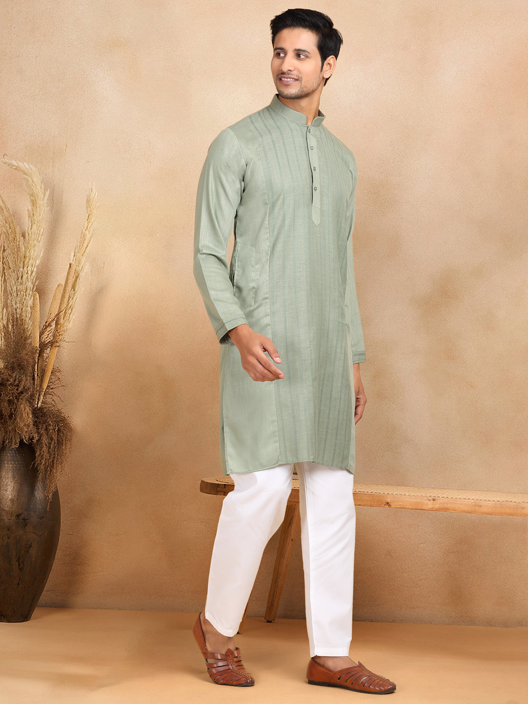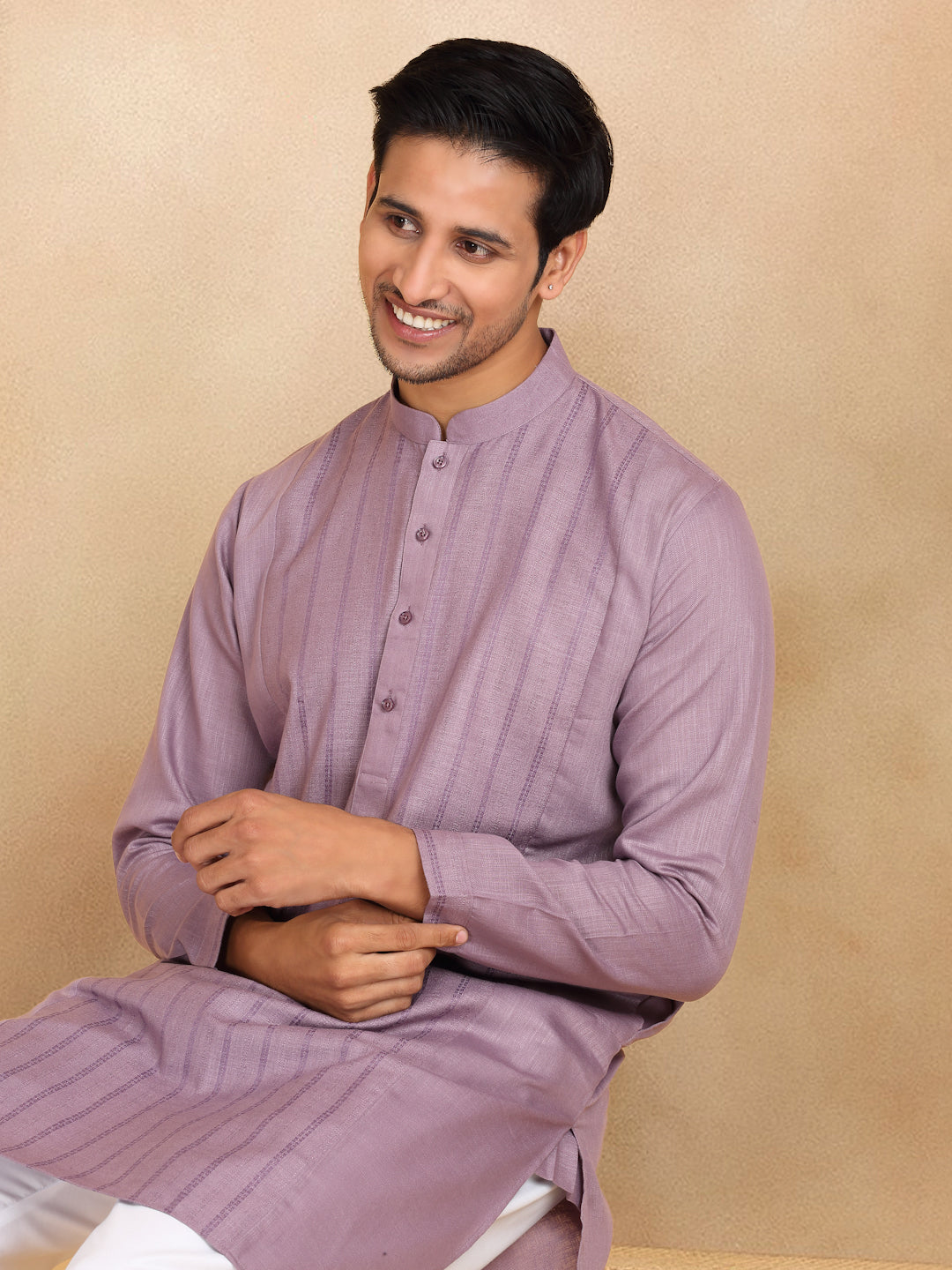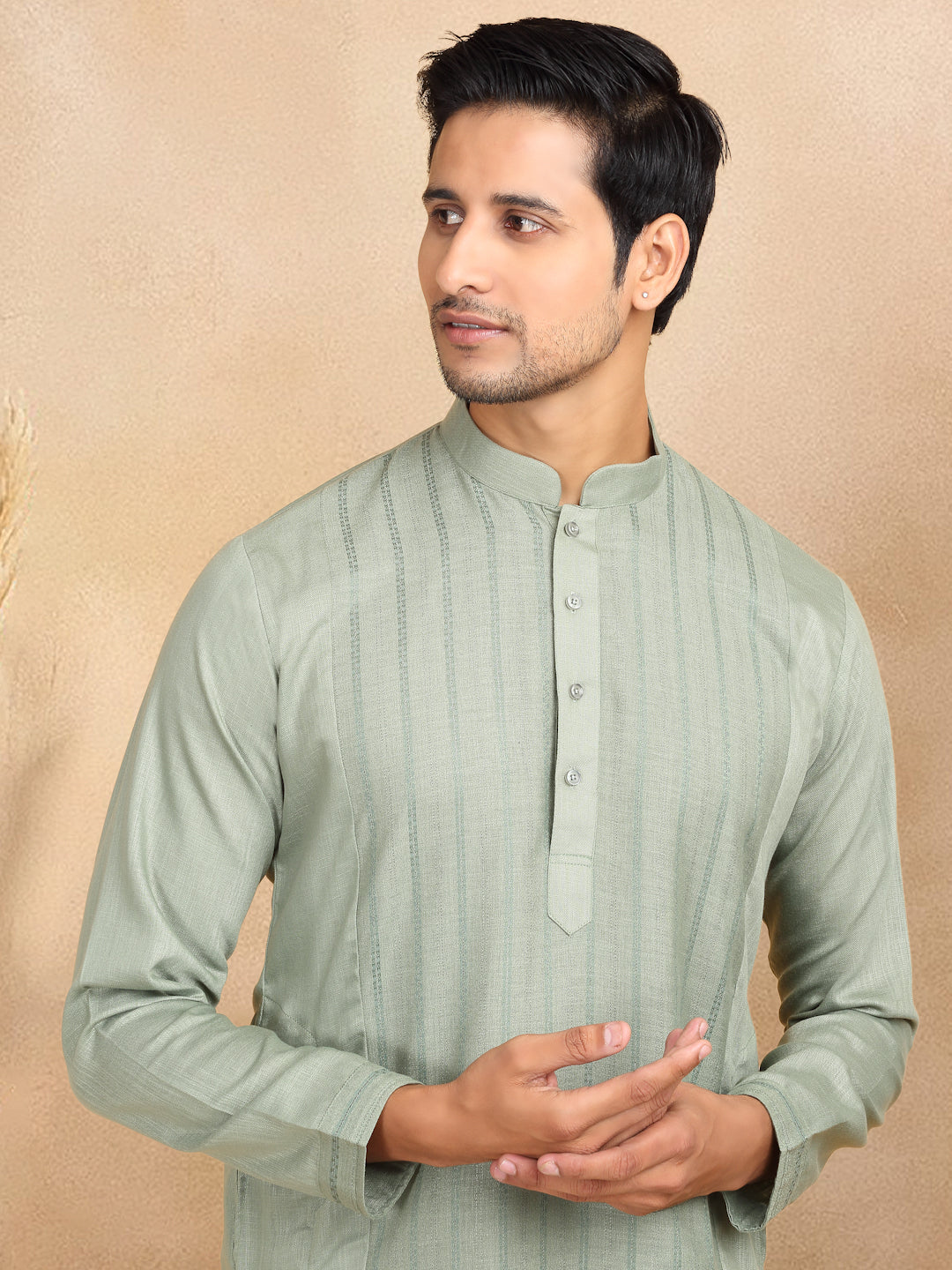 Elevate your ethnic wardrobe with our Men's Regular Striped Mandarin Collar Long Sleeve Kurta Pyjama Set. This sophisticated ensemble features a contemporary striped design that adds a touch of modernity to classic attire. Crafted from high-quality fabric, the kurta ensures comfort and breathability, making it perfect for festive occasions or casual gatherings.