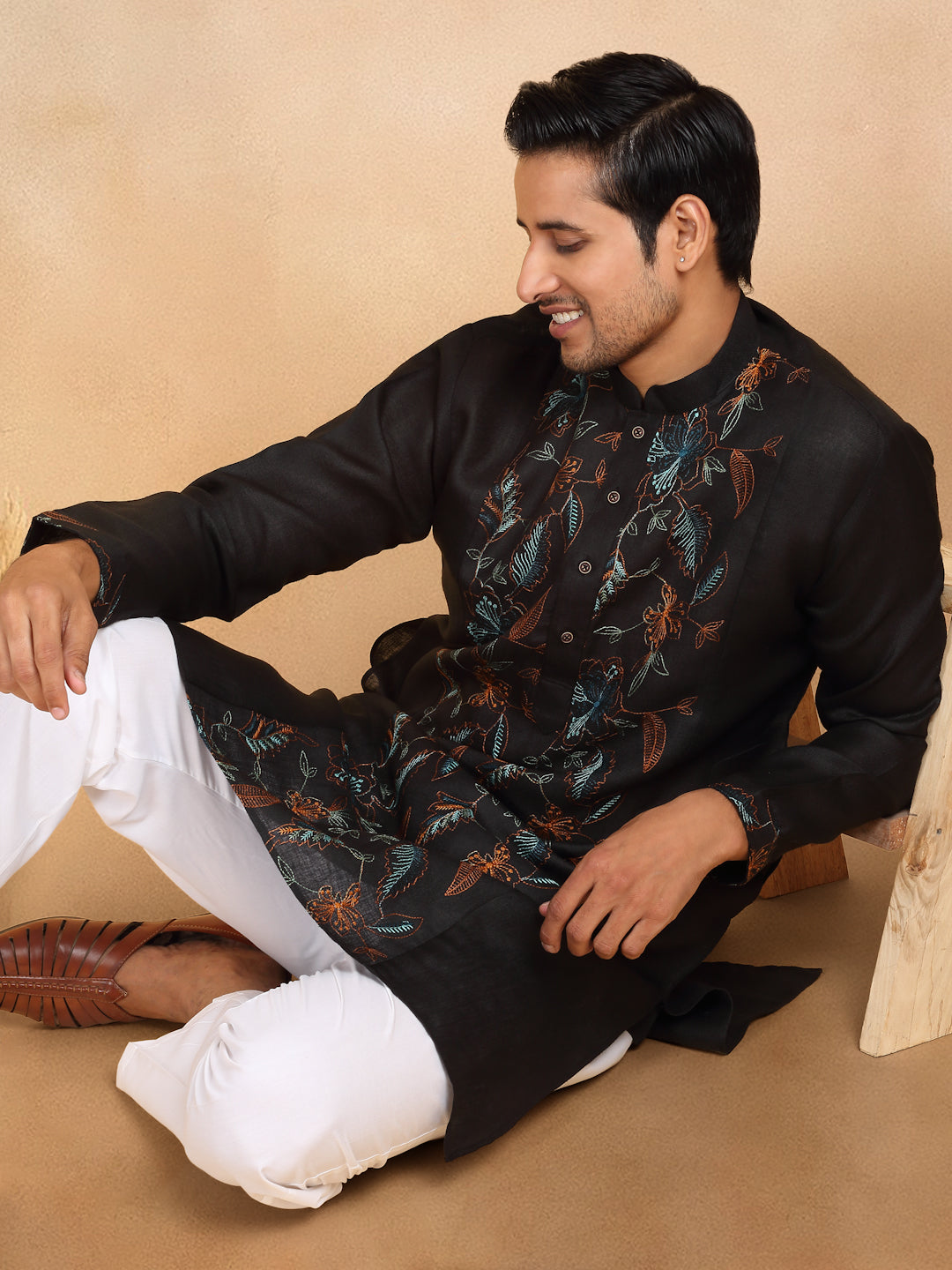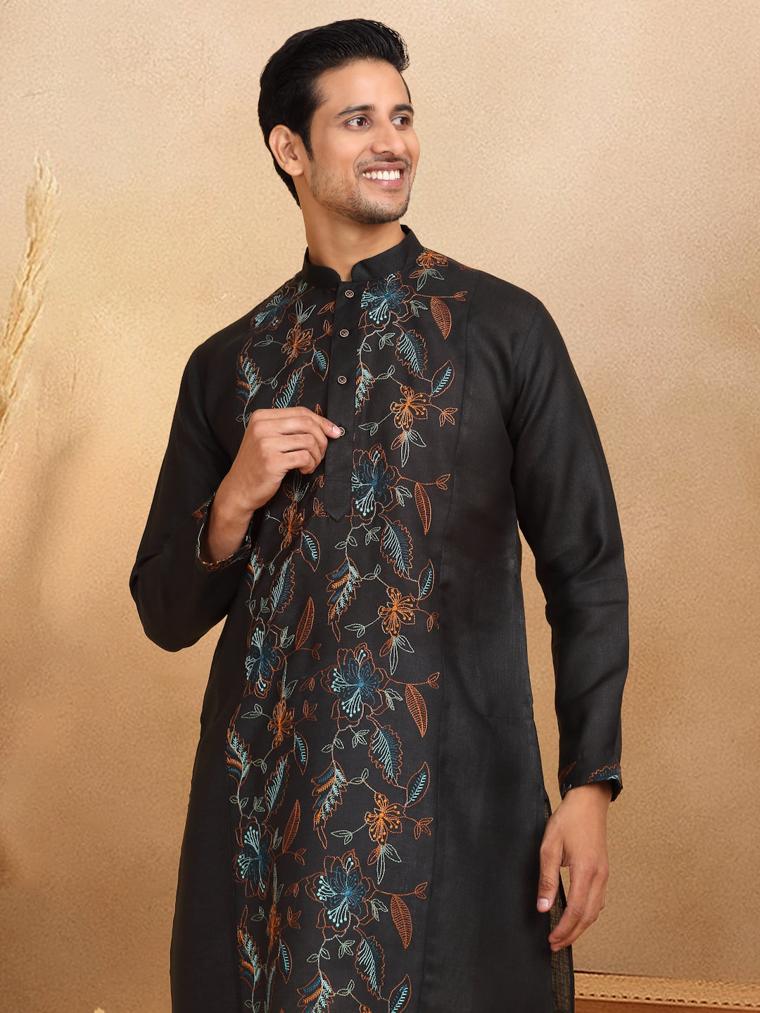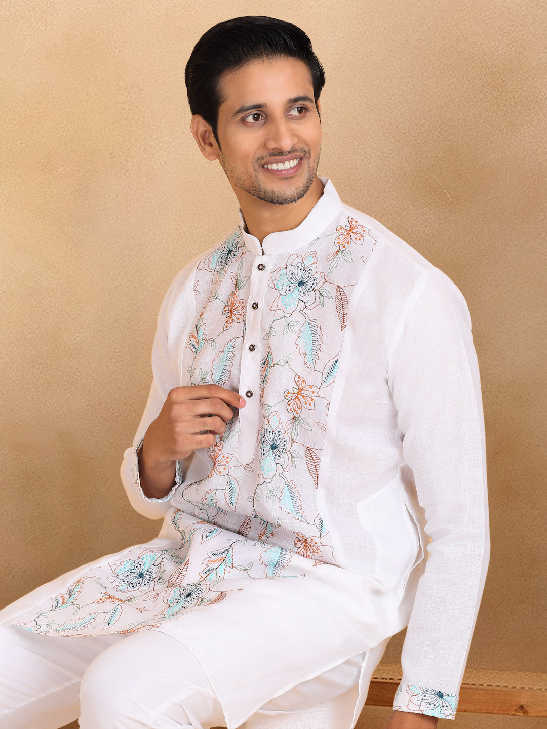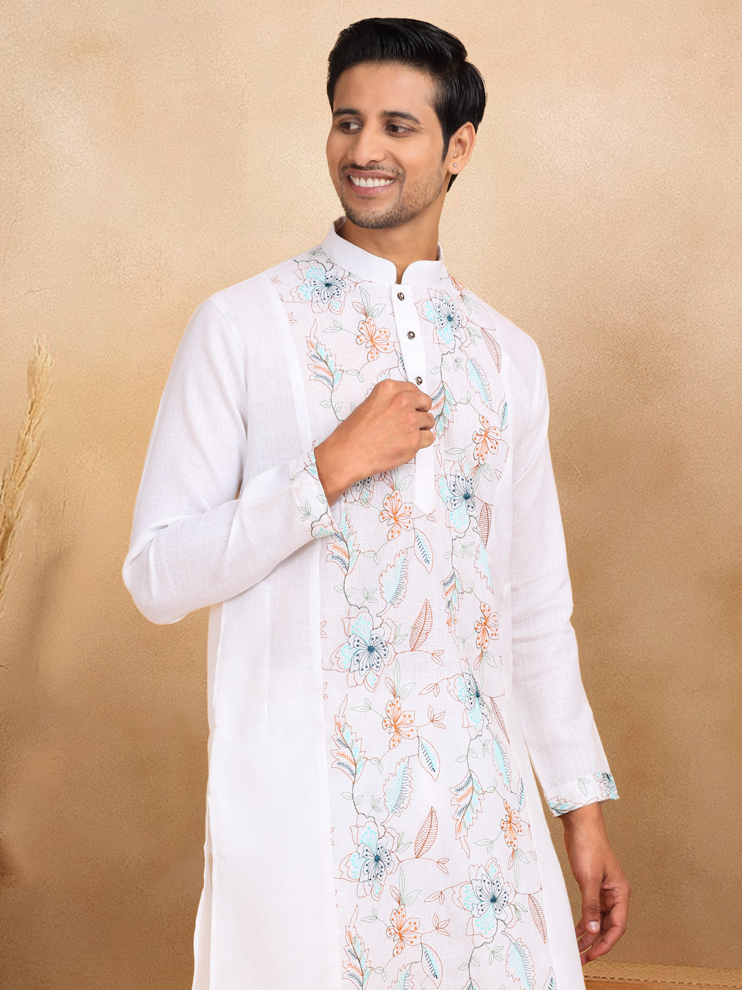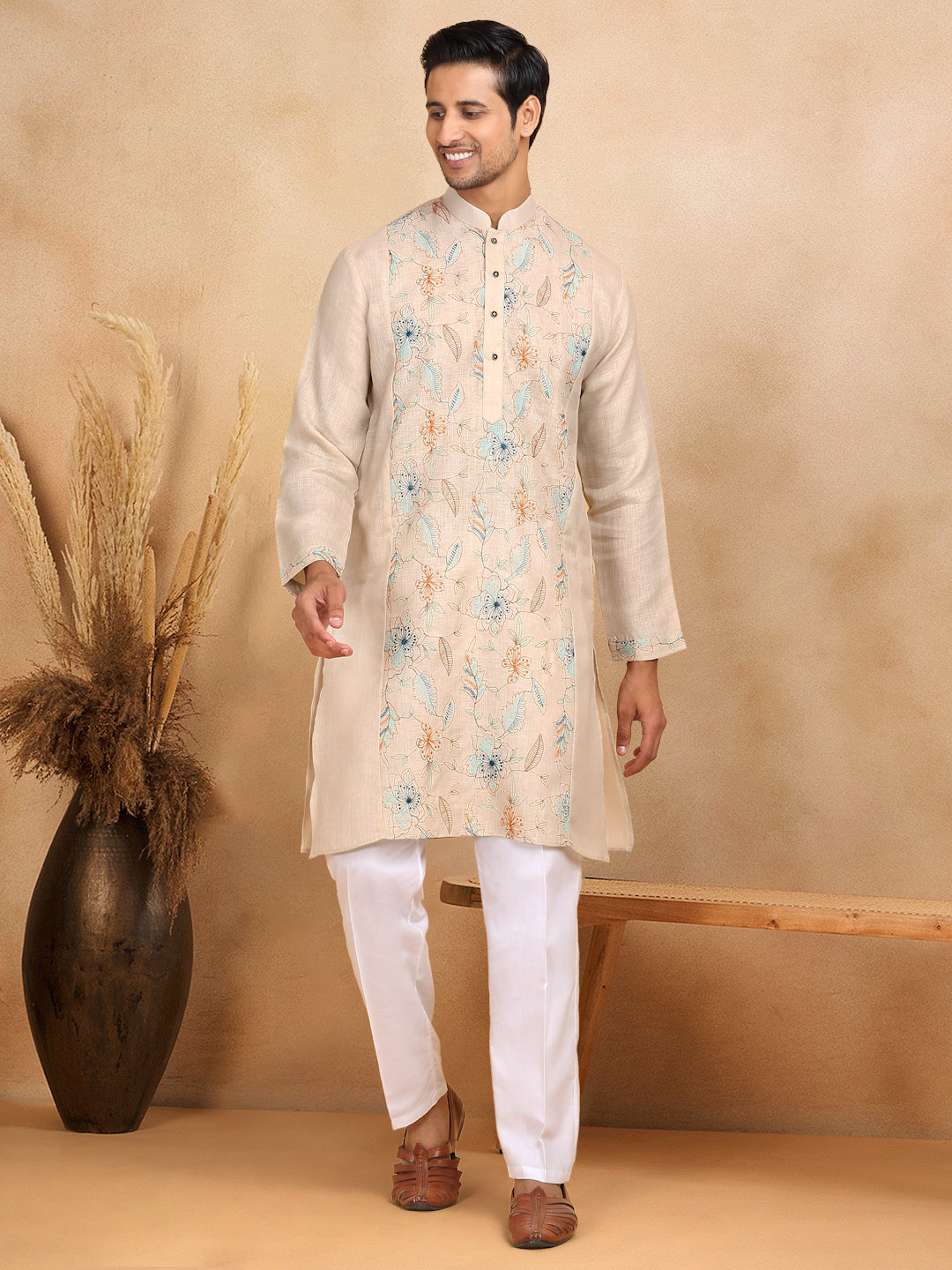 Crafted with traditional floral embroidery, this men's kurta trouser set is made from soft, breathable cotton. The knee-length kurta features convenient side pockets and a straight cut for a comfortable fit. Perfect for any occasion, add a touch of cultural flair to your wardrobe.