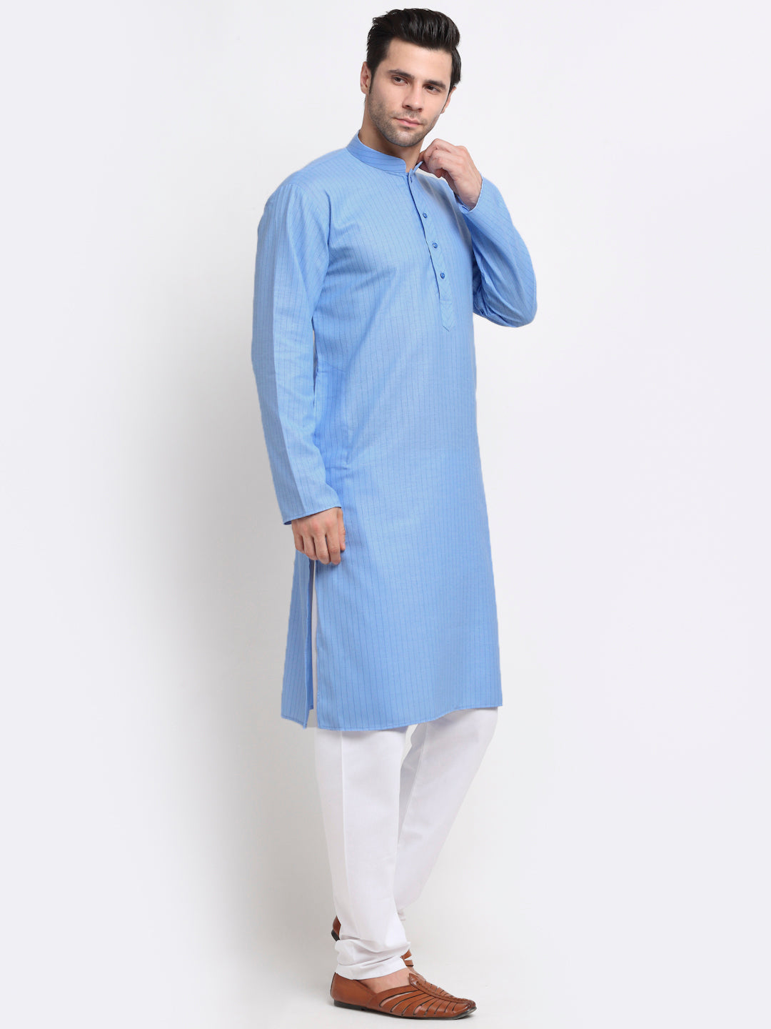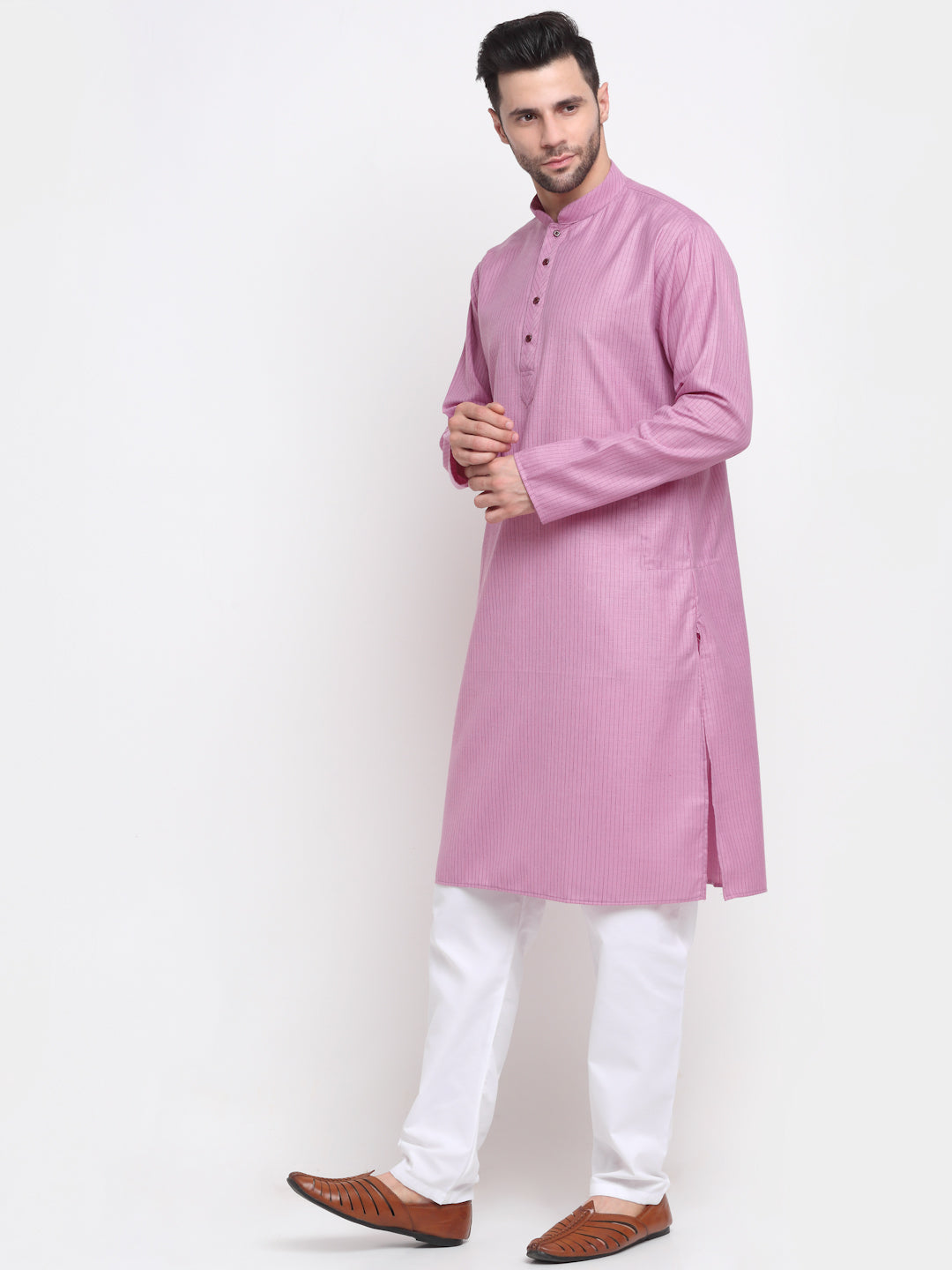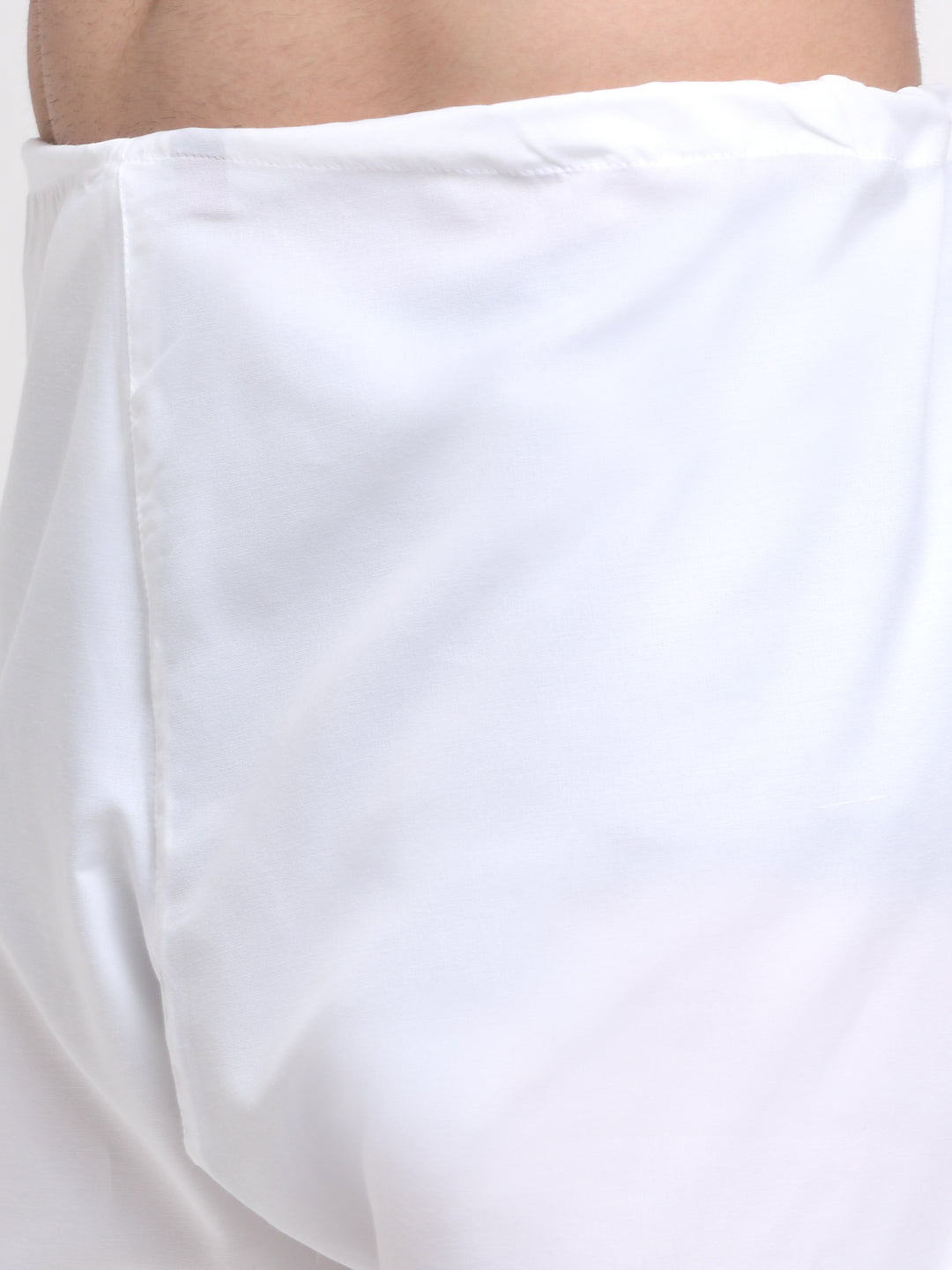 Straight knee length kurta, has a mandarin collar, long sleeves, side pockets, button closure, side slits, straight hem with drawstring closure white pyjama