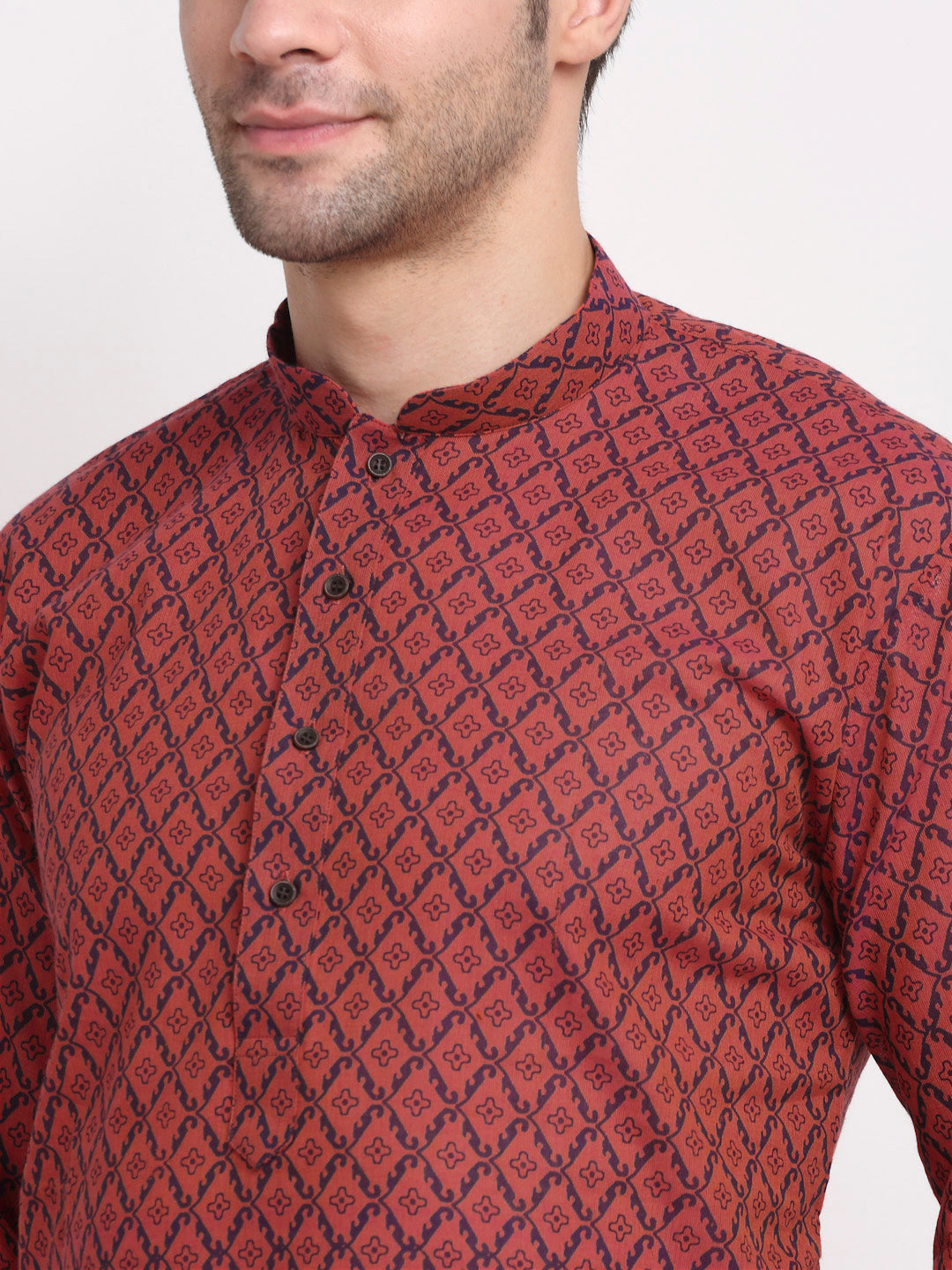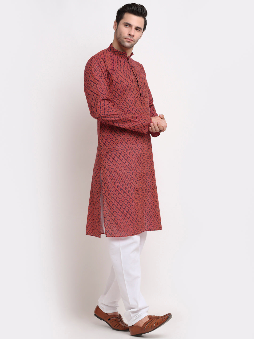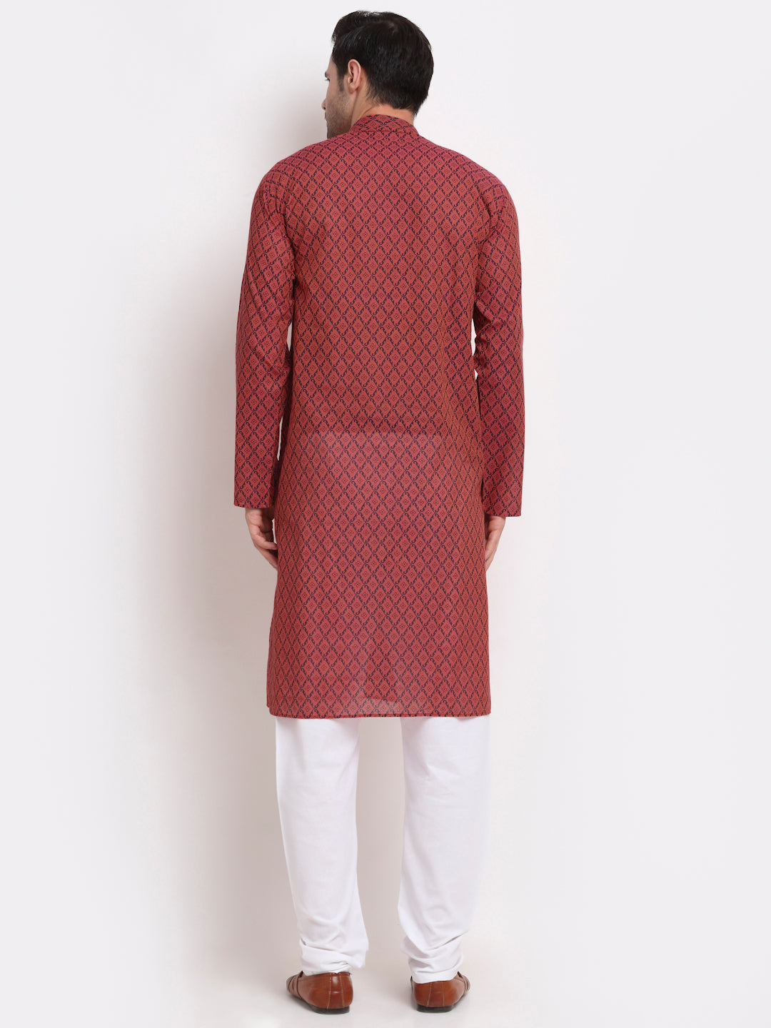 Men's Cotton Blend Red Motifs Printed Kurta Pyjama Set