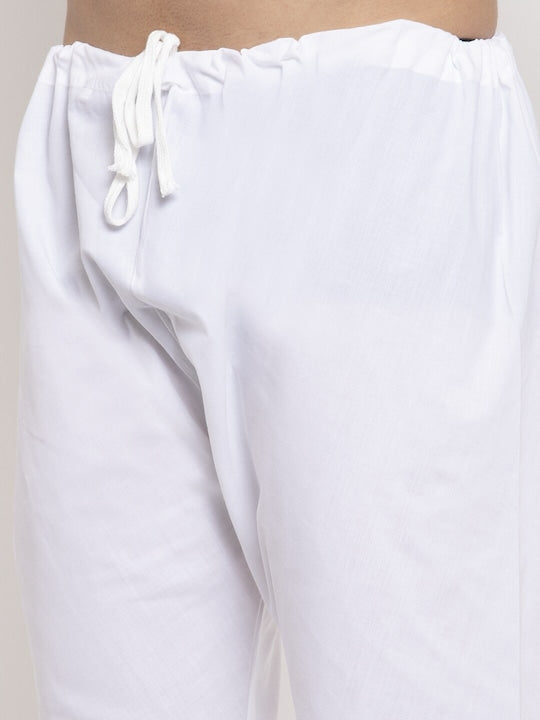 Self-check woven design knee-length kurta has a mandarin collar, long sleeves, side pockets, straight hem, button closure, side slits with drawstring closure white pyjama