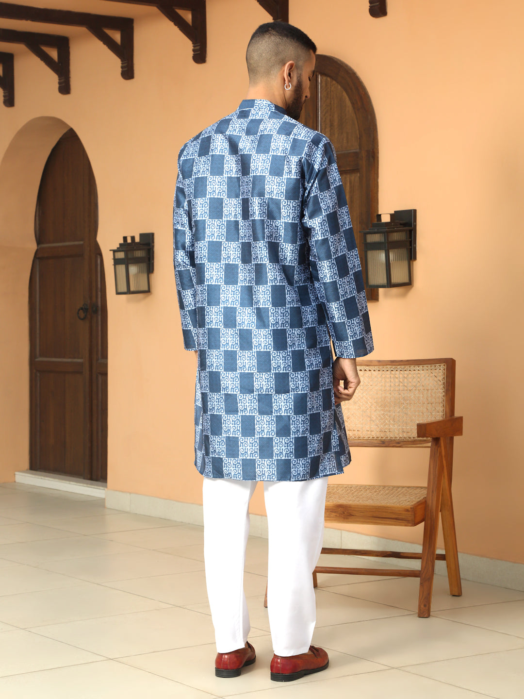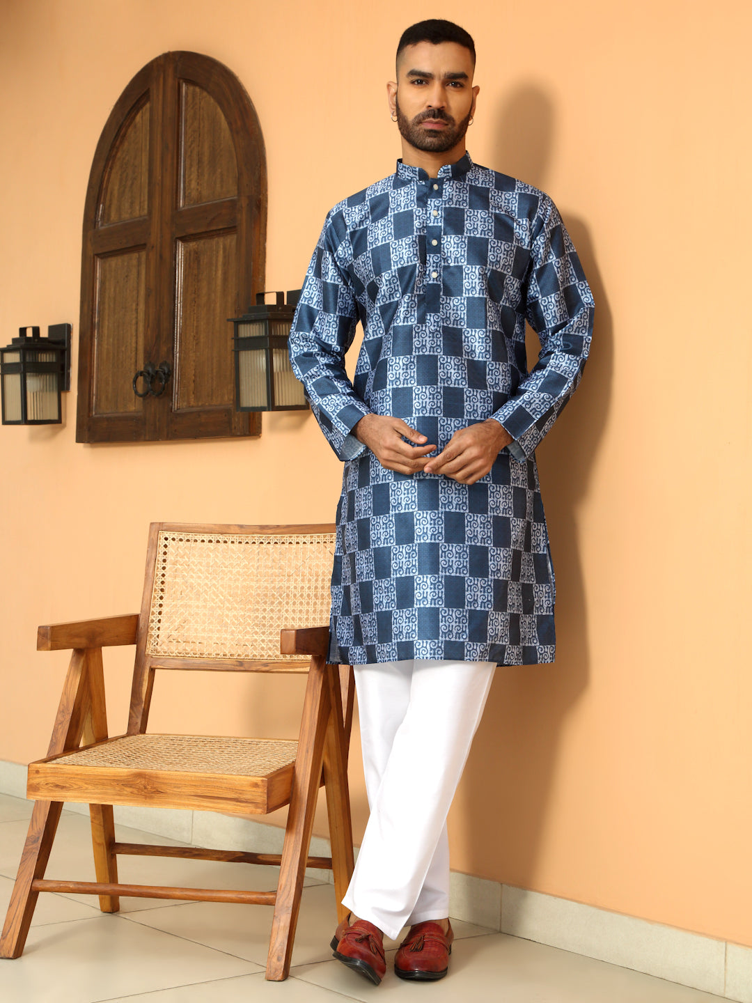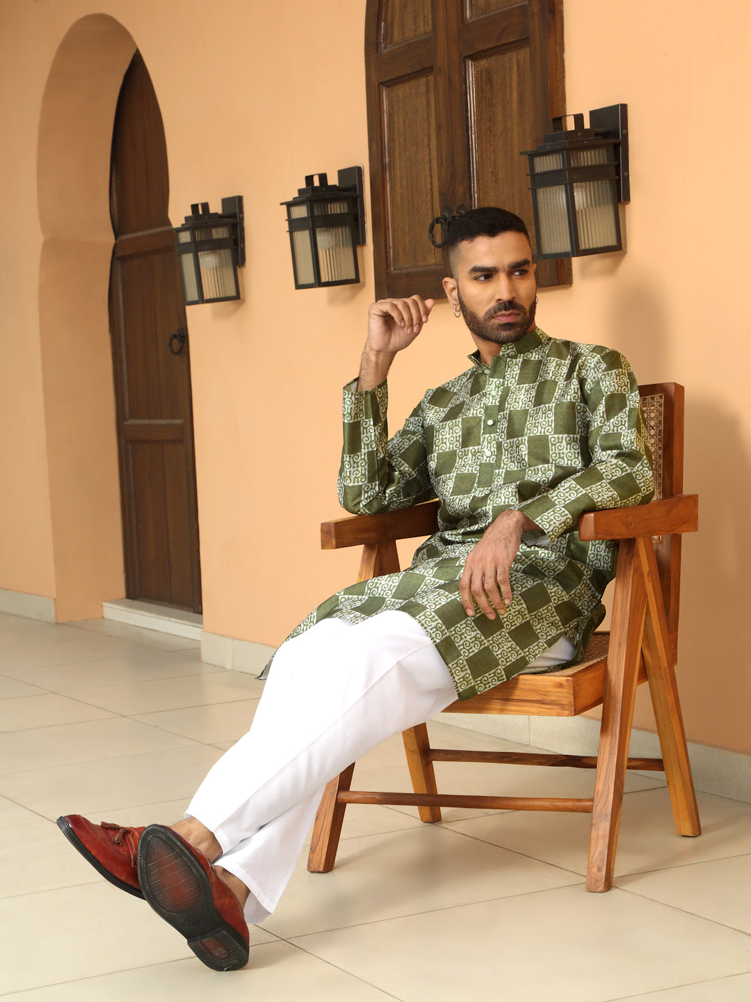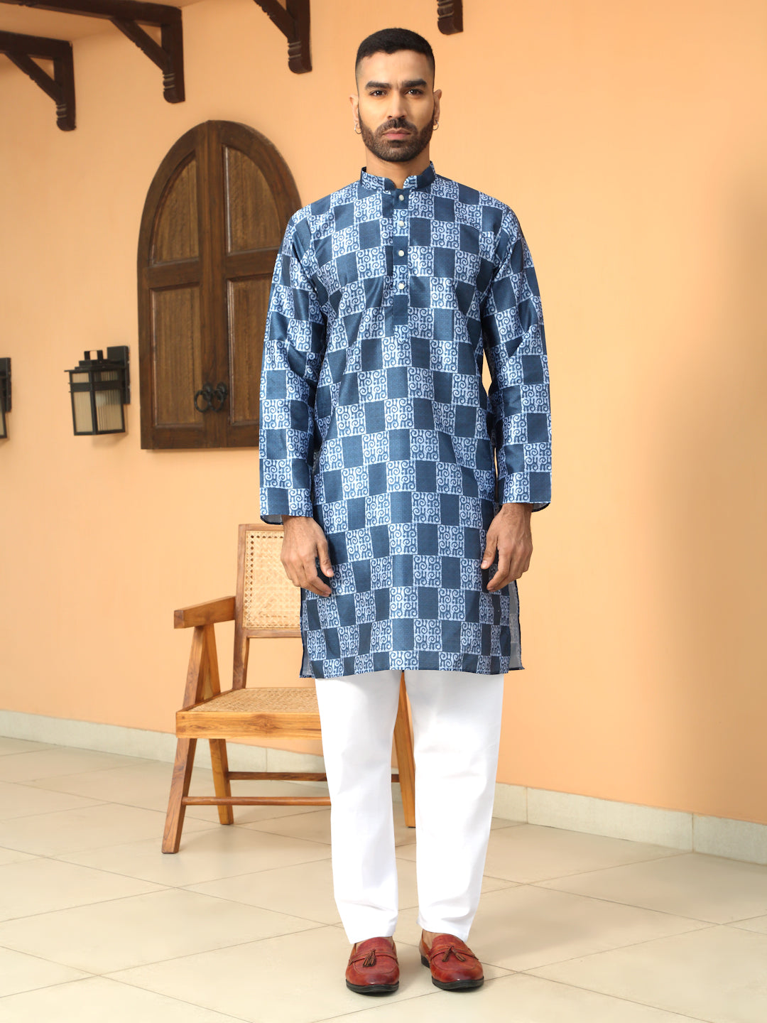 Silk Blend Batik Printed Kurta with white Elastic waistband Pyjama set