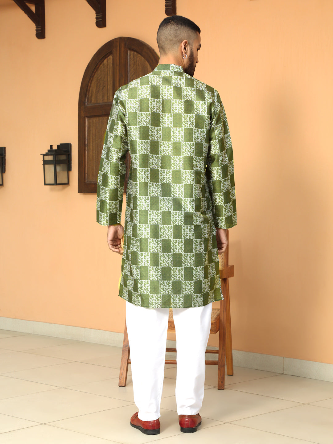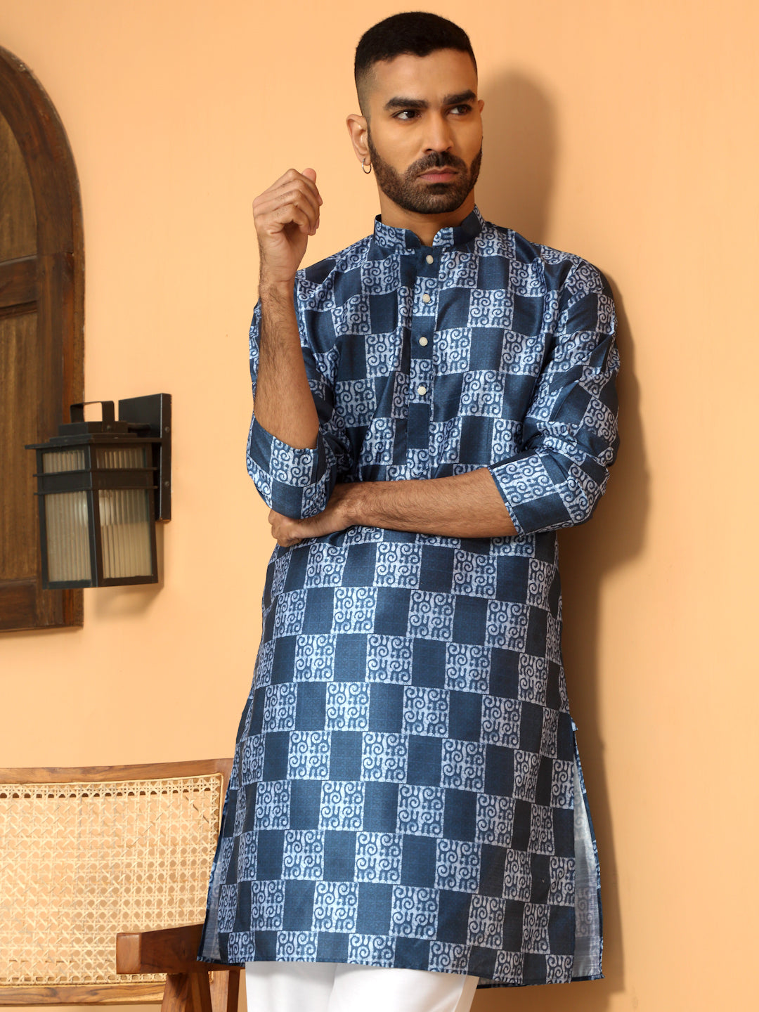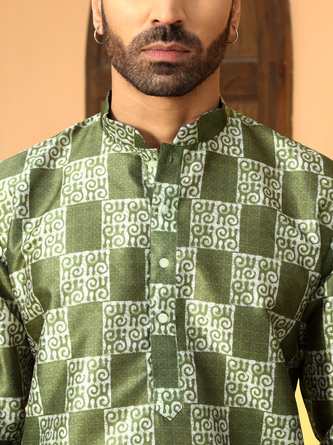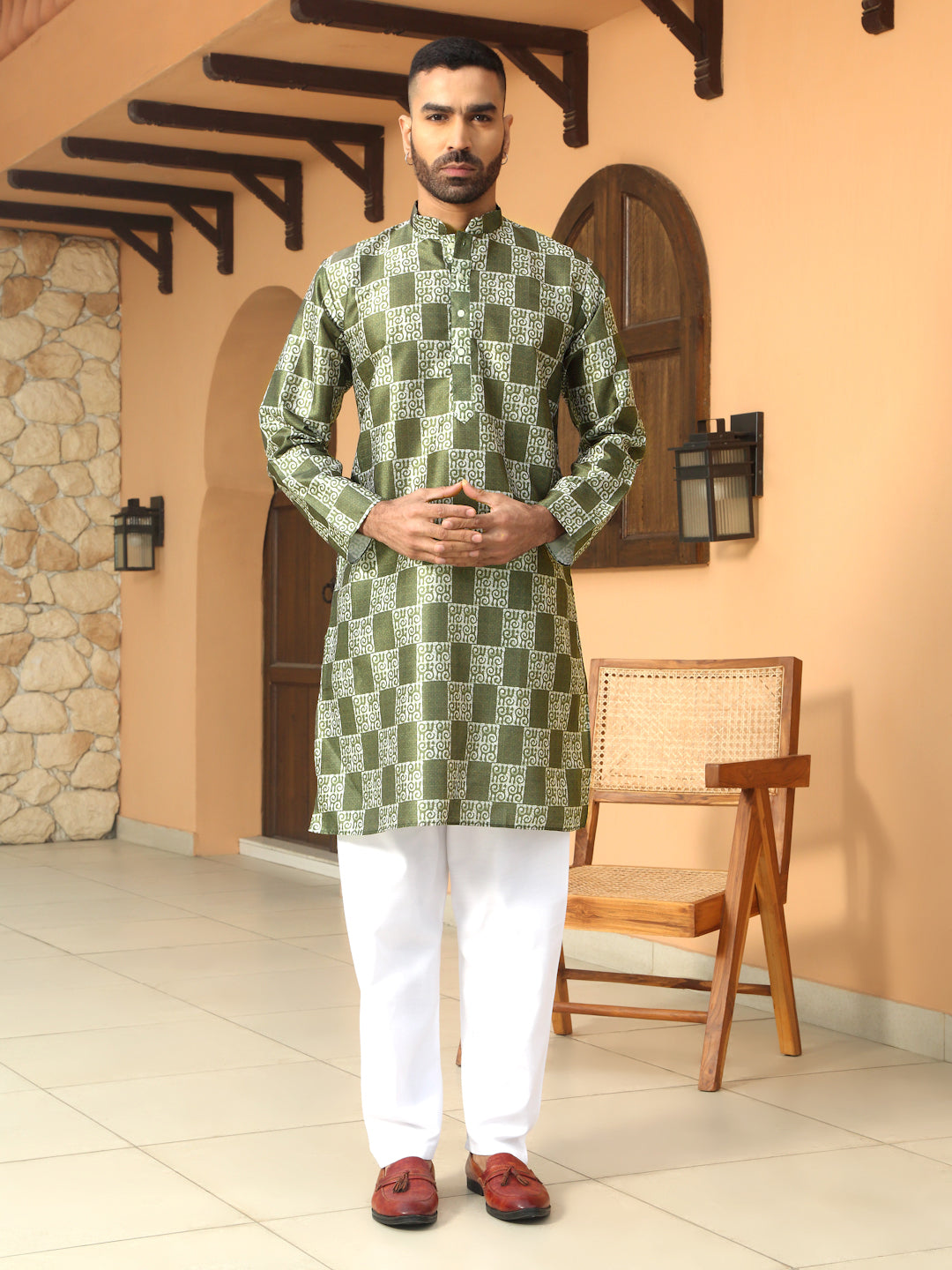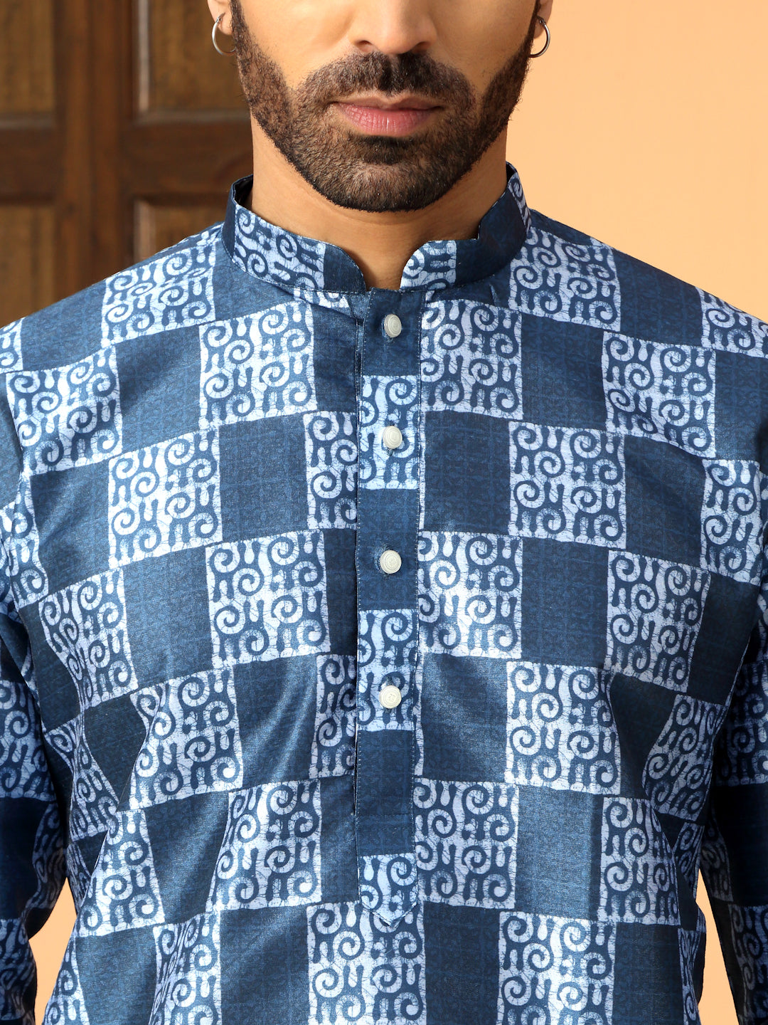 Silk Blend Batik Printed Kurta with white Elastic waistband Pyjama set