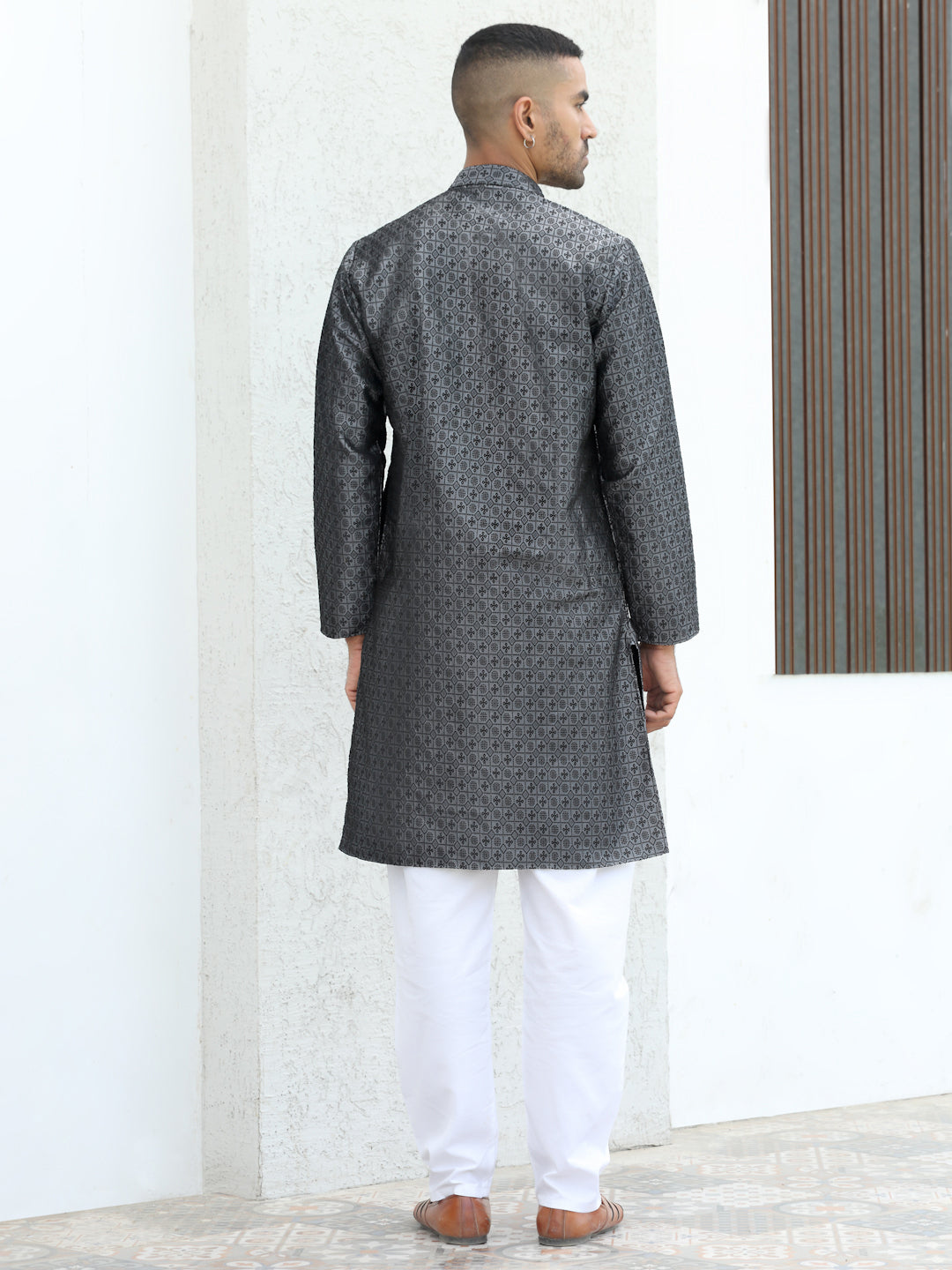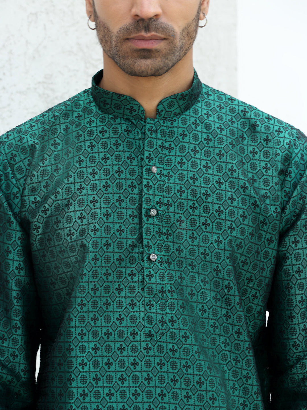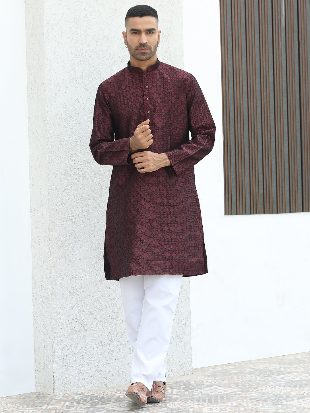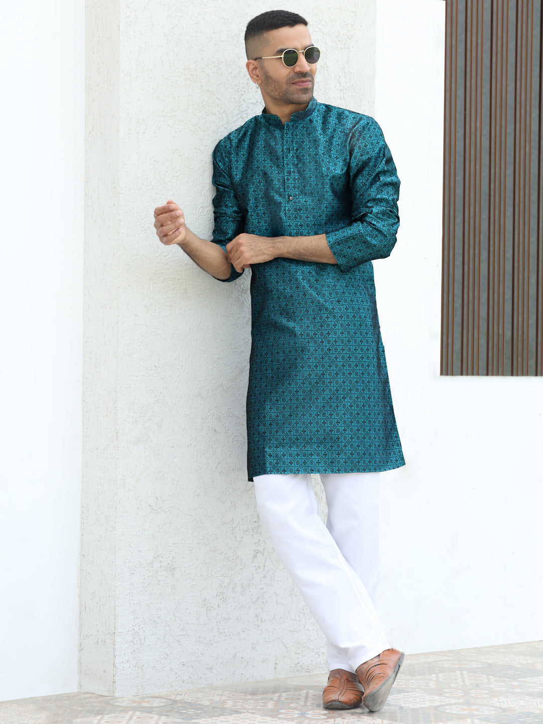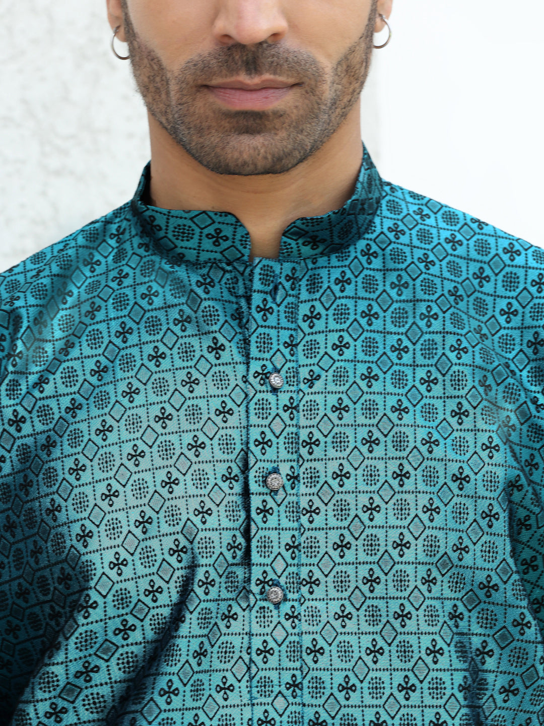 Elevate your ethnic style with this exquisite Men’s Silk Jacquard Self-Design Kurta Pyjama Set. Crafted from luxurious silk fabric, the kurta showcases intricate self-weaving patterns that exude royal elegance. Featuring a classic mandarin collar and refined silhouette, it blends tradition with sophistication. Paired with a soft, comfortable elastic waistband pyjama, this set is perfect for weddings, festive celebrations, and grand occasions.