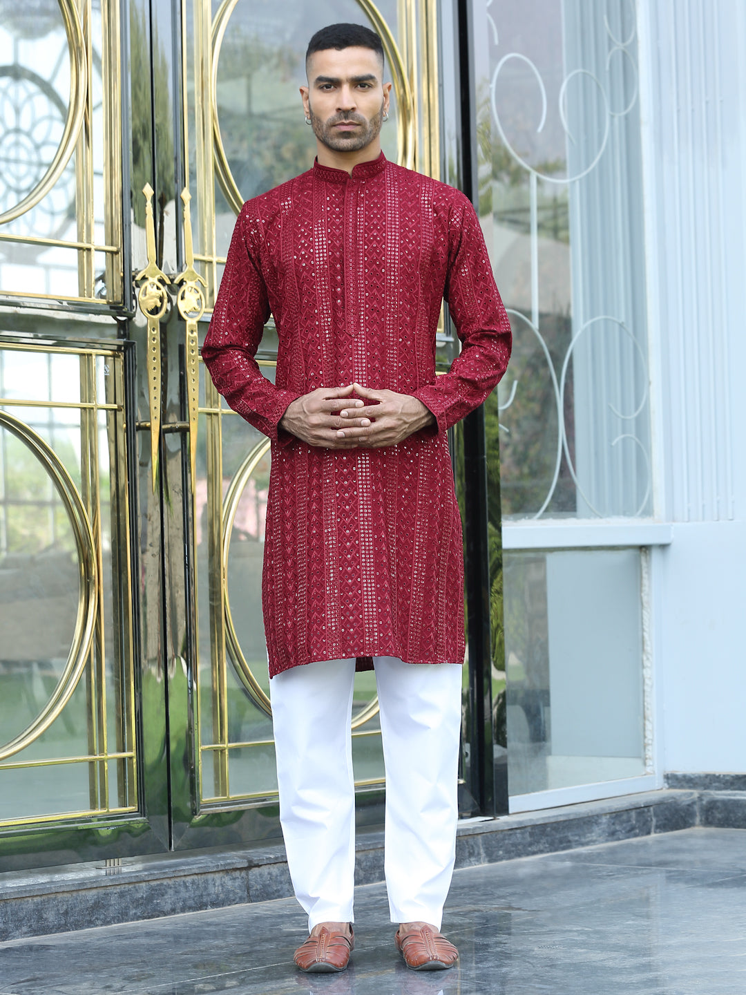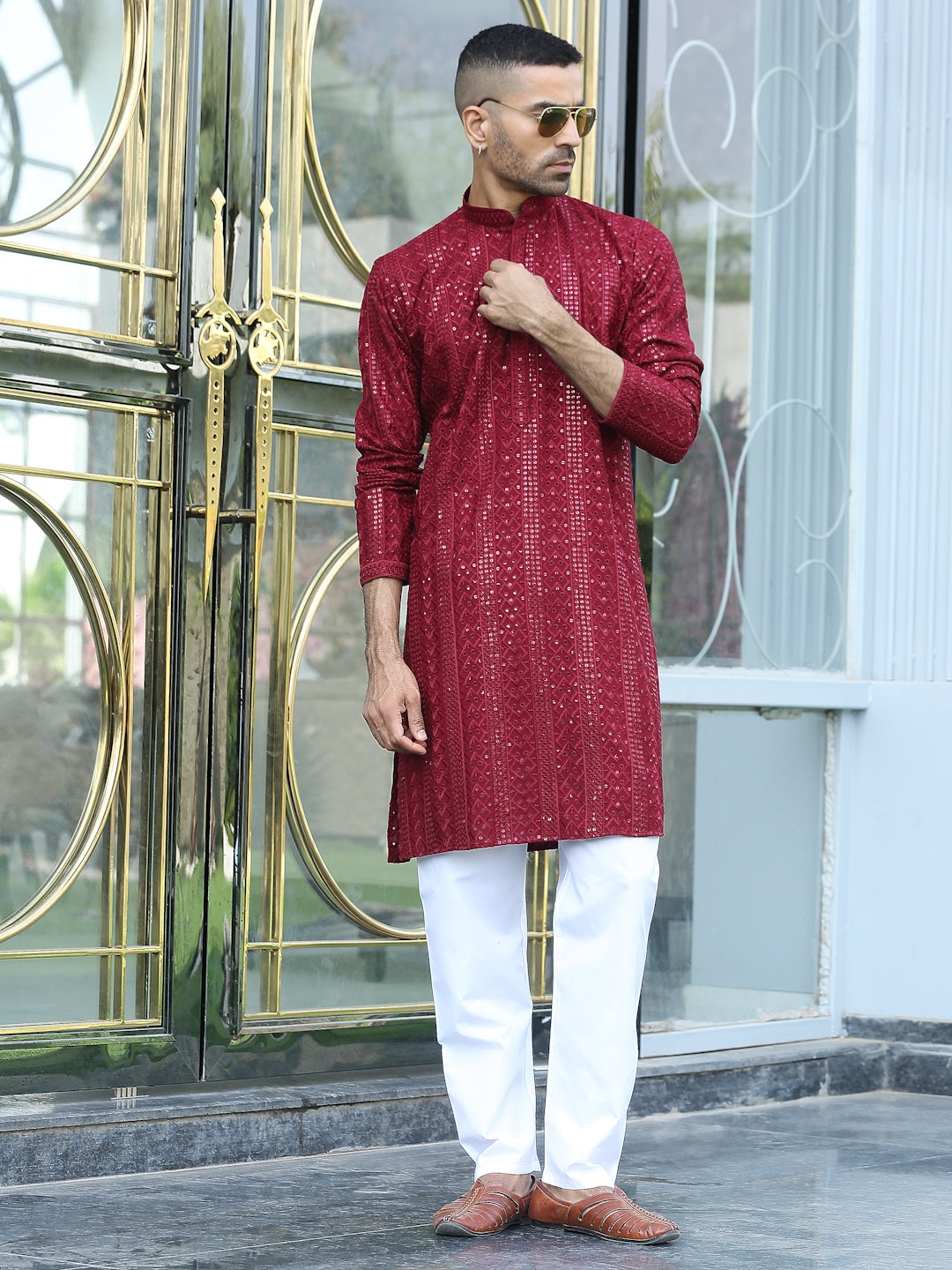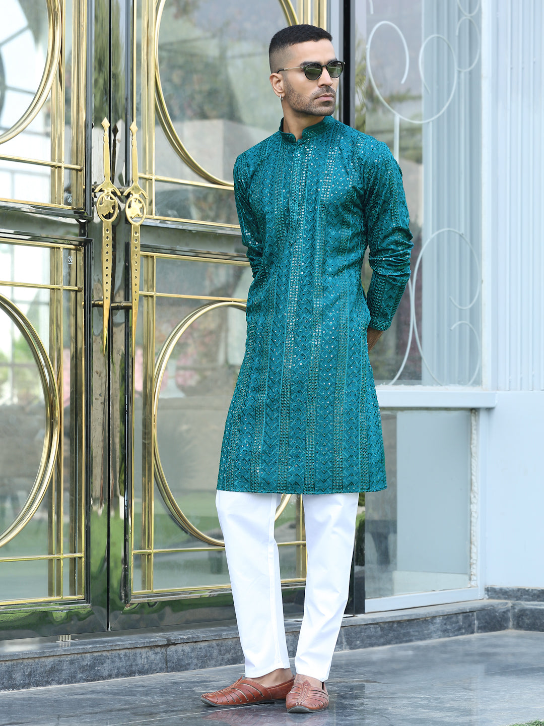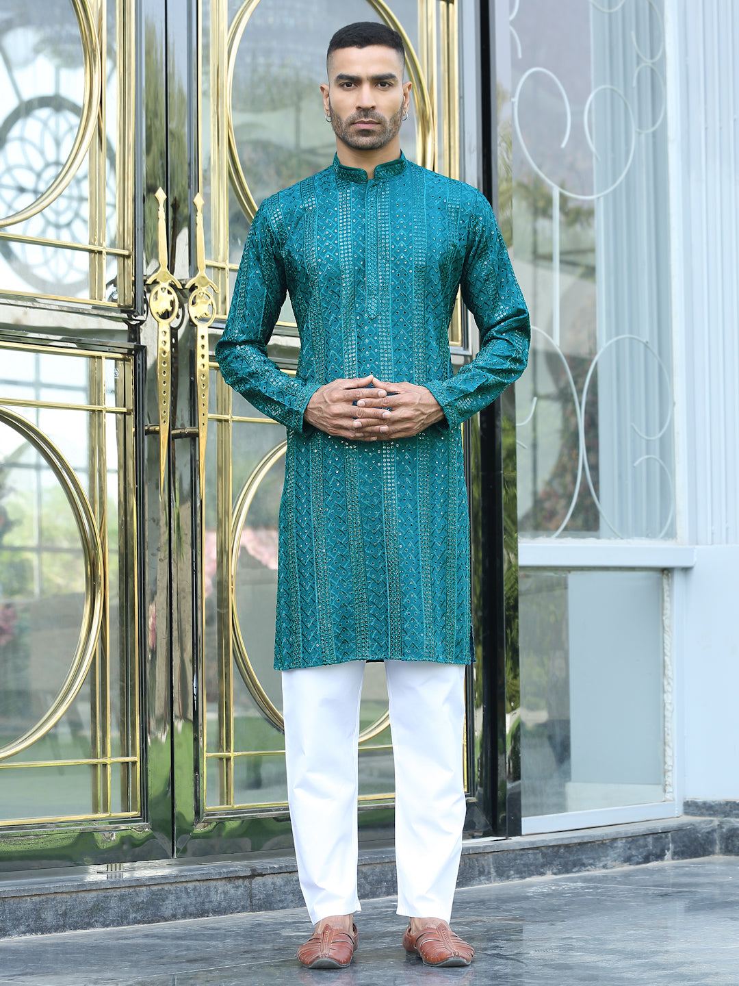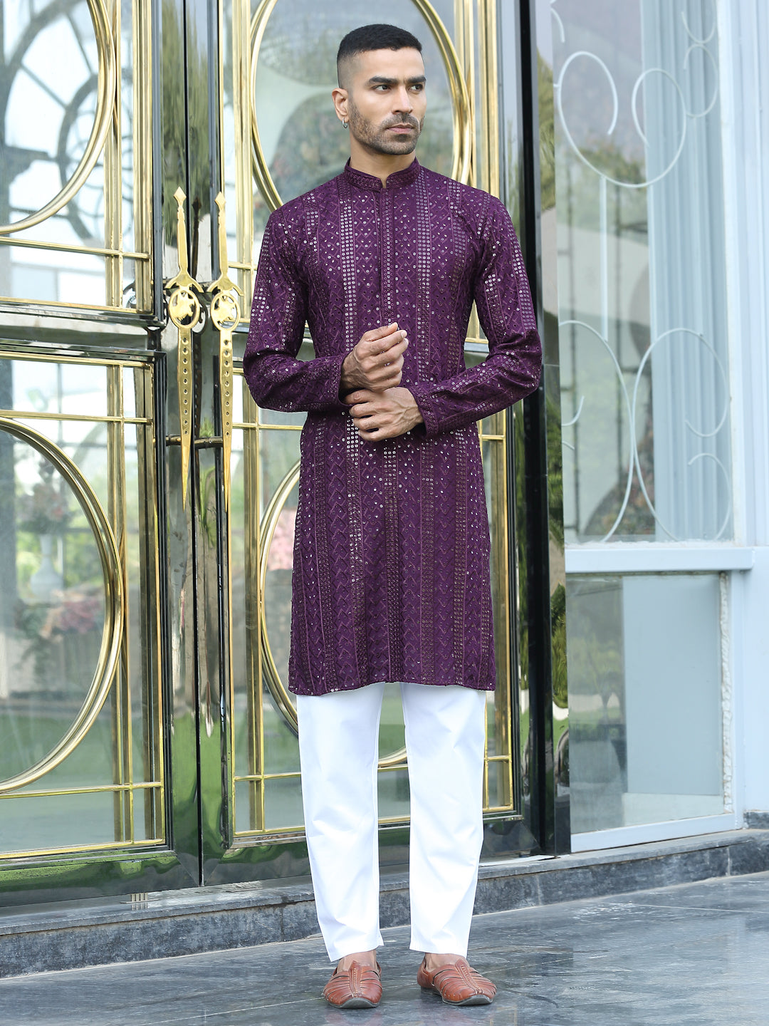 Elevate your festive and traditional wardrobe with this elegant Men's Silk Rayon Ethnic Motifs Embroidered Kurta with Elastic Waistband Pyjama Set. Crafted from a luxurious silk-rayon blend, this kurta set features exquisite ethnic motif embroidery and delicate sequin detailing on the yoke for a refined, eye-catching appeal. The Mandarin collar adds a touch of contemporary sophistication, while the full sleeves and straight hem offer a classic ethnic silhouette.