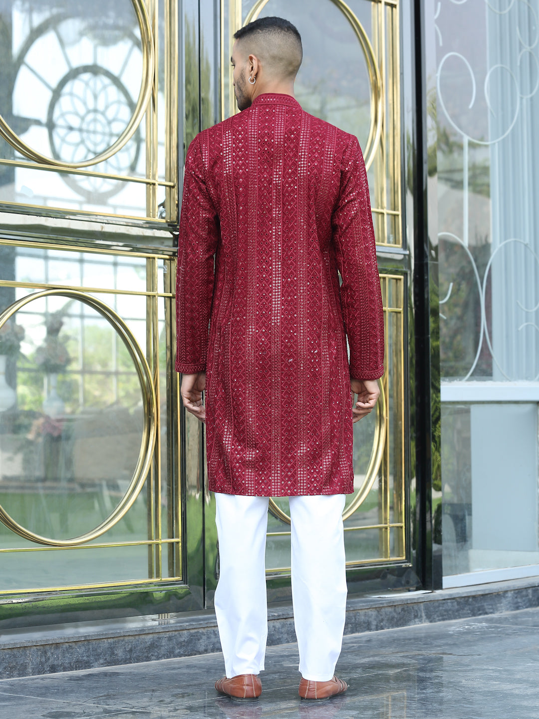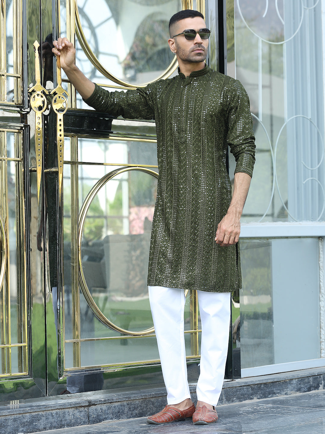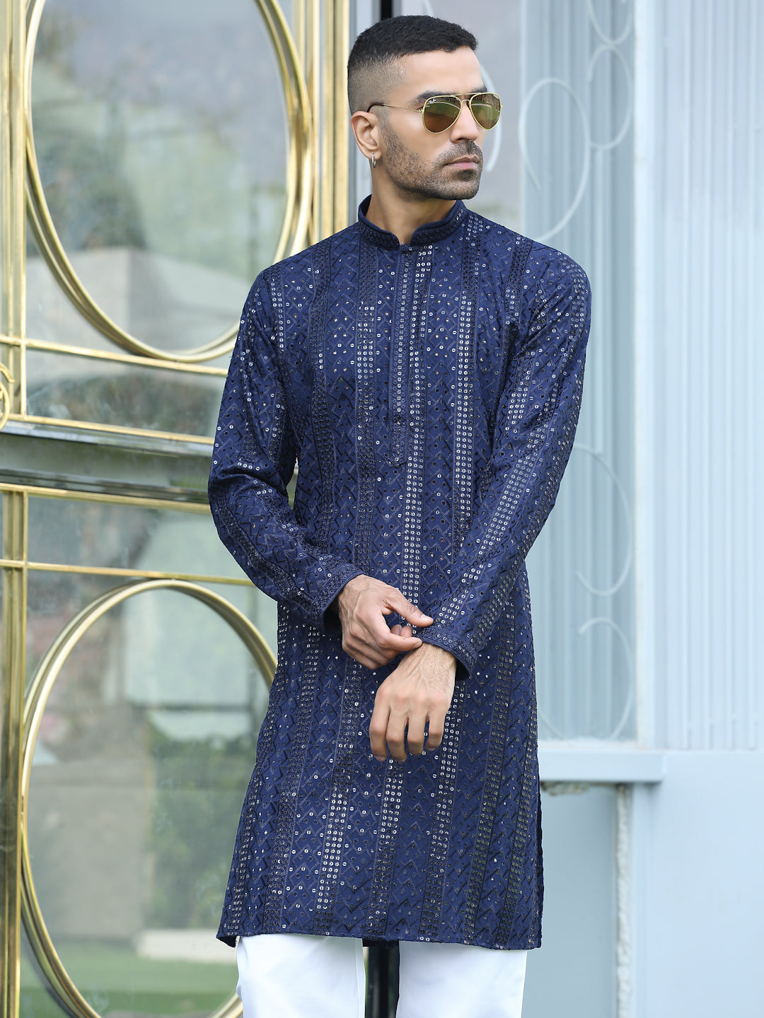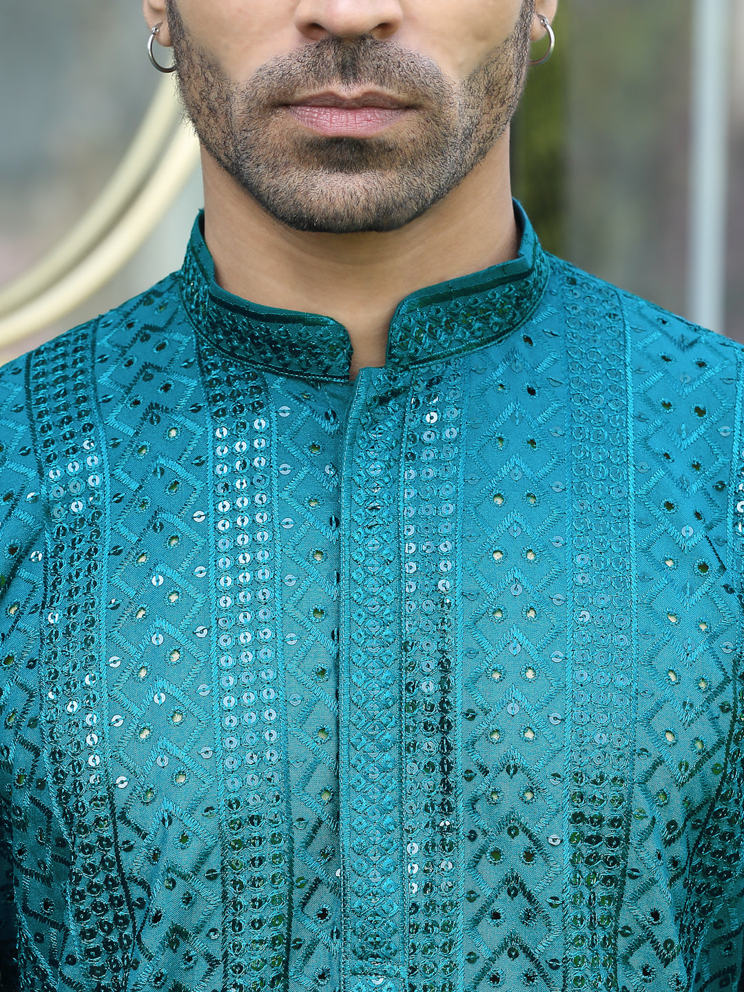 Elevate your festive and traditional wardrobe with this elegant Men's Silk Rayon Ethnic Motifs Embroidered Kurta with Elastic Waistband Pyjama Set. Crafted from a luxurious silk-rayon blend, this kurta set features exquisite ethnic motif embroidery and delicate sequin detailing on the yoke for a refined, eye-catching appeal. The Mandarin collar adds a touch of contemporary sophistication, while the full sleeves and straight hem offer a classic ethnic silhouette.