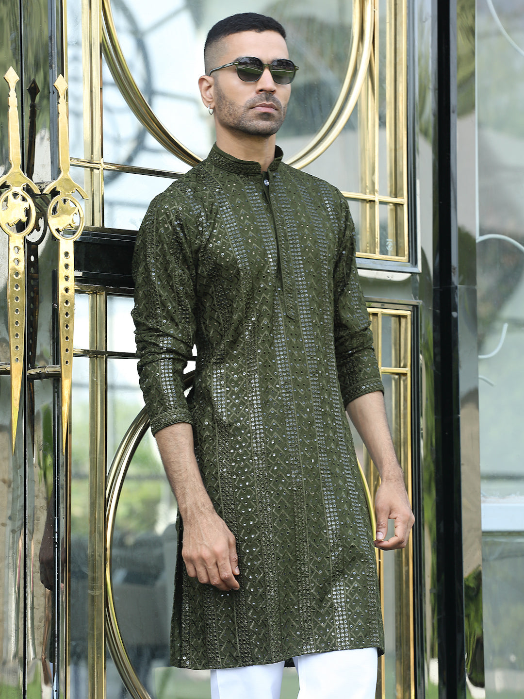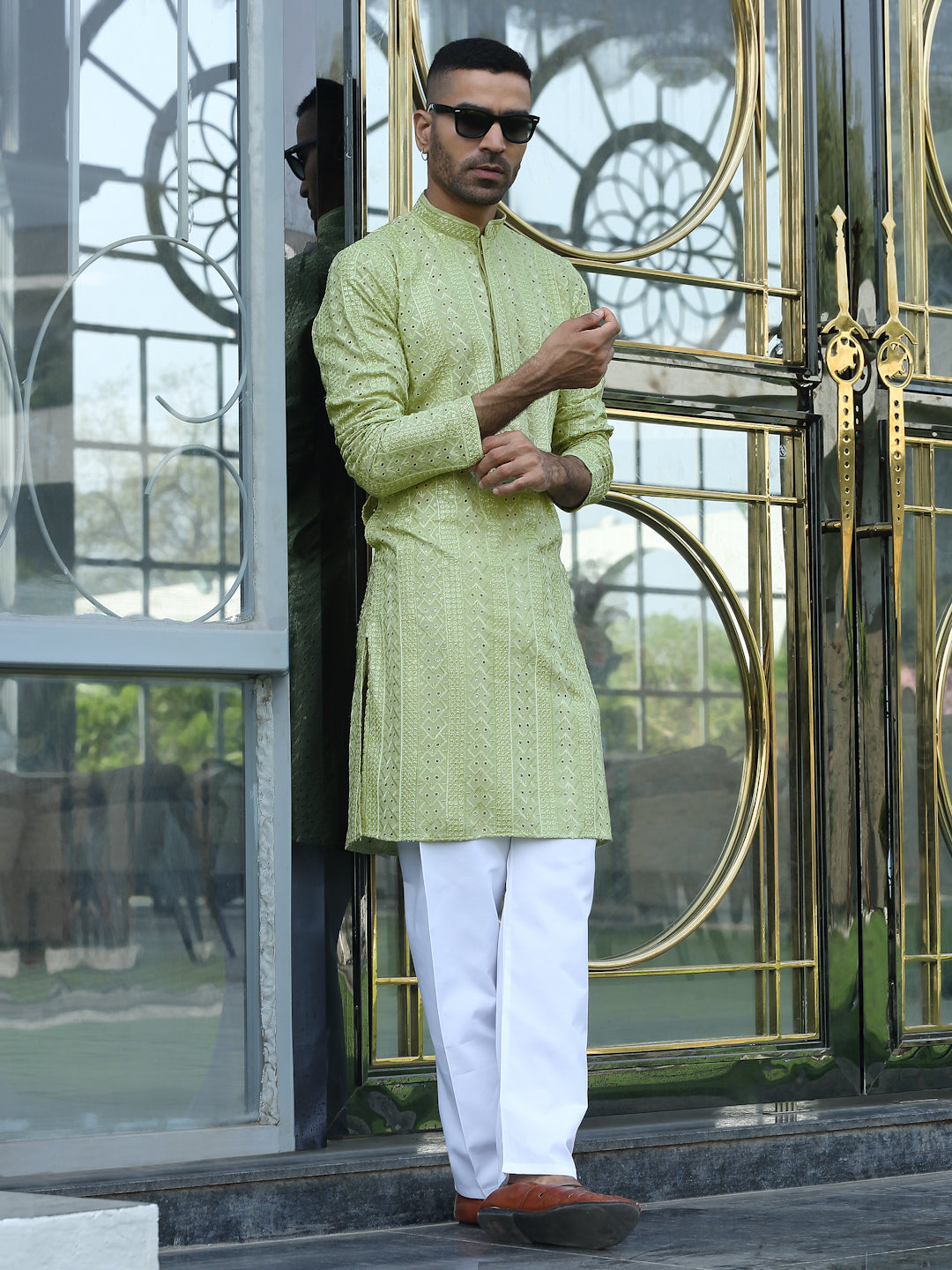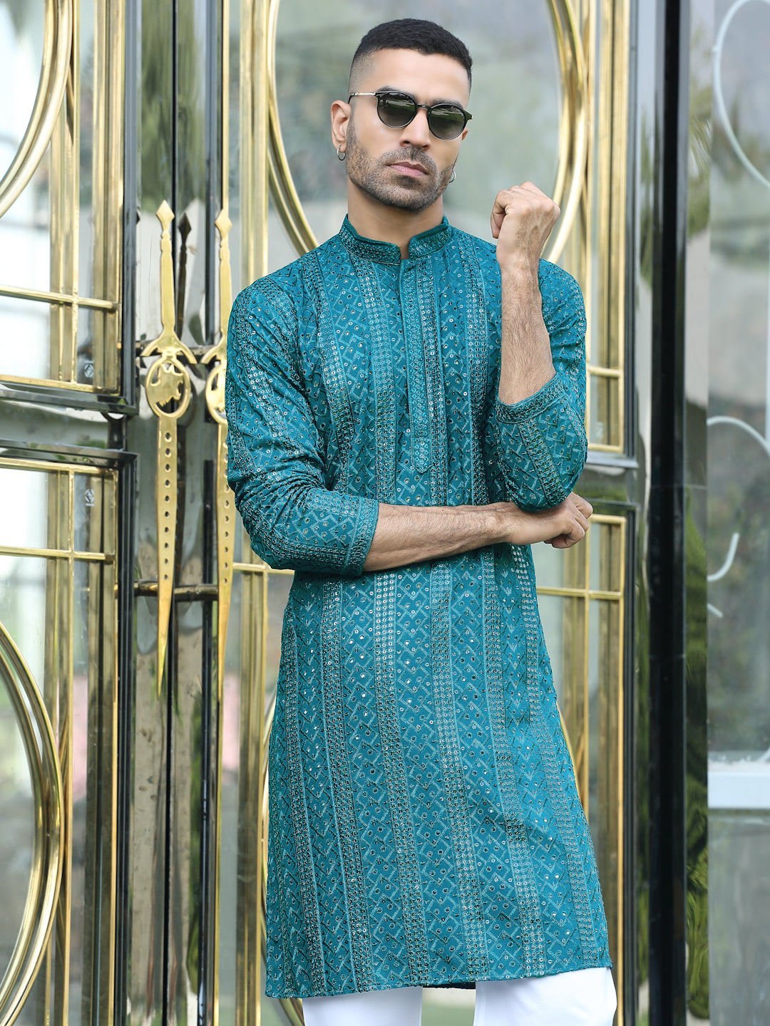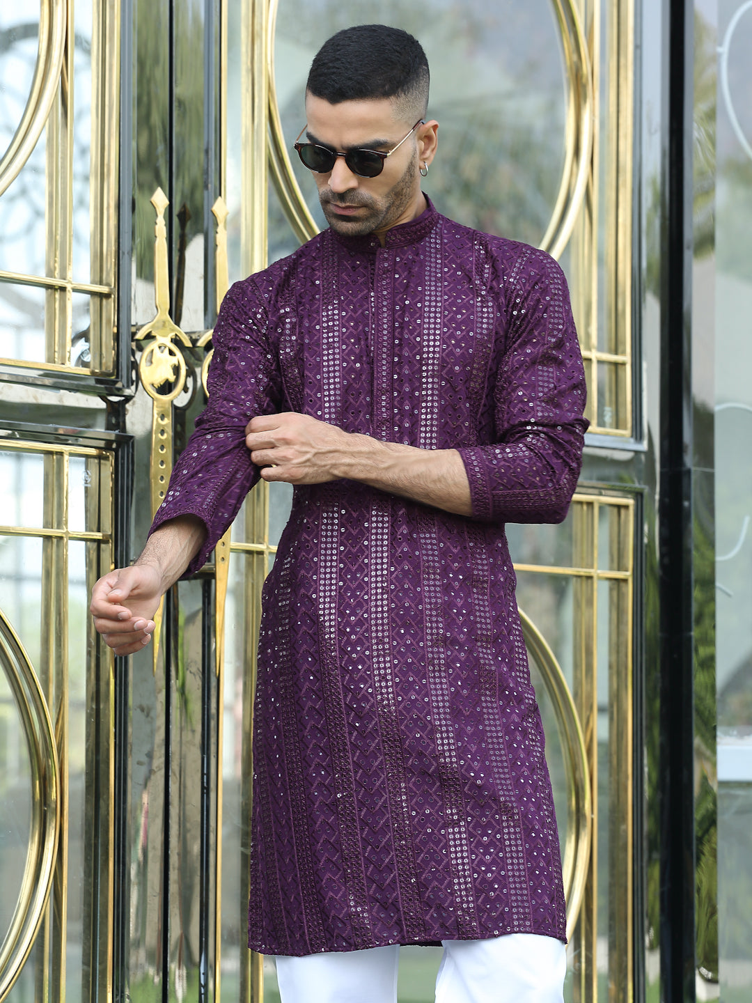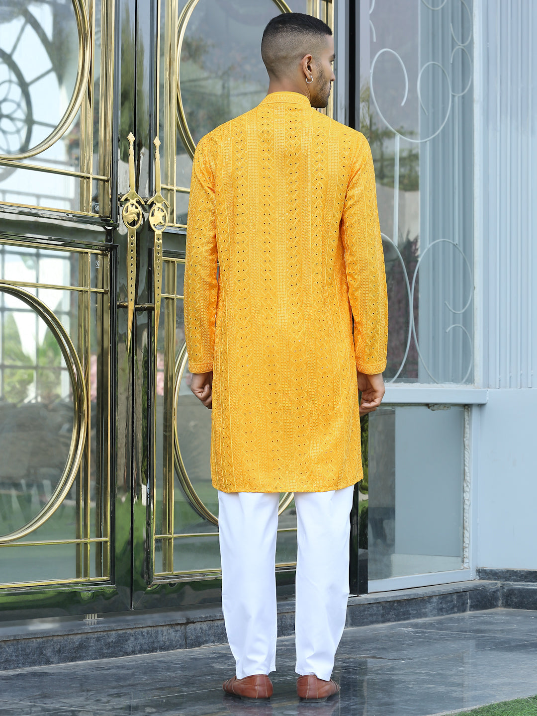 Elevate your festive and traditional wardrobe with this elegant Men's Silk Rayon Ethnic Motifs Embroidered Kurta with Elastic Waistband Pyjama Set. Crafted from a luxurious silk-rayon blend, this kurta set features exquisite ethnic motif embroidery and delicate sequin detailing on the yoke for a refined, eye-catching appeal. The Mandarin collar adds a touch of contemporary sophistication, while the full sleeves and straight hem offer a classic ethnic silhouette.