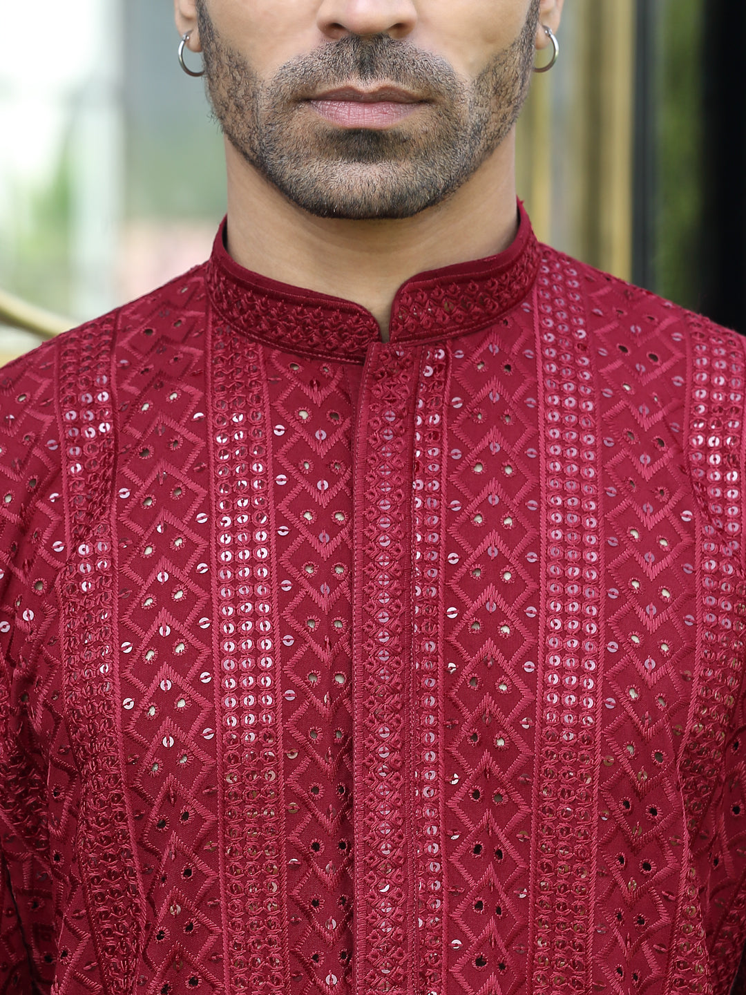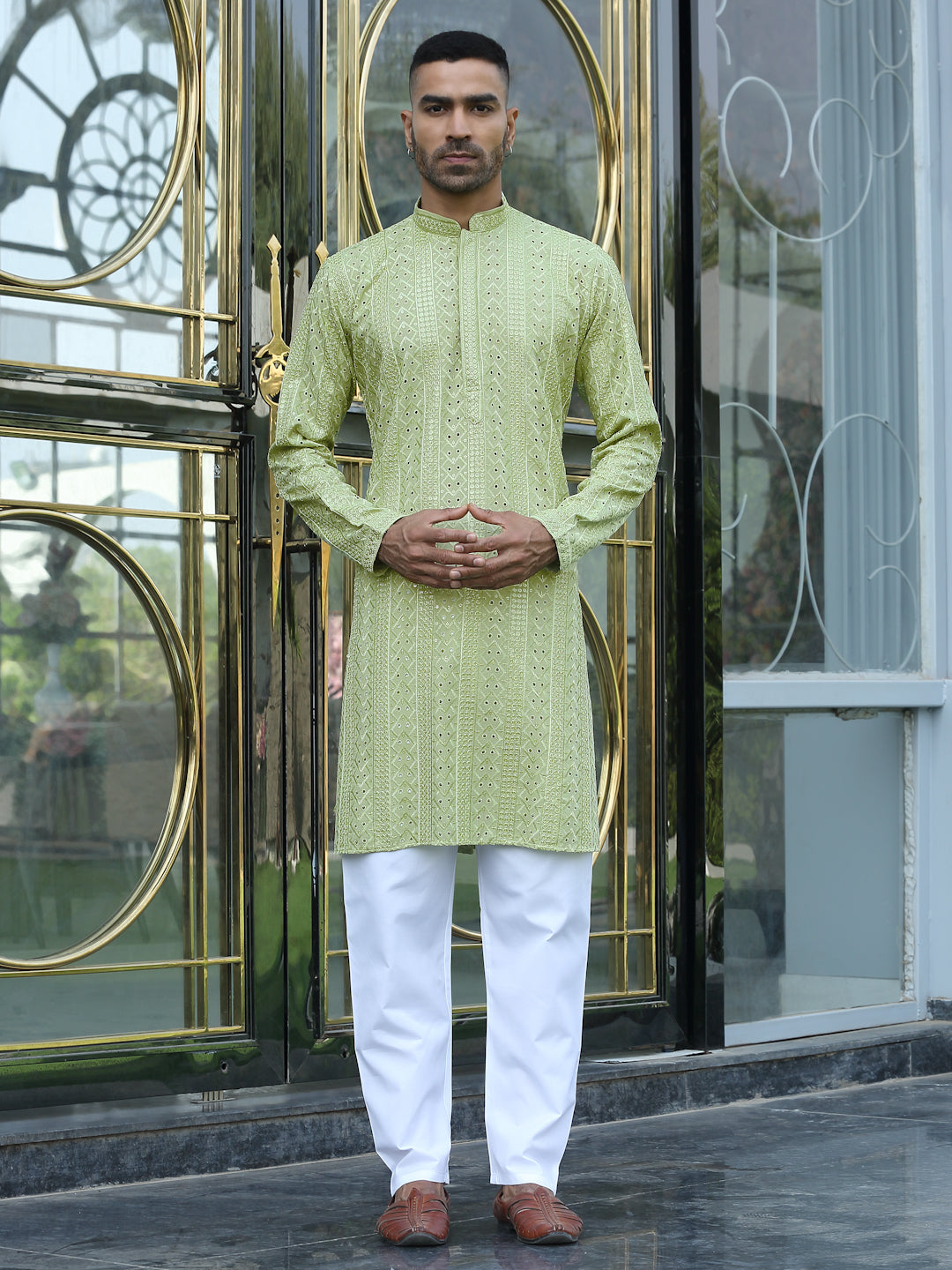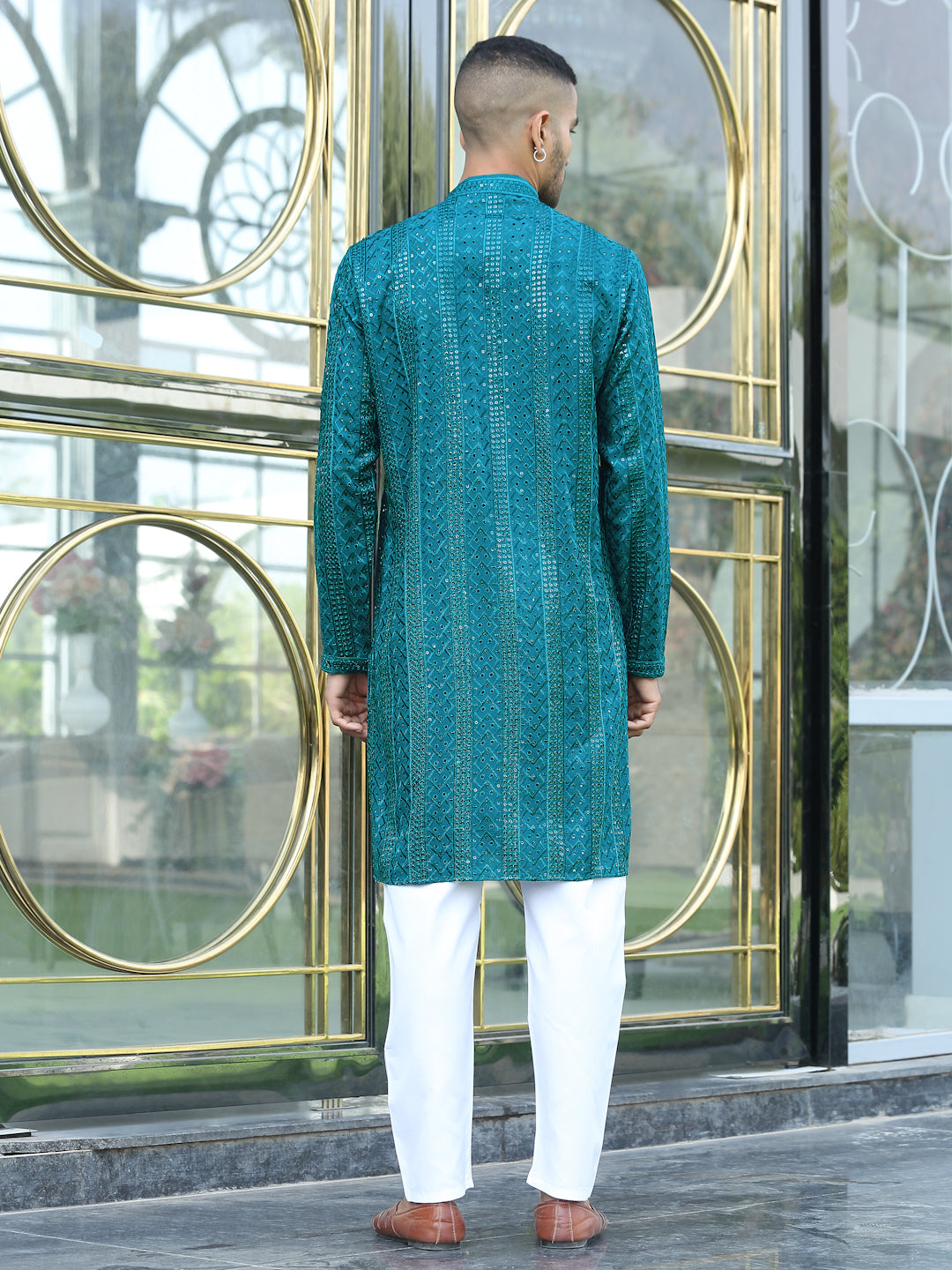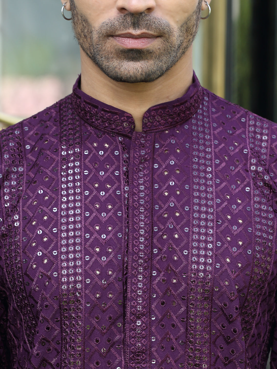 Elevate your festive and traditional wardrobe with this elegant Men's Silk Rayon Ethnic Motifs Embroidered Kurta with Elastic Waistband Pyjama Set. Crafted from a luxurious silk-rayon blend, this kurta set features exquisite ethnic motif embroidery and delicate sequin detailing on the yoke for a refined, eye-catching appeal. The Mandarin collar adds a touch of contemporary sophistication, while the full sleeves and straight hem offer a classic ethnic silhouette.