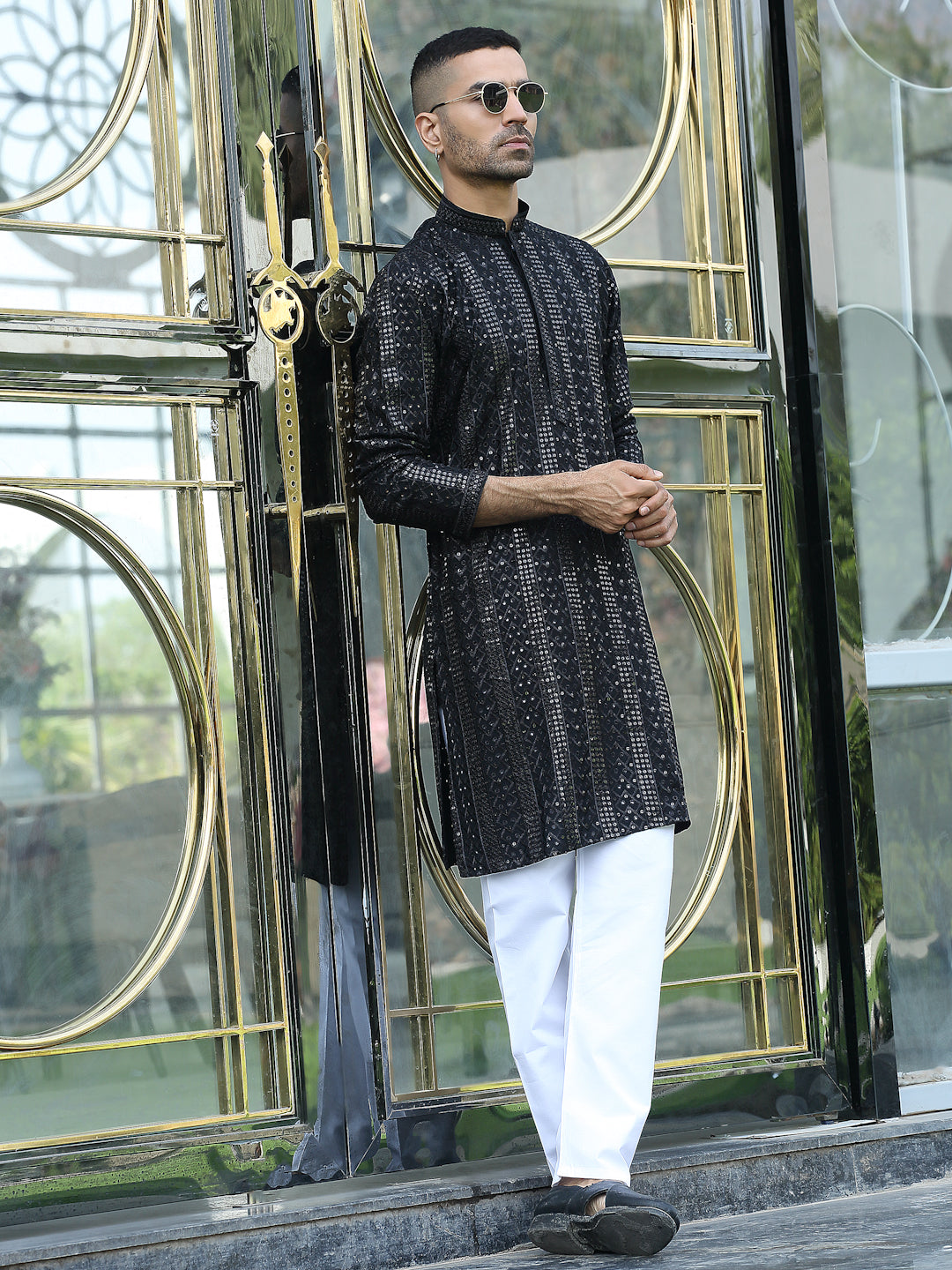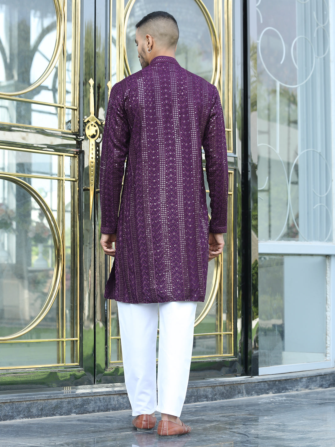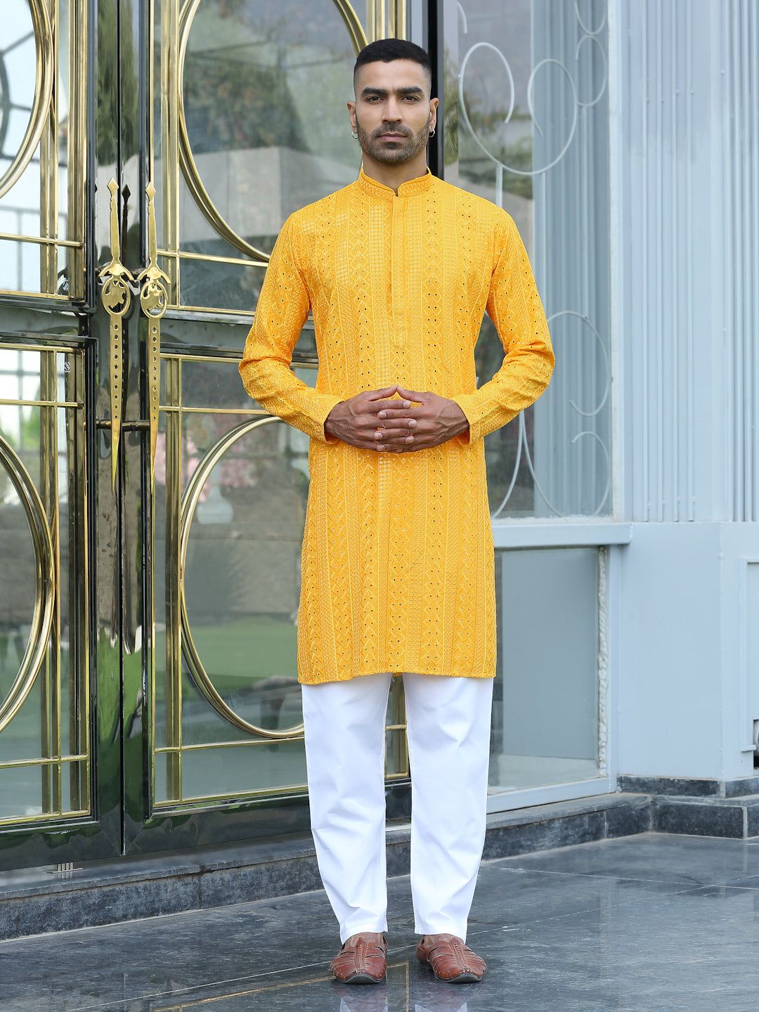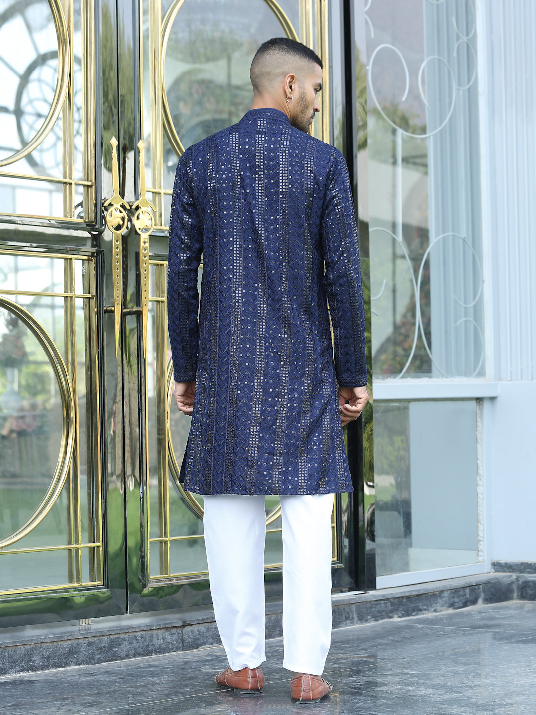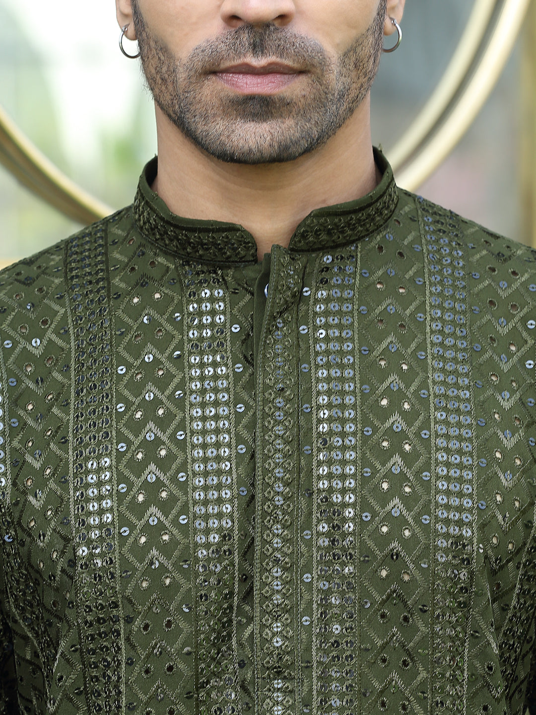 Elevate your festive and traditional wardrobe with this elegant Men's Silk Rayon Ethnic Motifs Embroidered Kurta with Elastic Waistband Pyjama Set. Crafted from a luxurious silk-rayon blend, this kurta set features exquisite ethnic motif embroidery and delicate sequin detailing on the yoke for a refined, eye-catching appeal. The Mandarin collar adds a touch of contemporary sophistication, while the full sleeves and straight hem offer a classic ethnic silhouette.