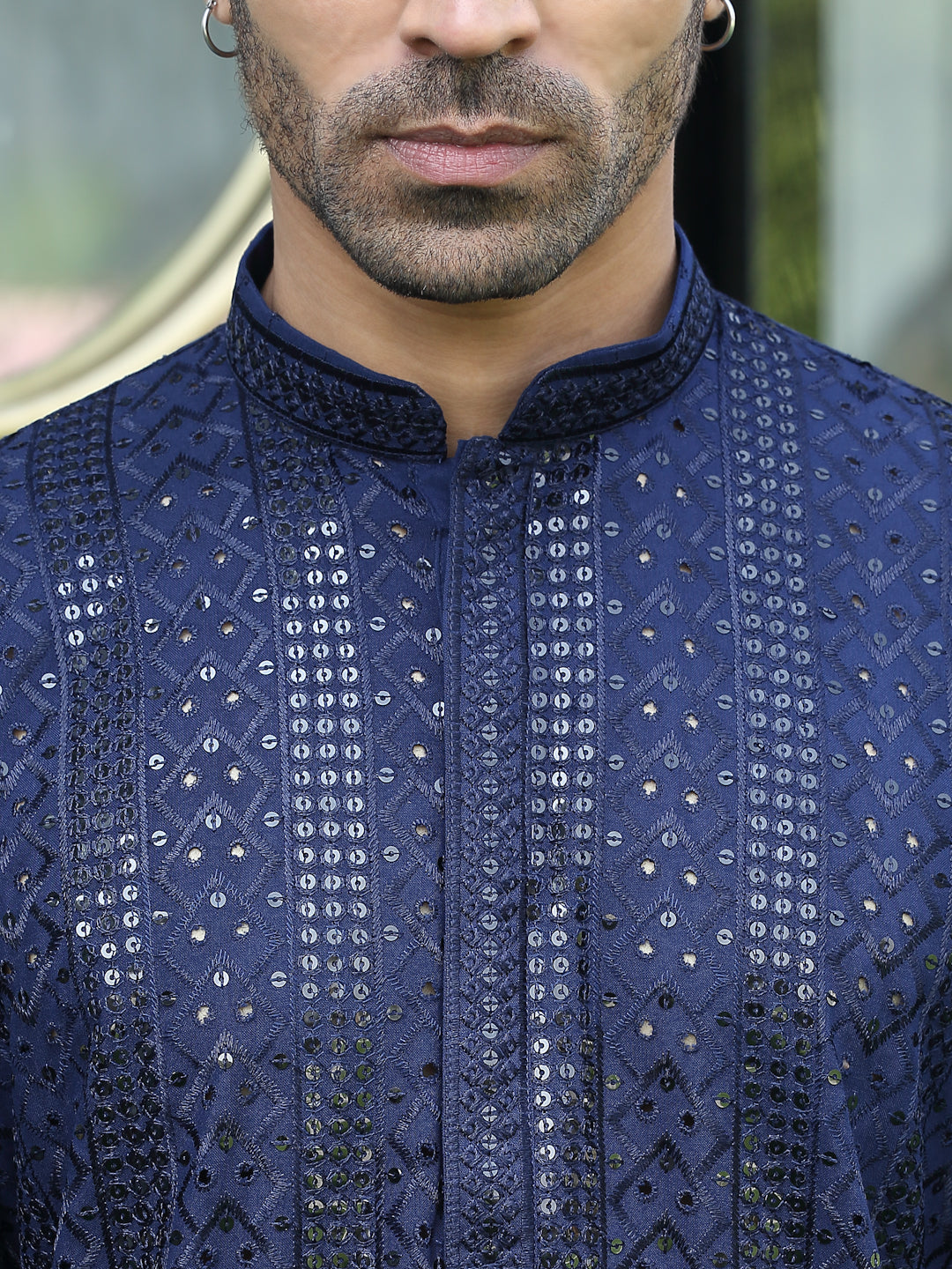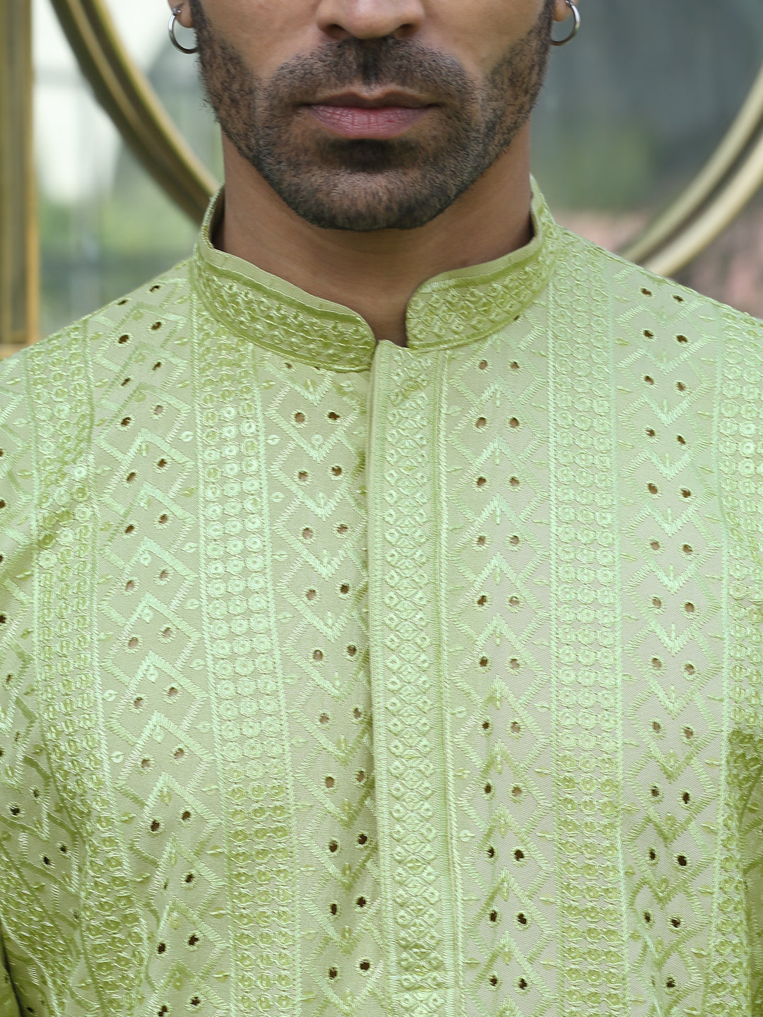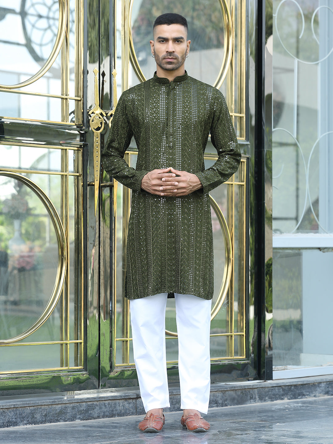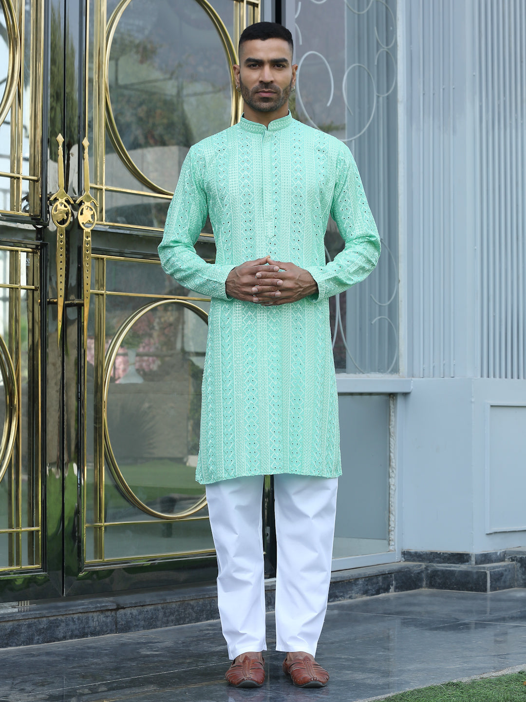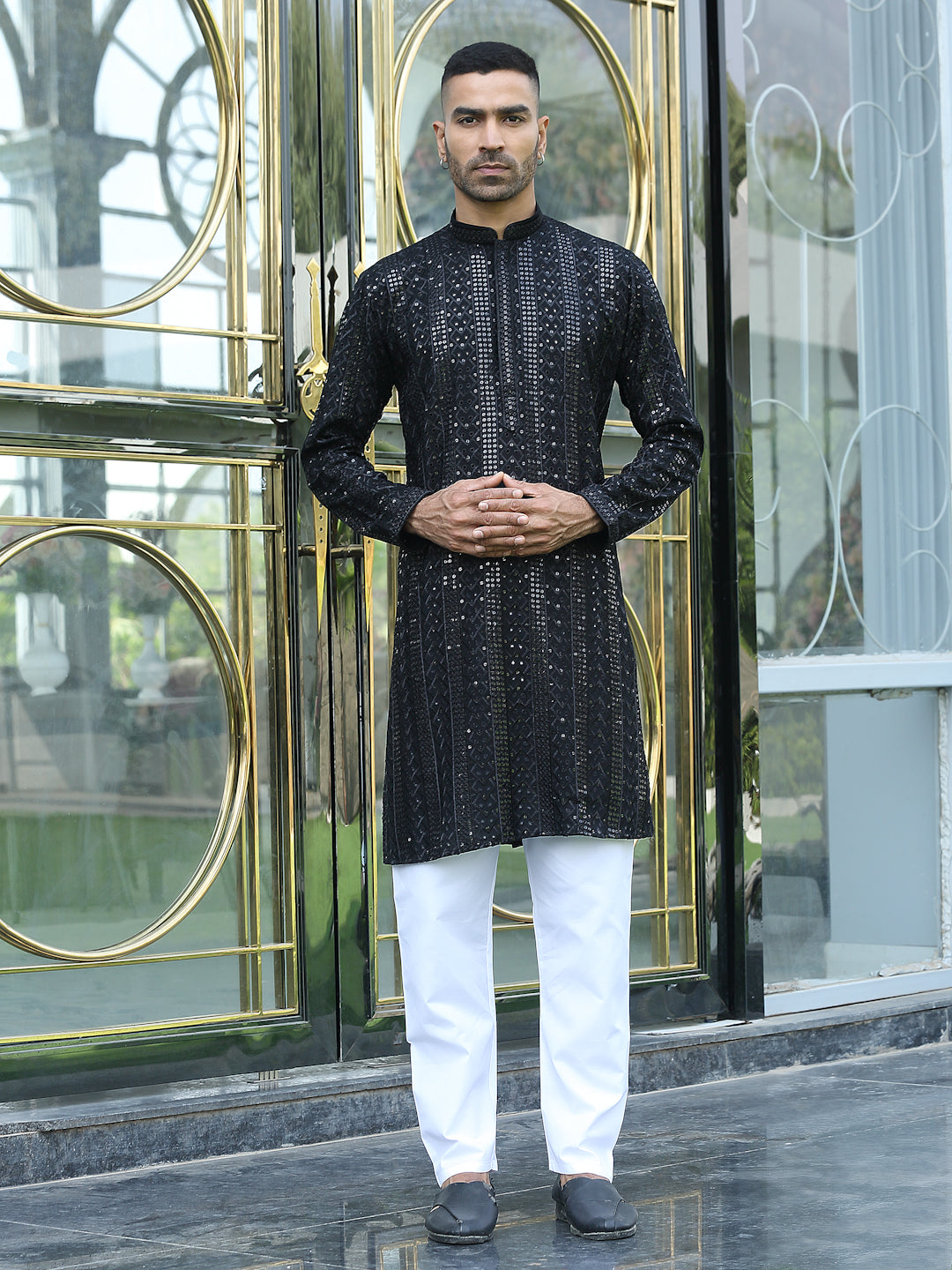 Elevate your festive and traditional wardrobe with this elegant Men's Silk Rayon Ethnic Motifs Embroidered Kurta with Elastic Waistband Pyjama Set. Crafted from a luxurious silk-rayon blend, this kurta set features exquisite ethnic motif embroidery and delicate sequin detailing on the yoke for a refined, eye-catching appeal. The Mandarin collar adds a touch of contemporary sophistication, while the full sleeves and straight hem offer a classic ethnic silhouette.