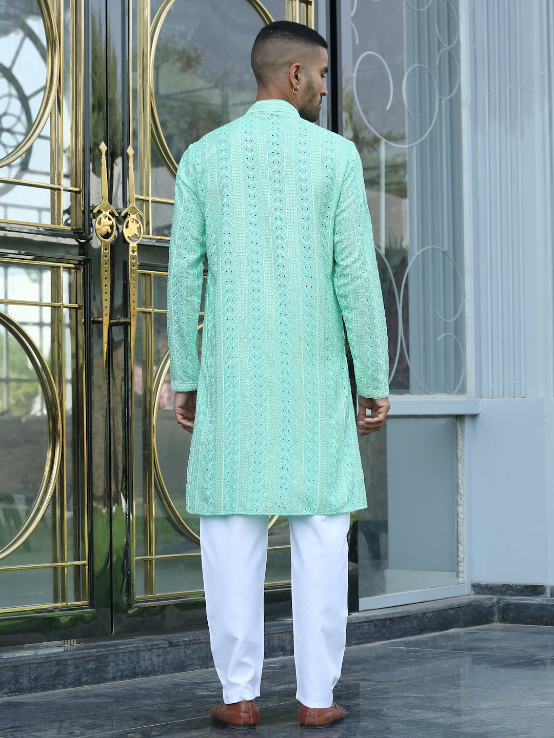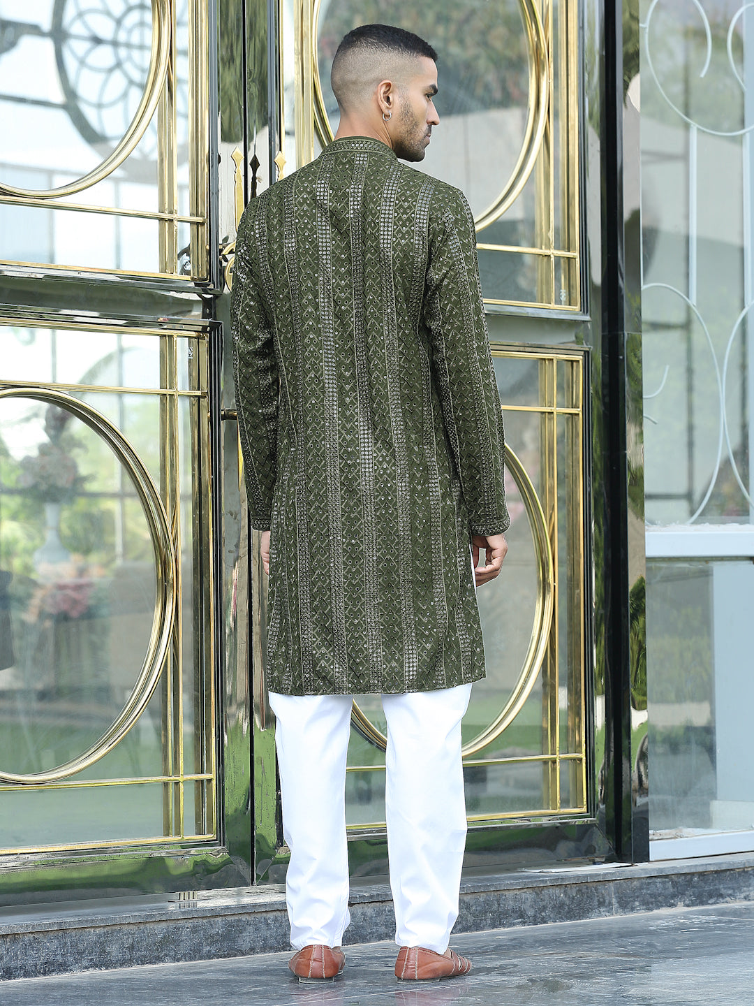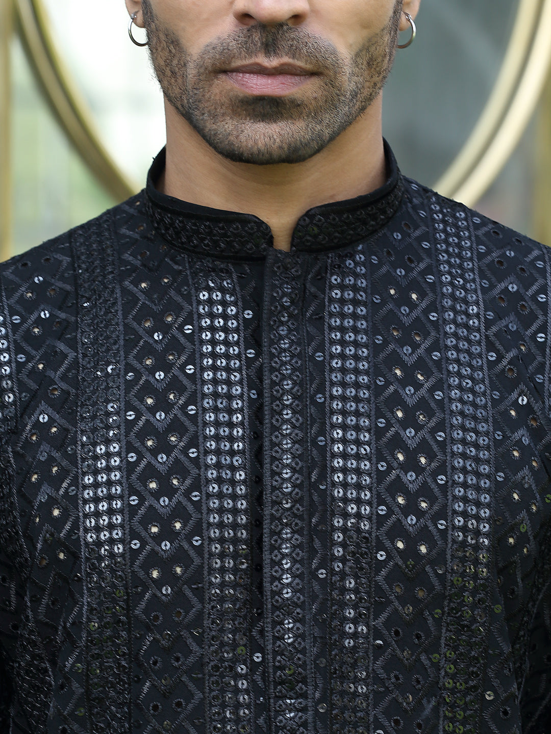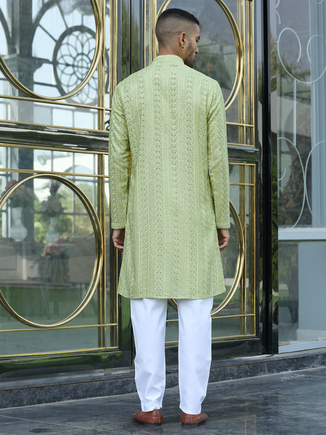 Elevate your festive and traditional wardrobe with this elegant Men's Silk Rayon Ethnic Motifs Embroidered Kurta with Elastic Waistband Pyjama Set. Crafted from a luxurious silk-rayon blend, this kurta set features exquisite ethnic motif embroidery and delicate sequin detailing on the yoke for a refined, eye-catching appeal. The Mandarin collar adds a touch of contemporary sophistication, while the full sleeves and straight hem offer a classic ethnic silhouette.