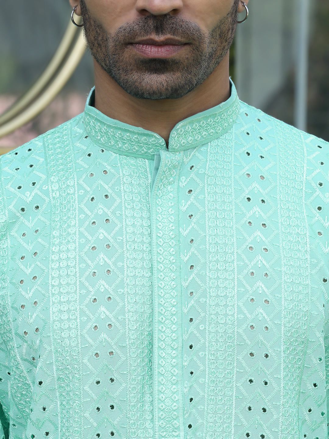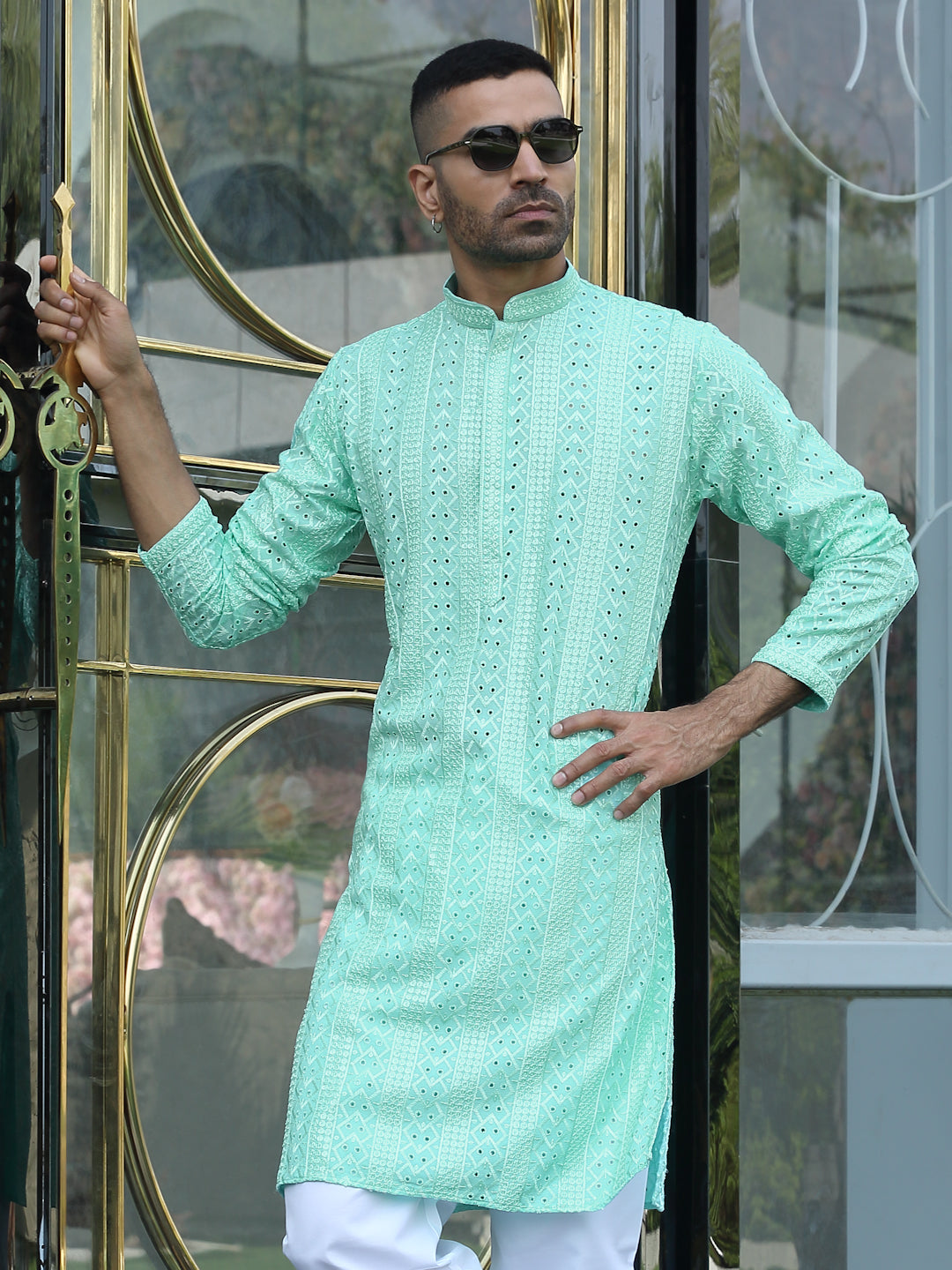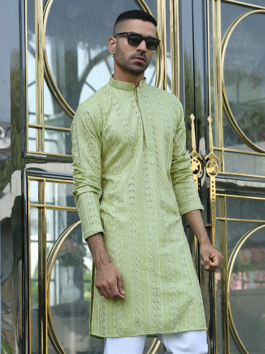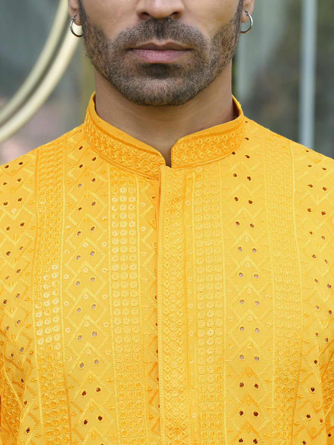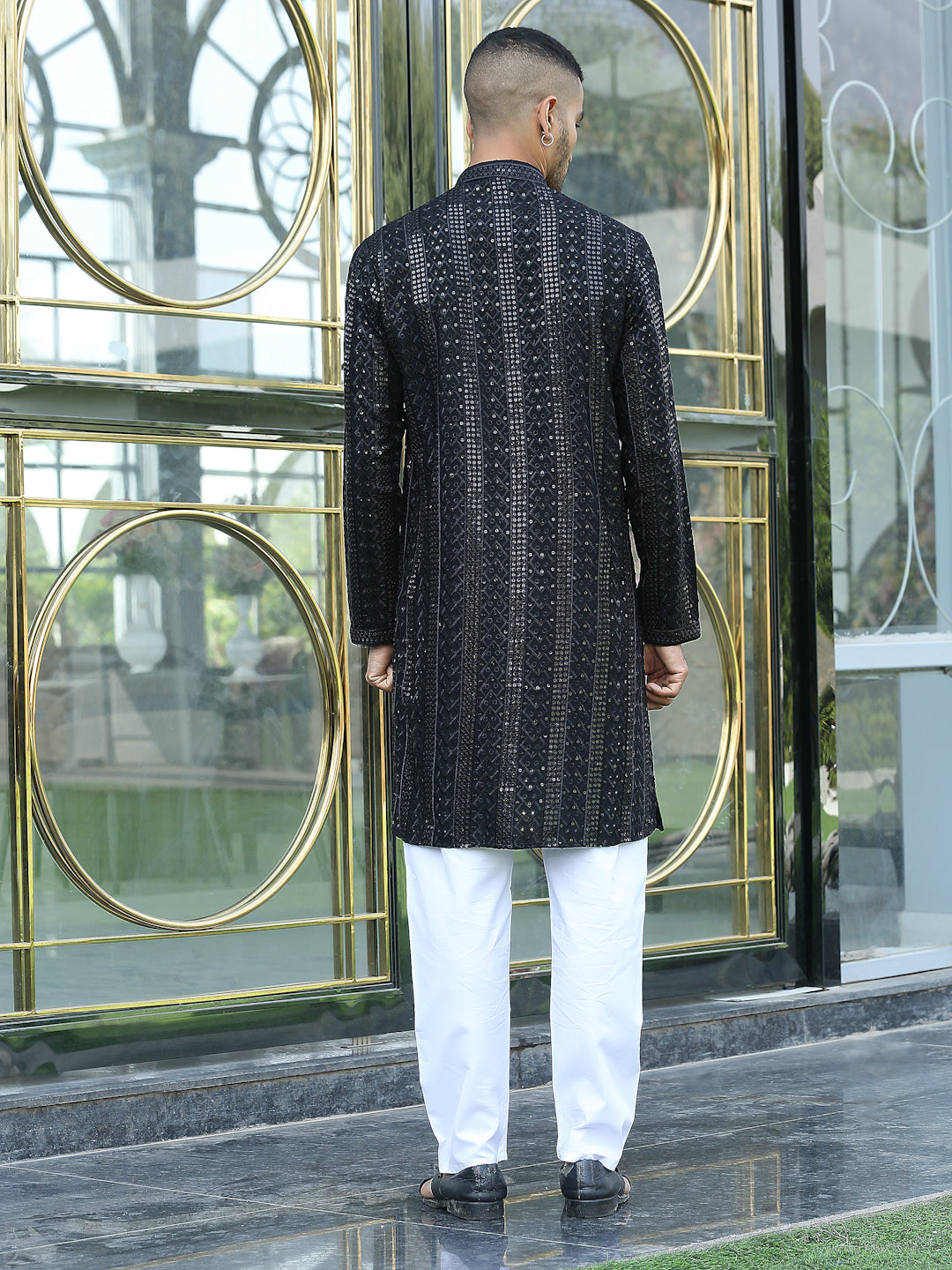 Elevate your festive and traditional wardrobe with this elegant Men's Silk Rayon Ethnic Motifs Embroidered Kurta with Elastic Waistband Pyjama Set. Crafted from a luxurious silk-rayon blend, this kurta set features exquisite ethnic motif embroidery and delicate sequin detailing on the yoke for a refined, eye-catching appeal. The Mandarin collar adds a touch of contemporary sophistication, while the full sleeves and straight hem offer a classic ethnic silhouette.