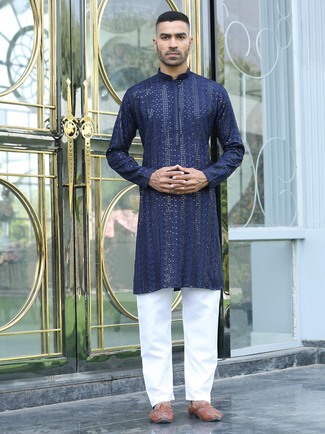 Paired with a comfortable elastic waistband pyjama, this ensemble ensures all-day comfort without compromising on style—ideal for weddings, festivals, poojas, and other special occasions. Whether you're attending a grand celebration or hosting a traditional ceremony, this embroidered kurta set blends timeless tradition with modern flair.