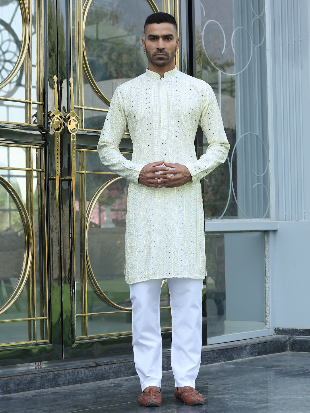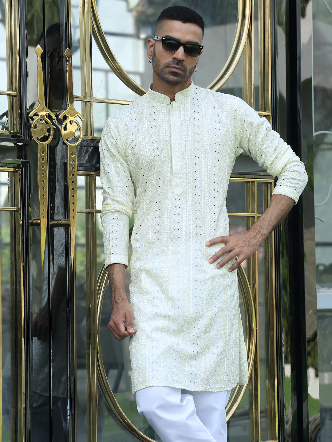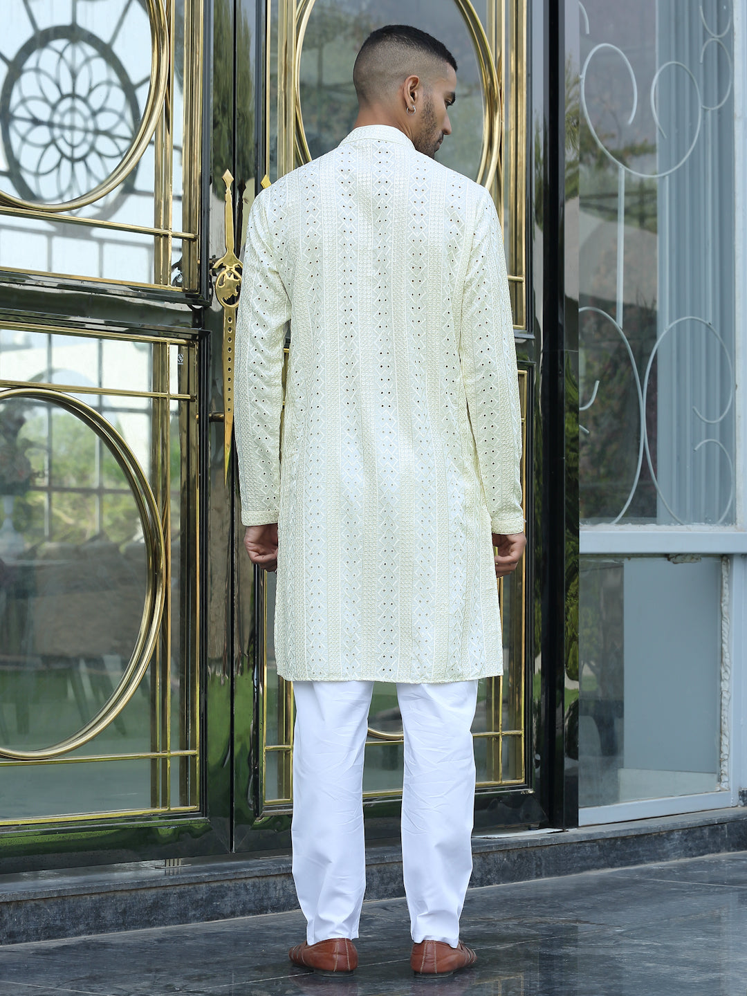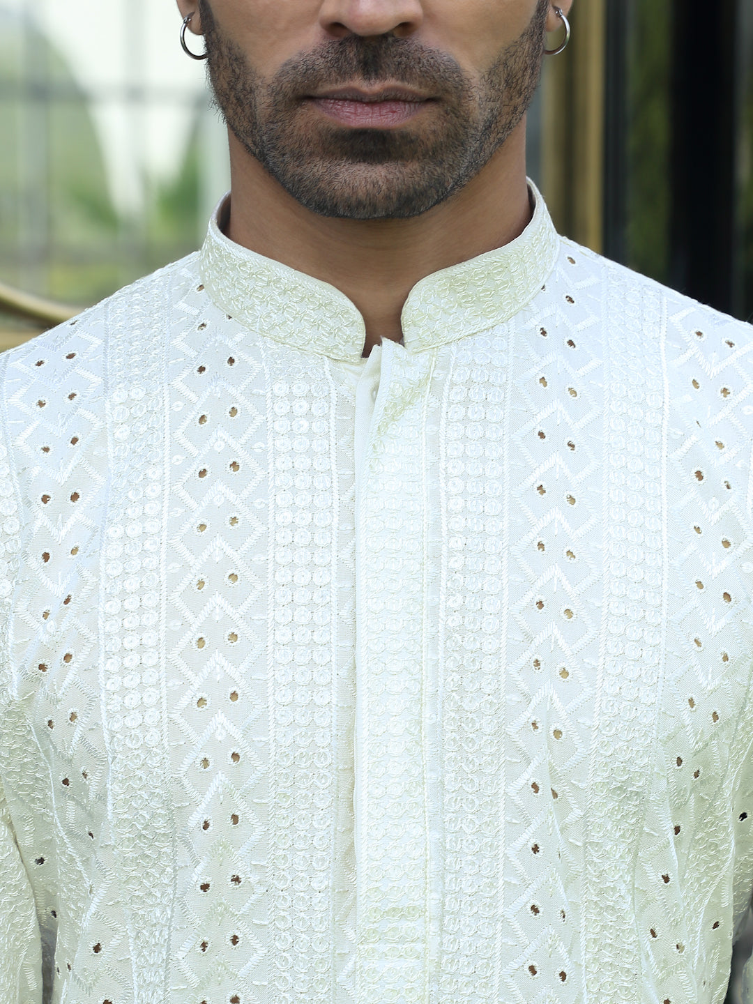 Silk Rayon Ethnic Motifs Embroidered Mandarin Collar Sequinned Kurta with Elastic Waistband White Pyjama