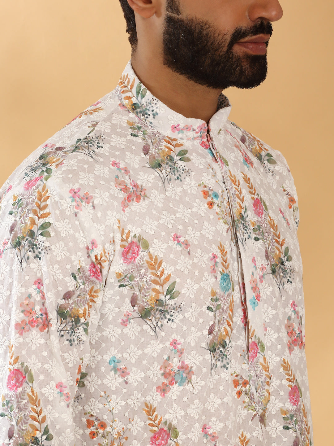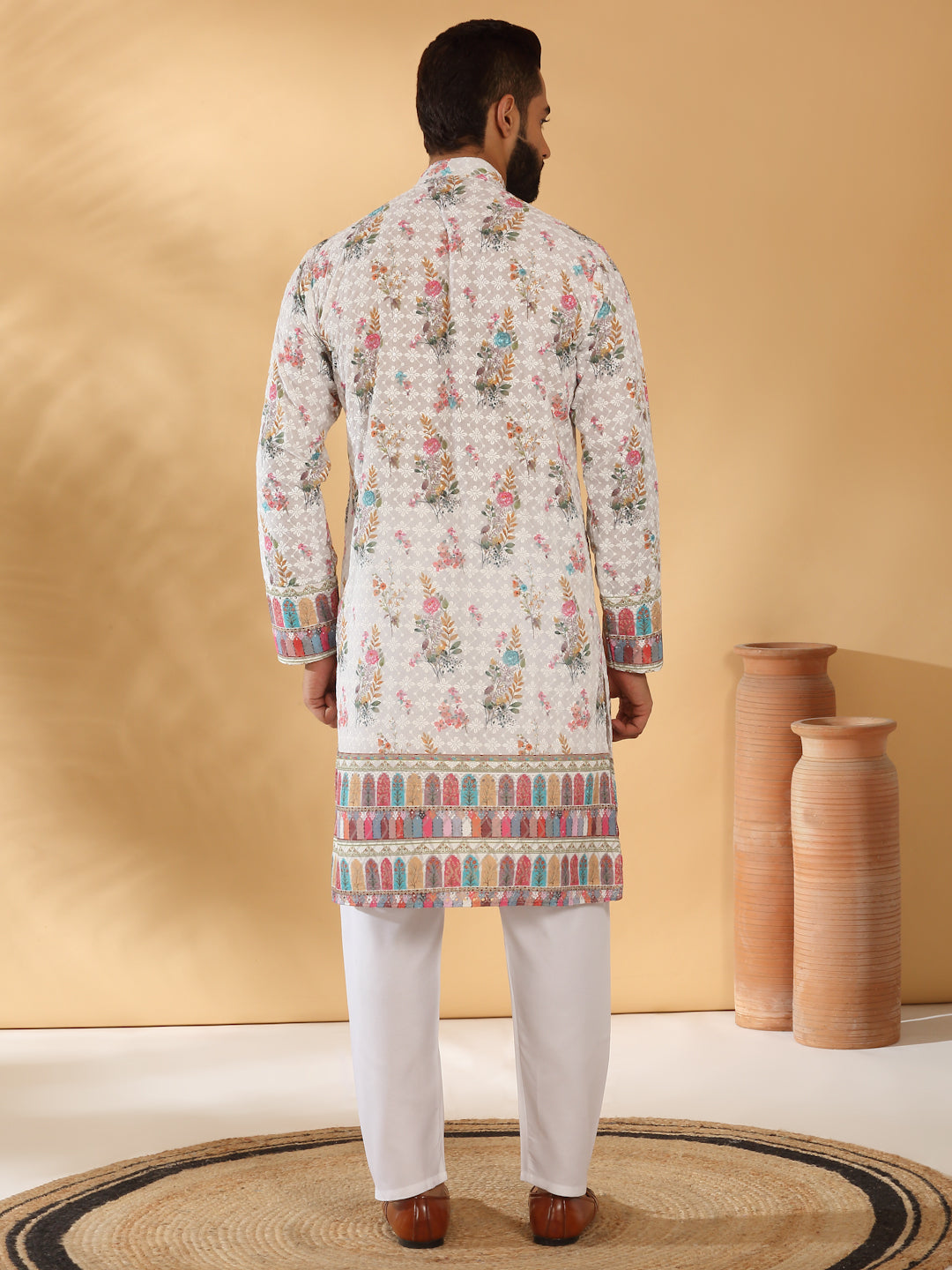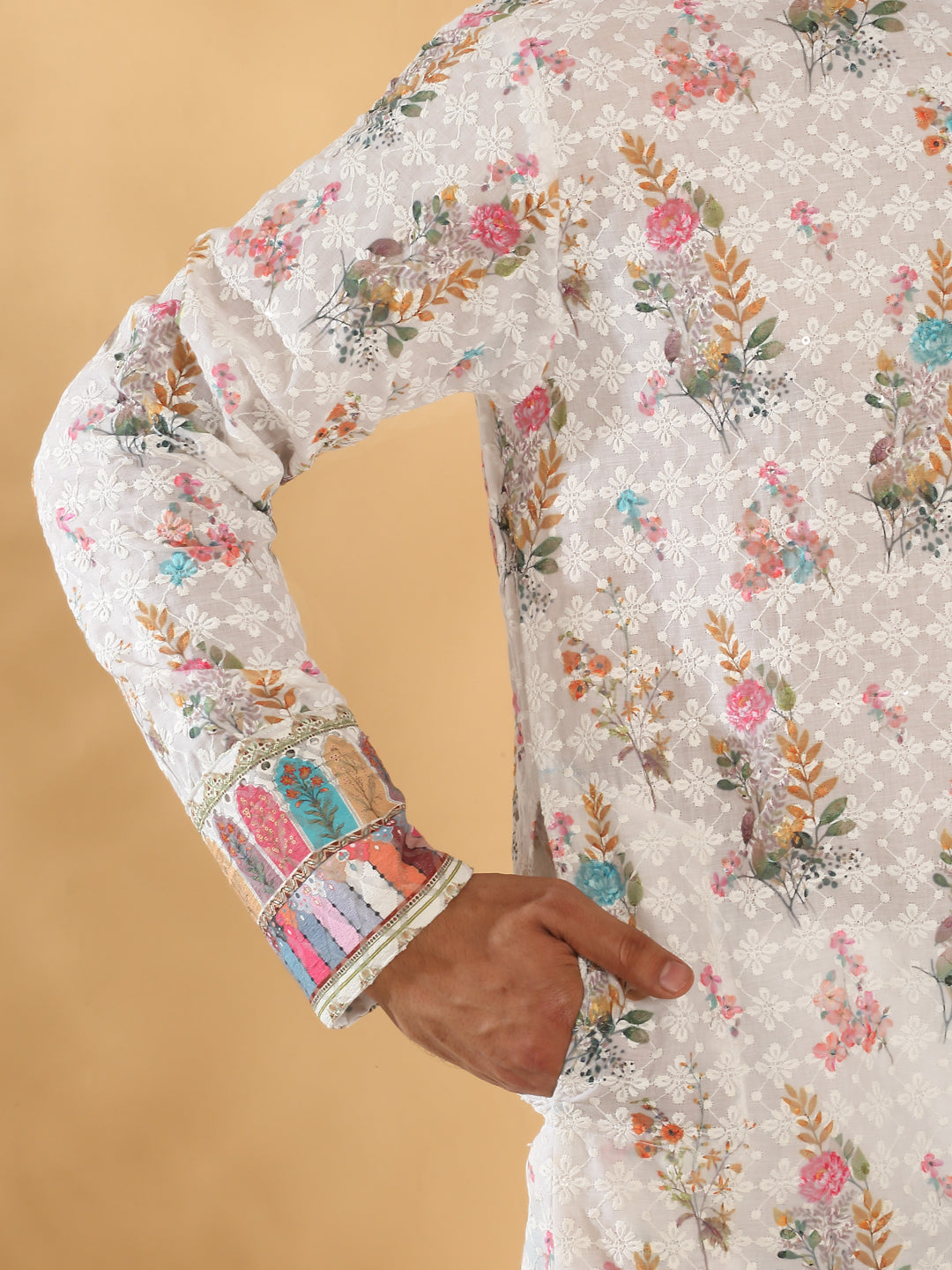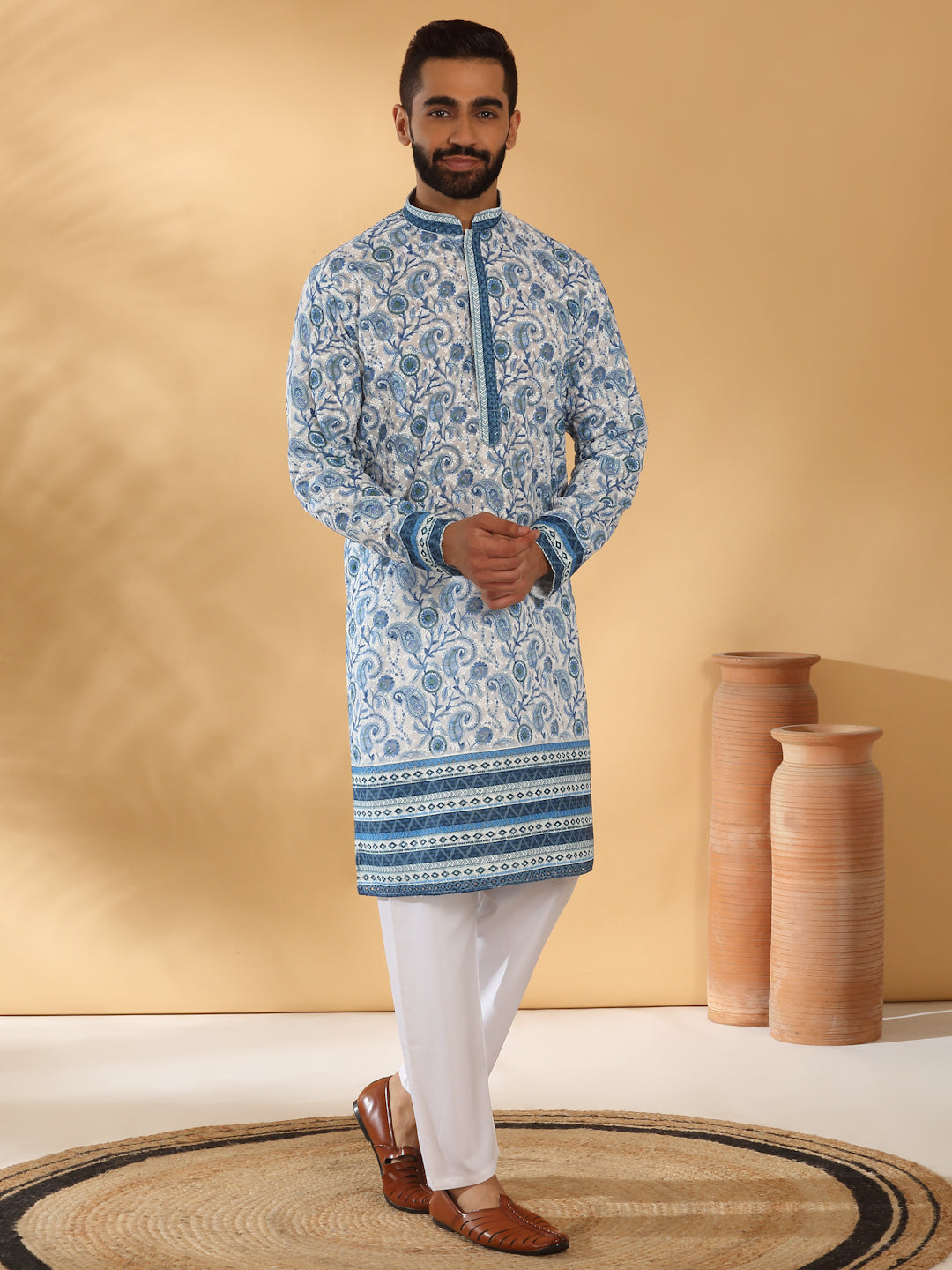 Elevate your ethnic style with this Men's Cotton Embroidered Sequin Chikan Floral Print Thread Work White Kurta. Crafted from premium cotton, this elegant kurta features intricate Chikan embroidery, delicate sequin accents, and floral print thread work, adding a touch of sophistication and charm. The breathable fabric ensures all-day comfort, making it perfect for festive occasions, cultural events, and celebrations. Pair it with a churidar or Pyjama for a timeless and refined look.