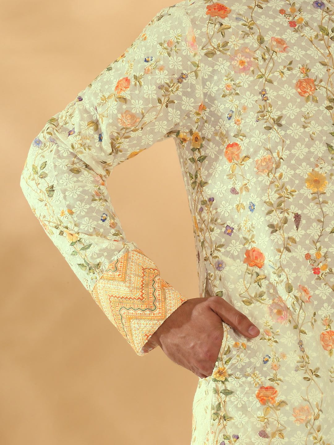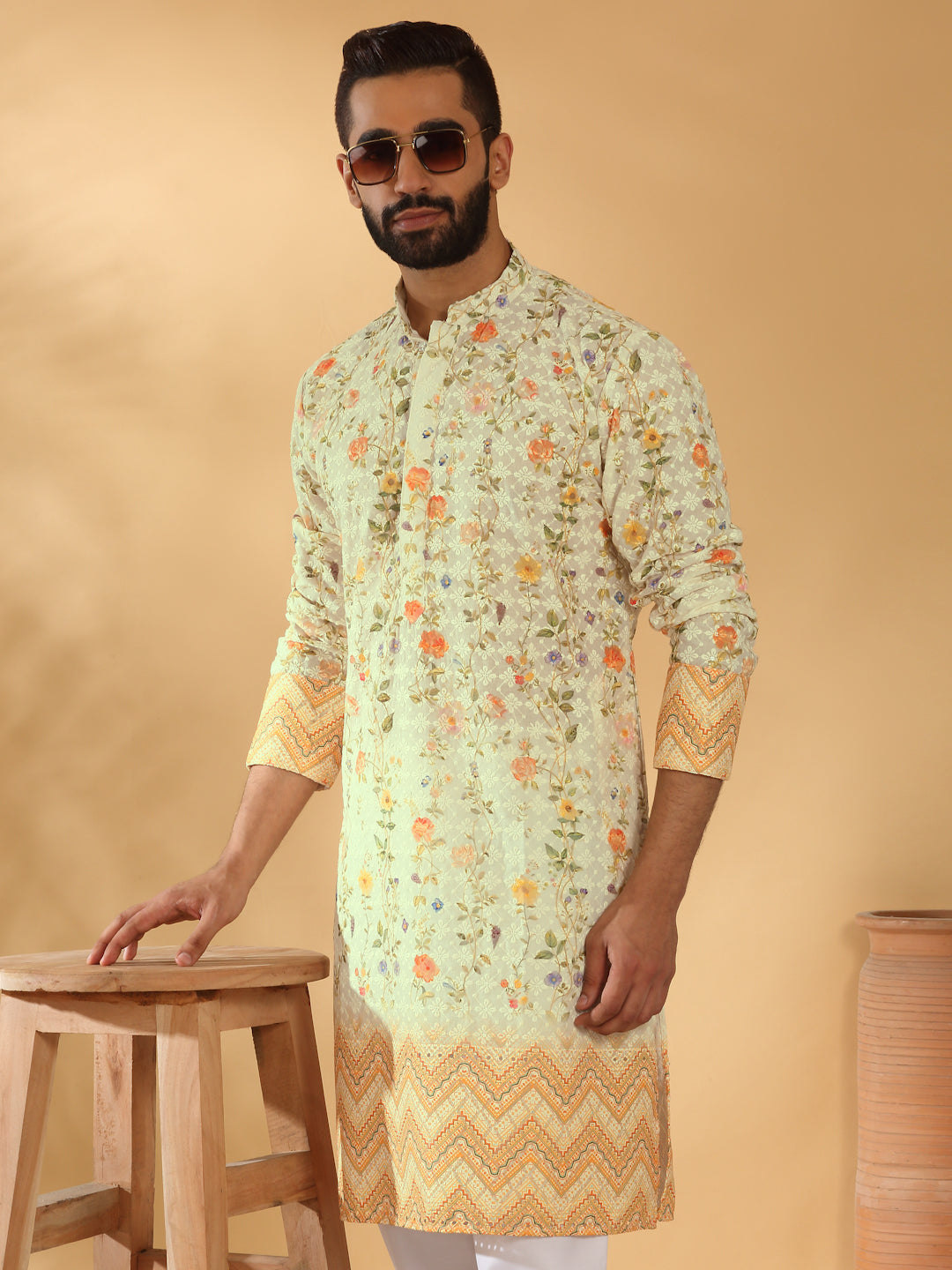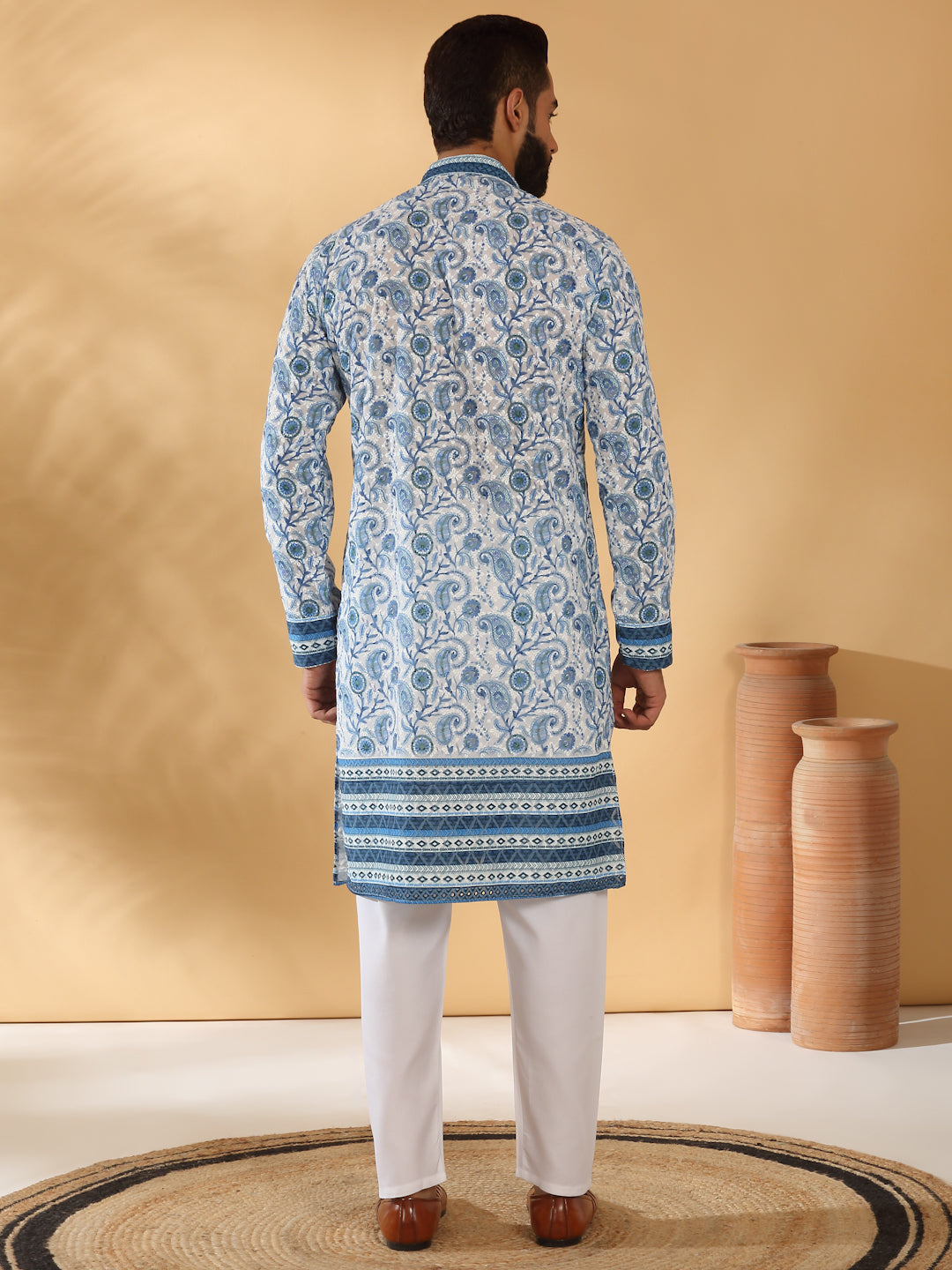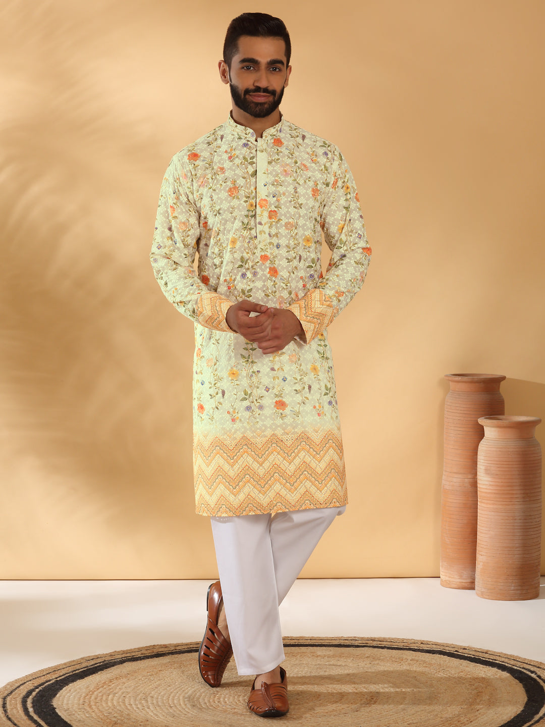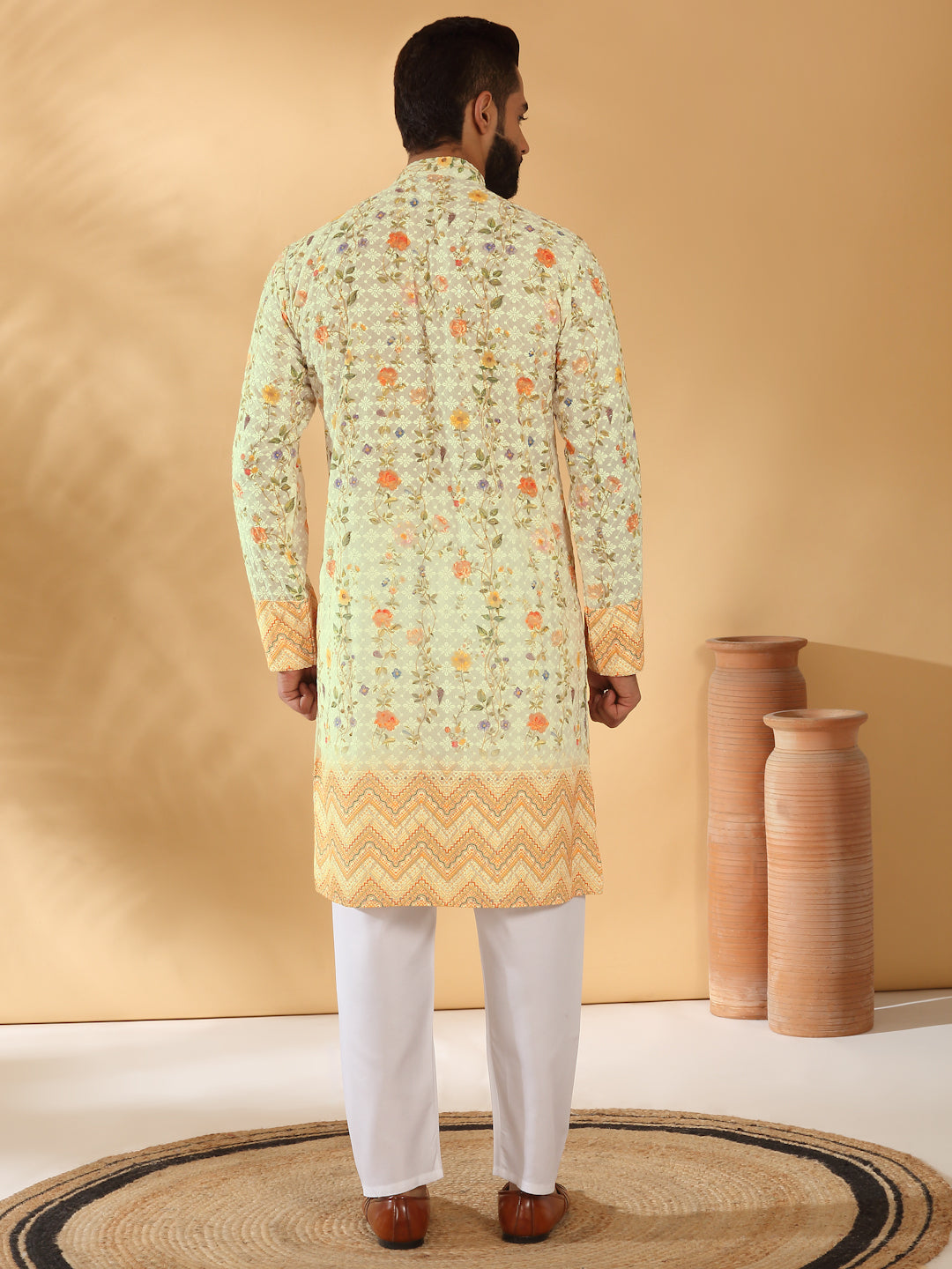 Elevate your ethnic style with this Men's Cotton Embroidered Sequin Chikan Floral Print Thread Work White Kurta. Crafted from premium cotton, this elegant kurta features intricate Chikan embroidery, delicate sequin accents, and floral print thread work, adding a touch of sophistication and charm. The breathable fabric ensures all-day comfort, making it perfect for festive occasions, cultural events, and celebrations. Pair it with a churidar or Pyjama for a timeless and refined look.