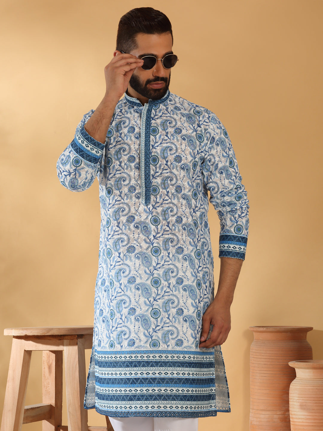 LUXE-Cotton Embroidered Sequin Chikan Floral Print Thread Work Kurta