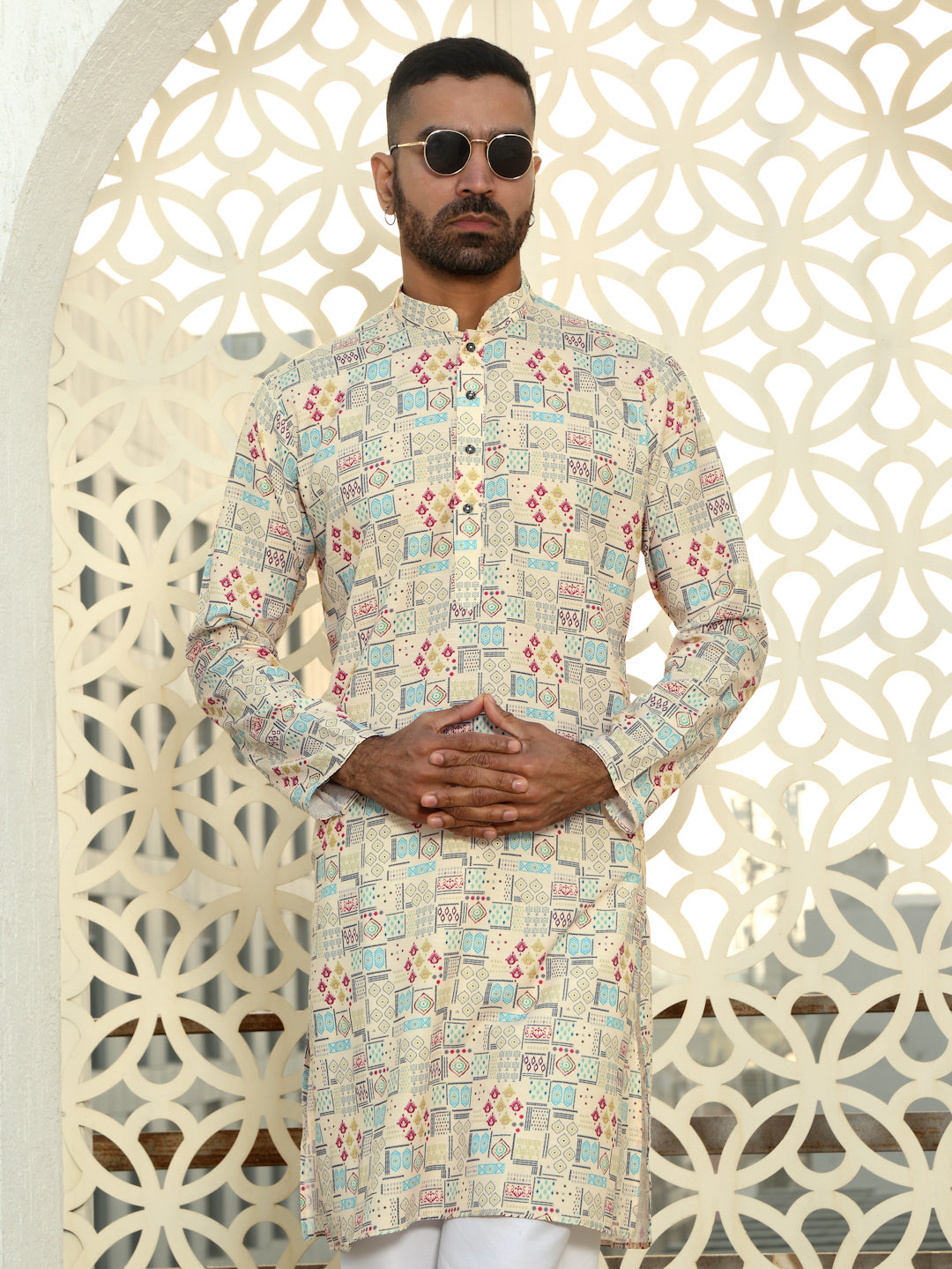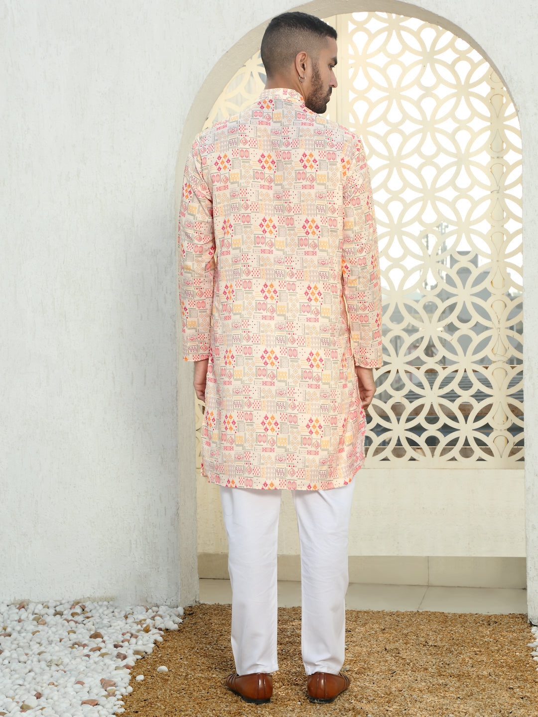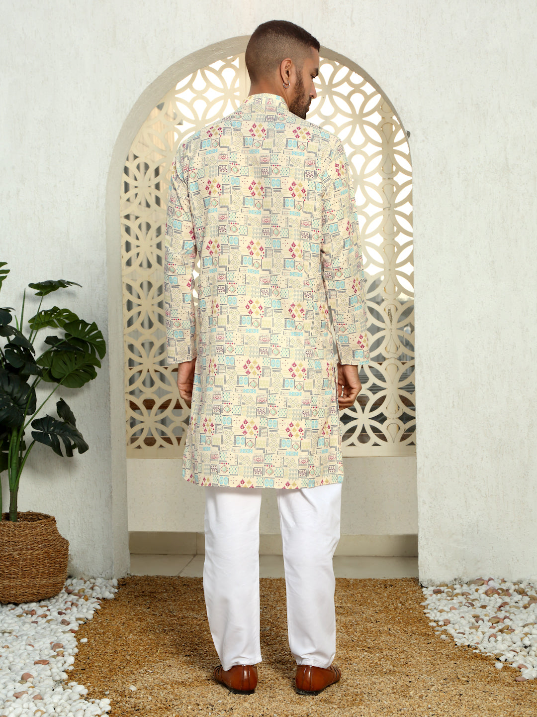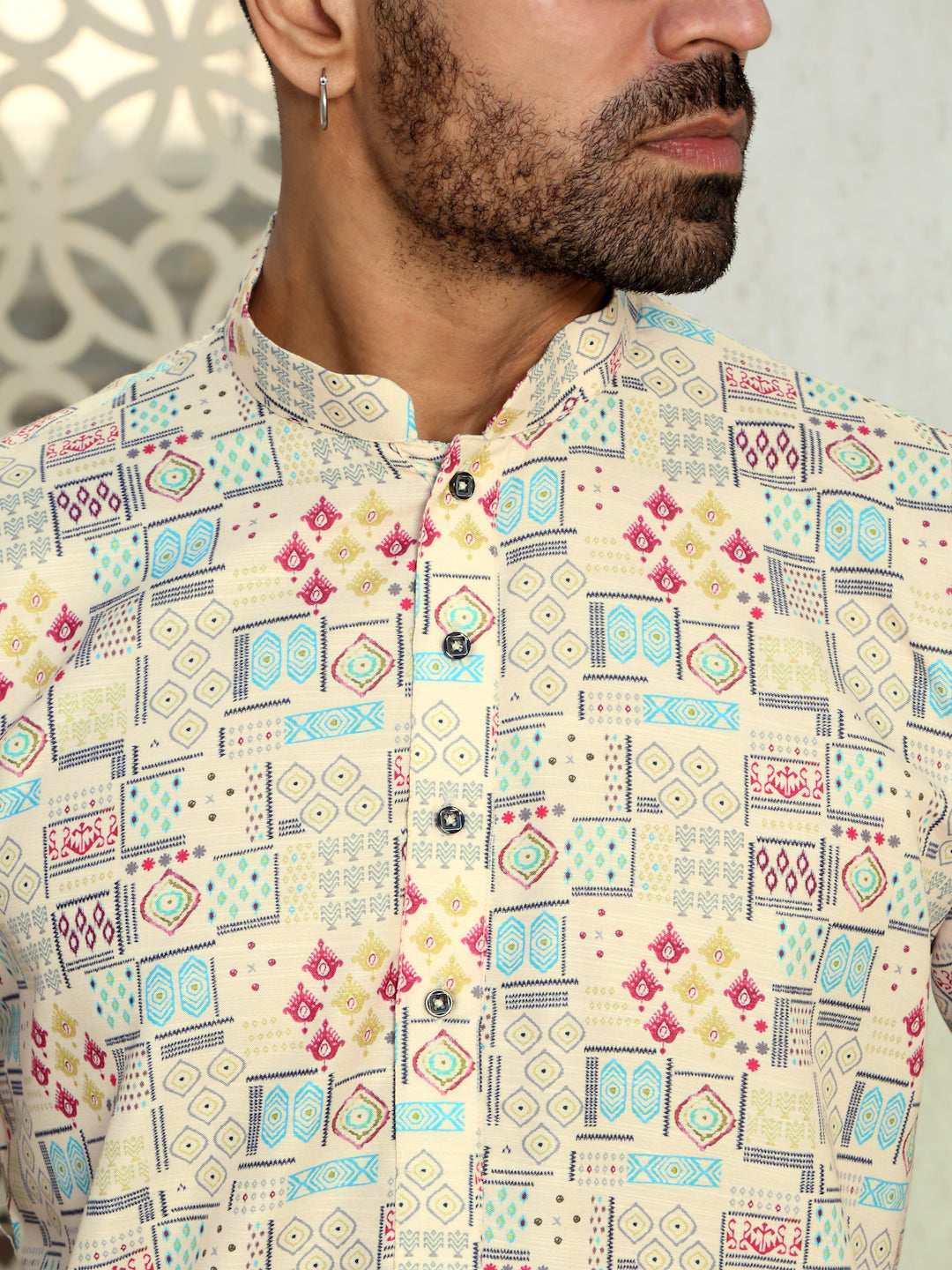 Elevate your ethnic wear collection with this stylish cotton kurta, designed for comfort and a modern touch. Crafted from soft, breathable cotton fabric, this kurta ensures all-day comfort, making it perfect for casual outings or festive occasions. The straight cut and regular fit offer a contemporary look, while the unique geometric print adds a subtle yet striking flair to your ensemble. Featuring a classic round neck and button placket, this kurta pairs effortlessly with jeans or traditional trousers, giving you a versatile and stylish look.