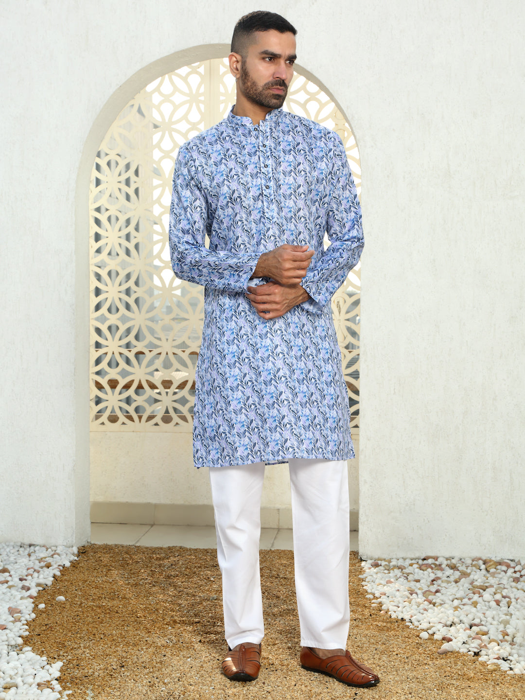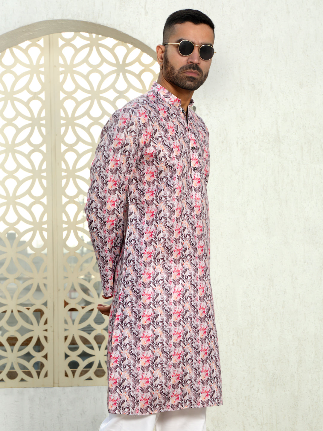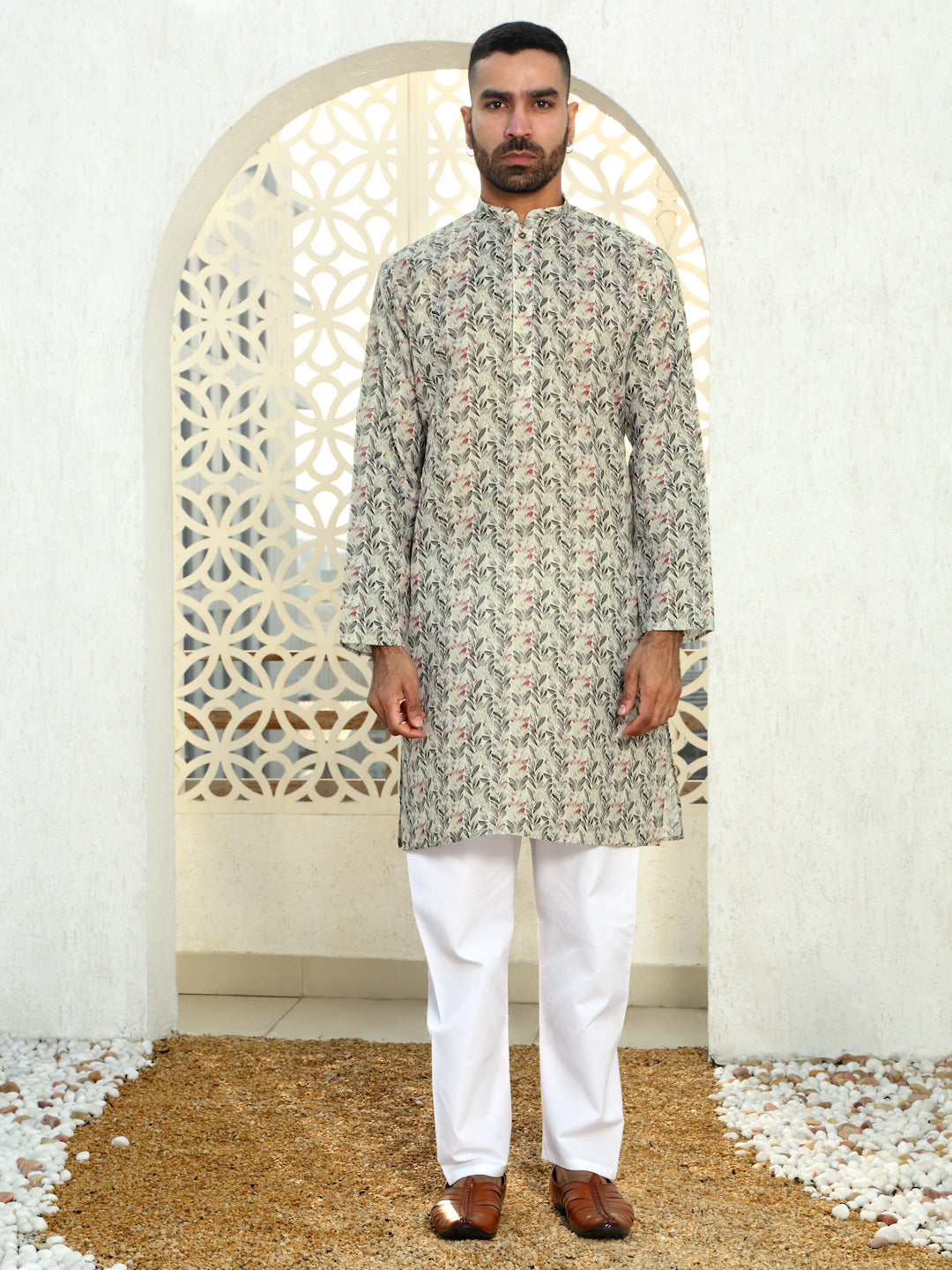 Embrace effortless style with the Men’s Cotton Leaf Printed Mandarin Collar Kurta. Crafted from soft, breathable cotton, this kurta ensures all-day comfort while offering a refined, casual look. The vibrant leaf print adds a refreshing touch of nature-inspired elegance, making it perfect for both casual outings and festive occasions. Featuring a sleek mandarin collar and long sleeves, this kurta brings together a modern silhouette with traditional design elements. Whether paired with jeans or traditional trousers, this versatile piece is a must-have for the stylish, modern man who loves blending comfort with contemporary flair.