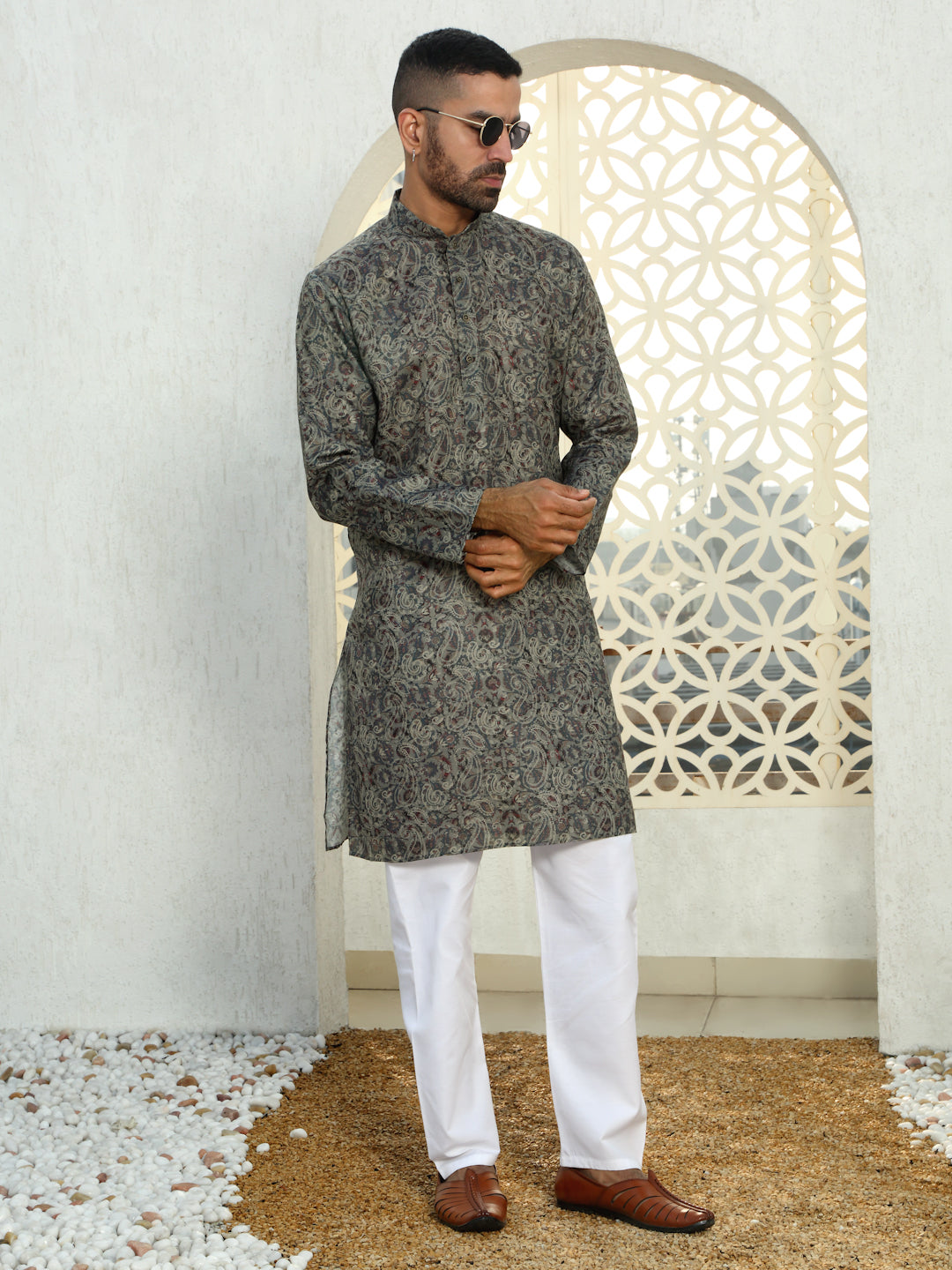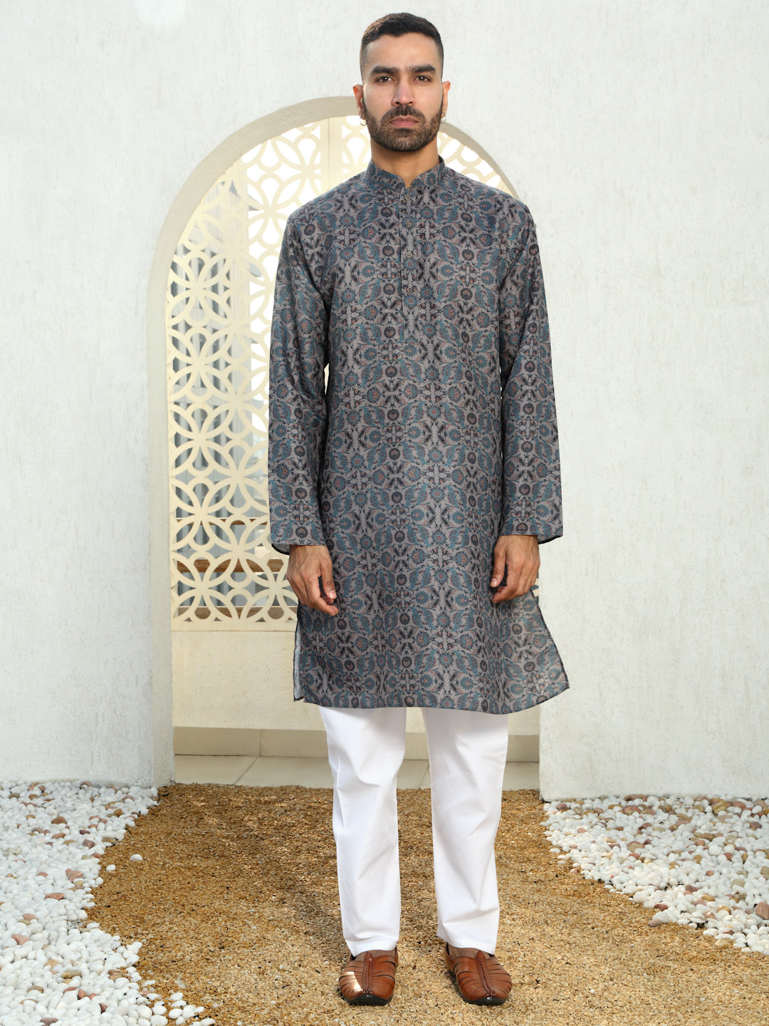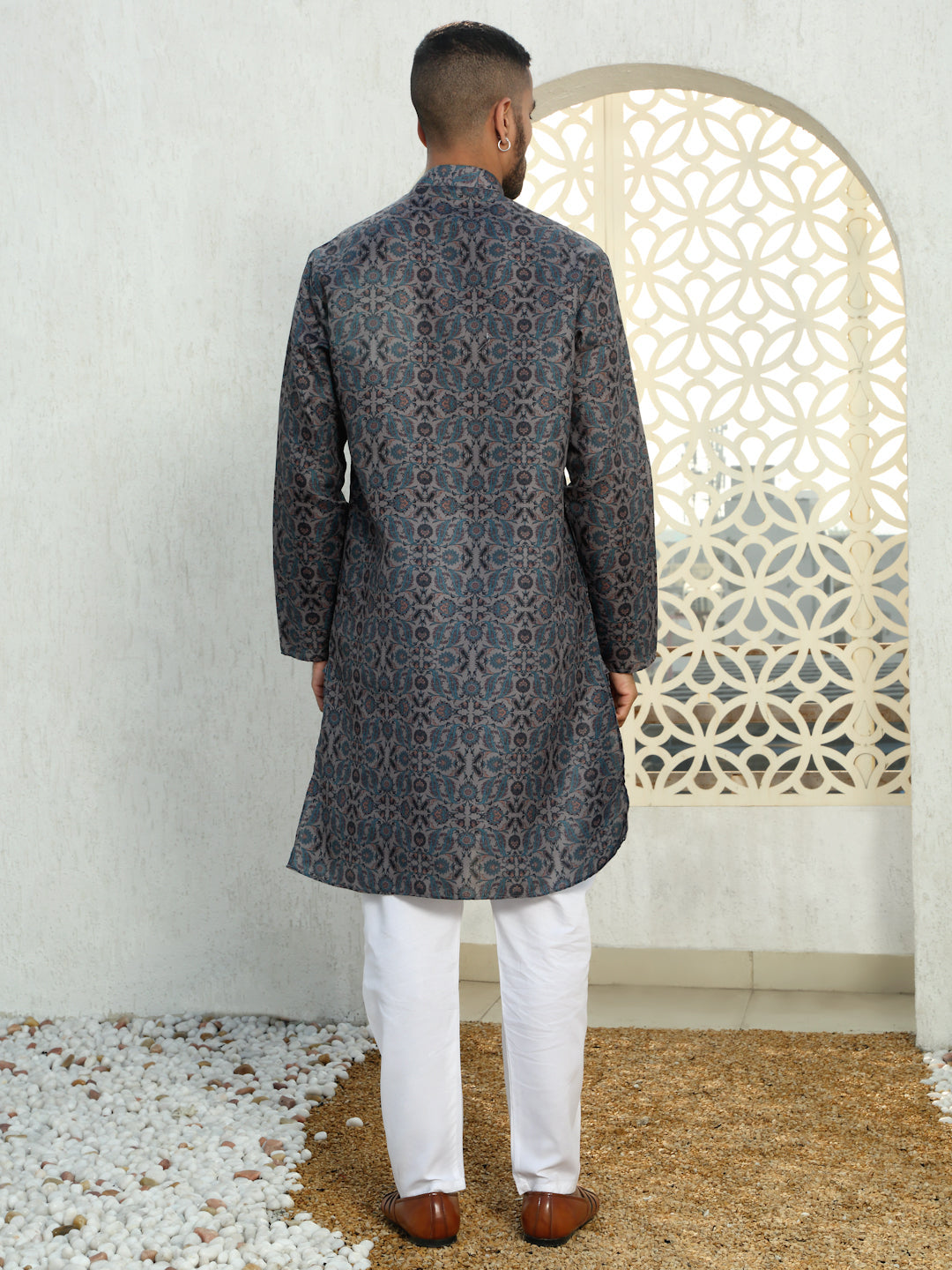 Refresh your wardrobe with the Men’s Cotton Floral Paisley Printed Kurta. Made from soft, breathable cotton, this kurta ensures comfort and style throughout the day. The beautiful floral print in calming blue tones adds a vibrant yet sophisticated touch, making it perfect for both casual and semi-formal occasions. With a relaxed fit and a classic design, this kurta combines tradition with a modern twist. Whether you're attending a family gathering, a casual outing, or a festive celebration, this kurta is the perfect choice for a stylish, effortless look.