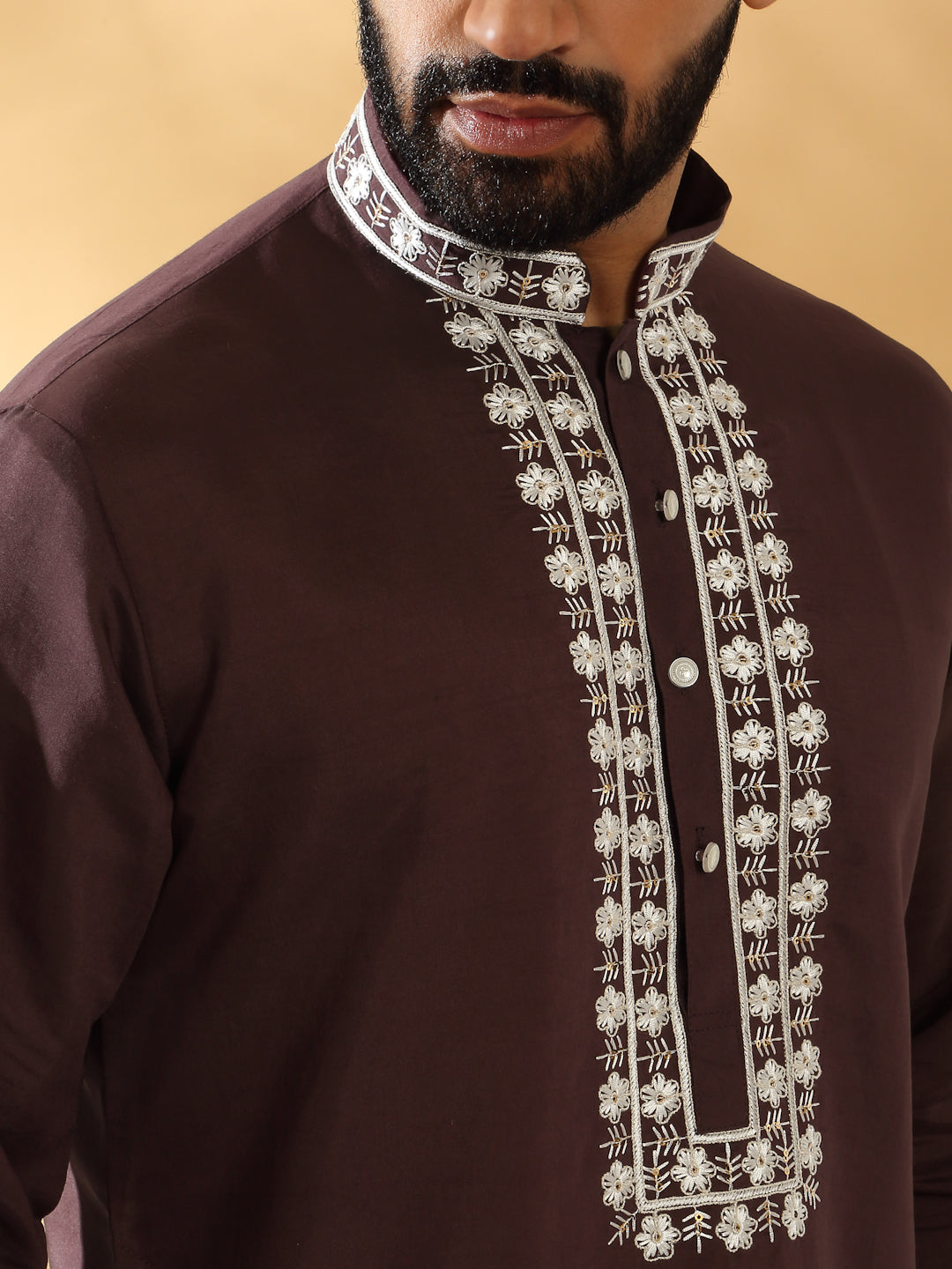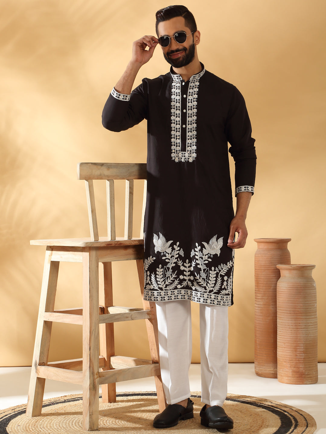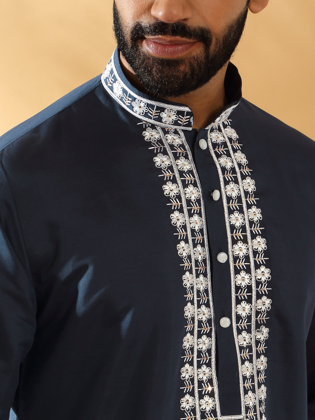 Pair this timeless kurta with churidars, trousers, or mojaris for a classic and distinguished appearance, perfect for grand occasions and festive events.
