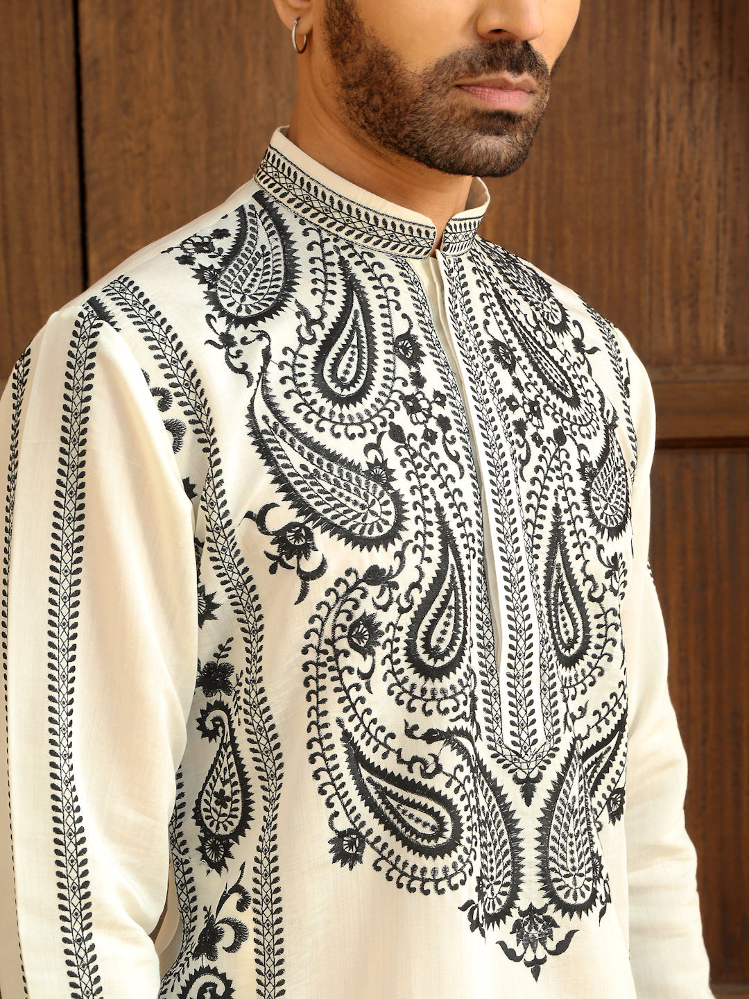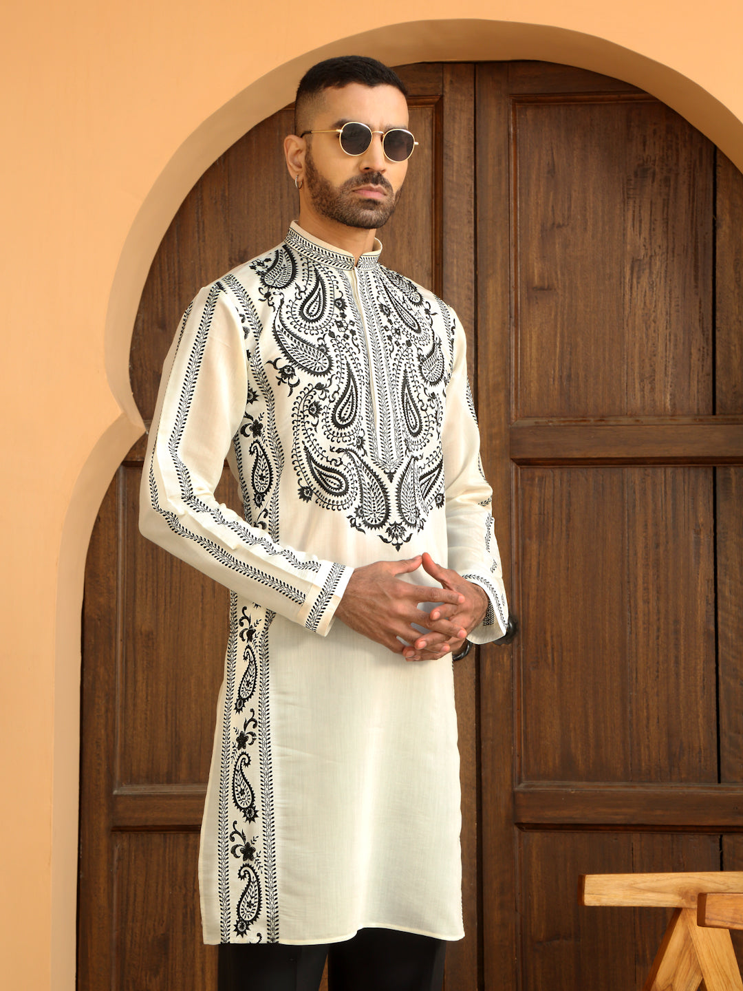 LUXE- Cotton Silk Neck White Embroidered Paisley Kurta