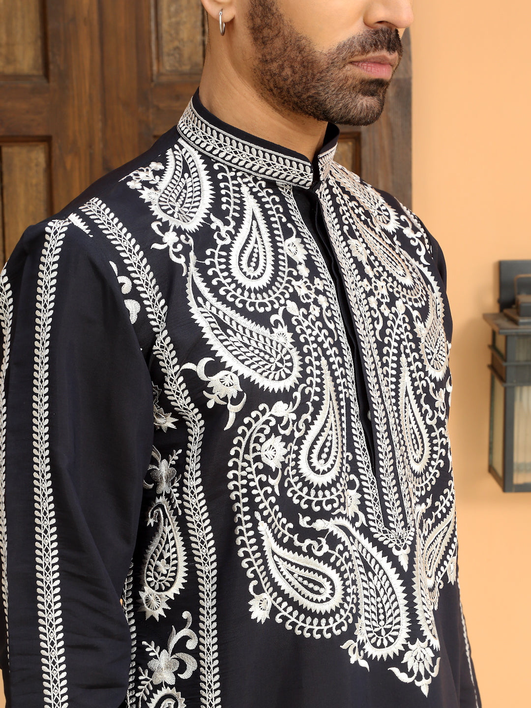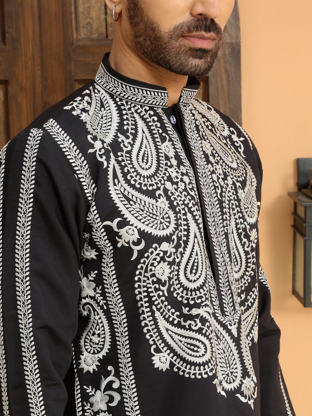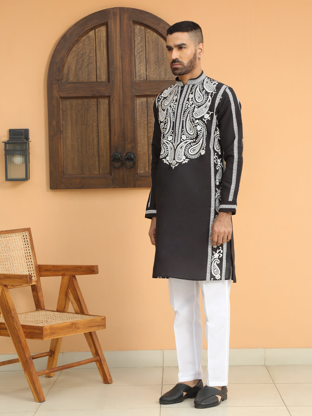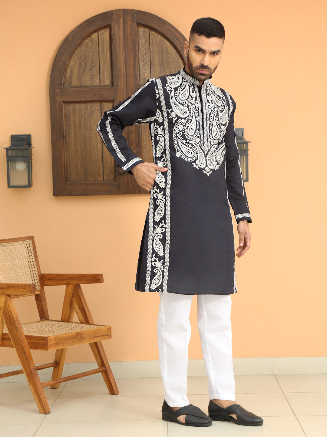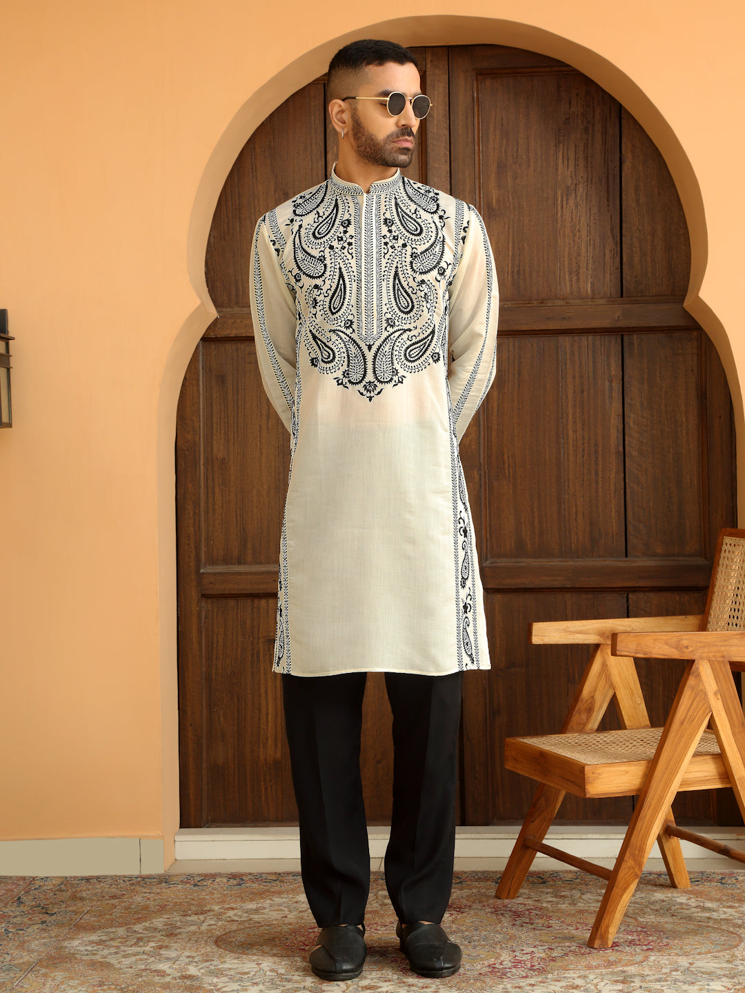 Elevate your ethnic wardrobe with the KRAFT INDIA LUXE Men's Cotton Silk Kurta, featuring intricate white paisley embroidery that exudes elegance. Crafted from a premium cotton silk blend, this kurta offers a perfect balance of comfort and sophistication, making it ideal for festive occasions, weddings, and celebrations.