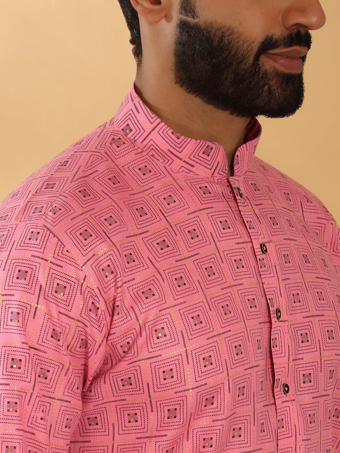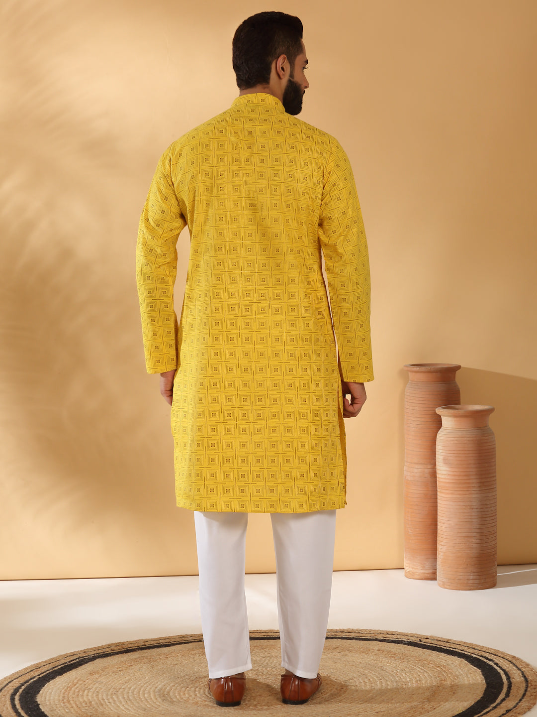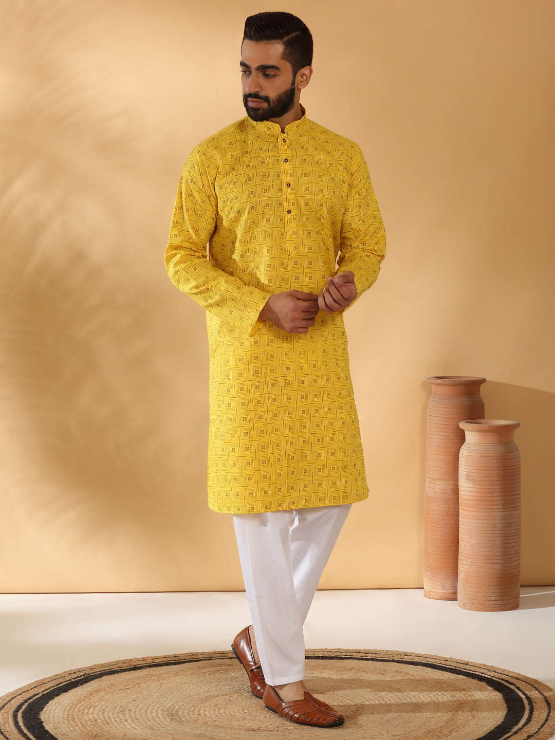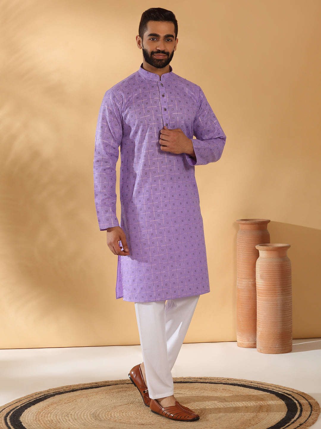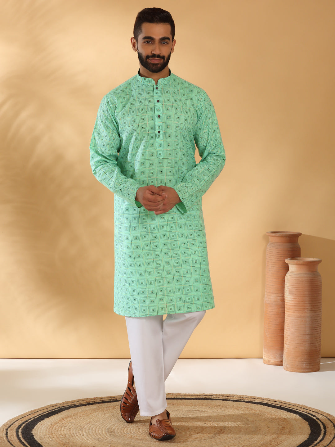 Add a fresh pop of color to your ethnic wardrobe with this straight kurta. Made from a breathable cotton blend fabric, it features an all-over geometric print for a modern twist on traditional styling. The mandarin collar and buttoned placket lend a clean, refined look—perfect for festive gatherings, casual outings, or ethnic days at work.