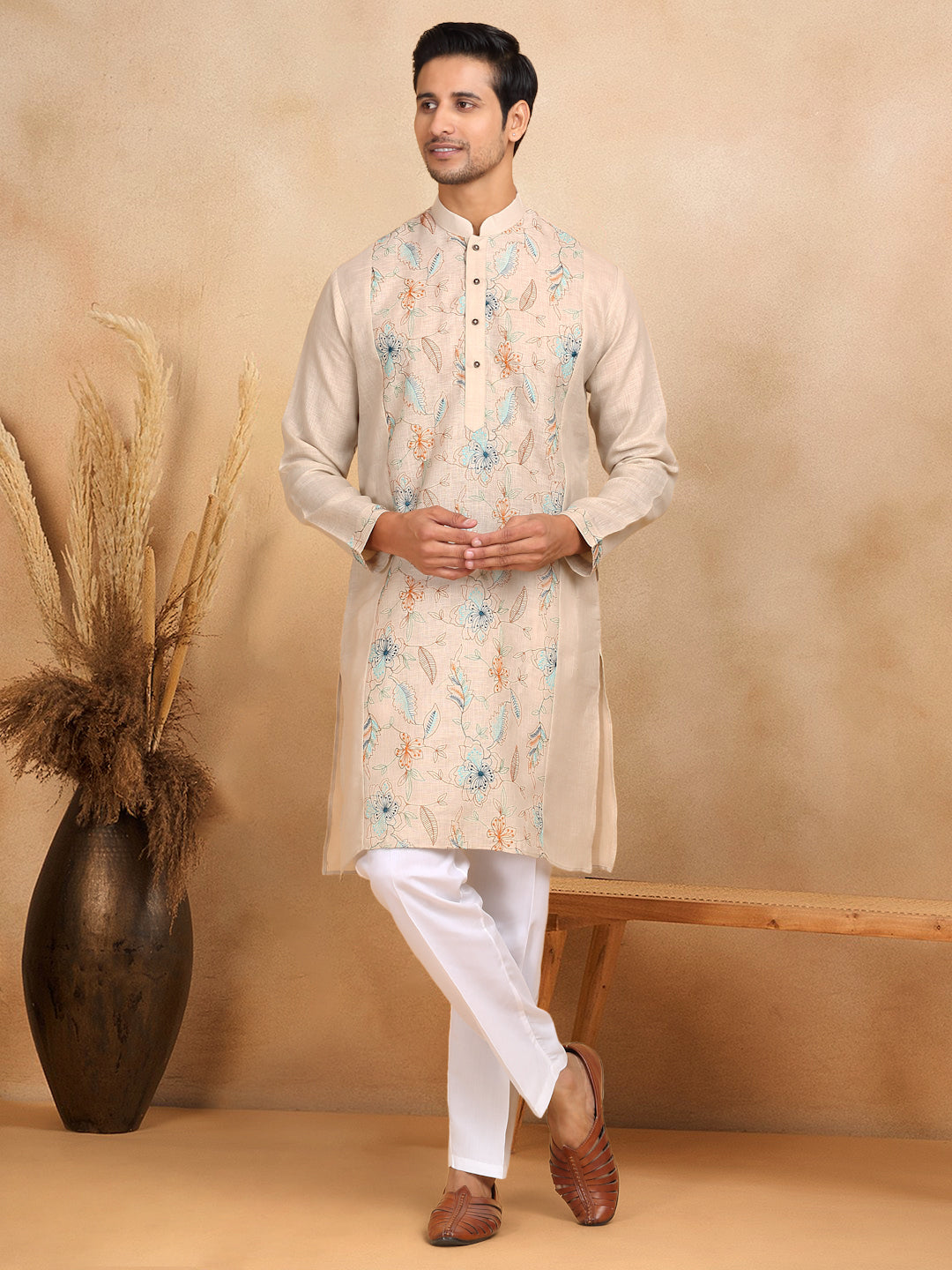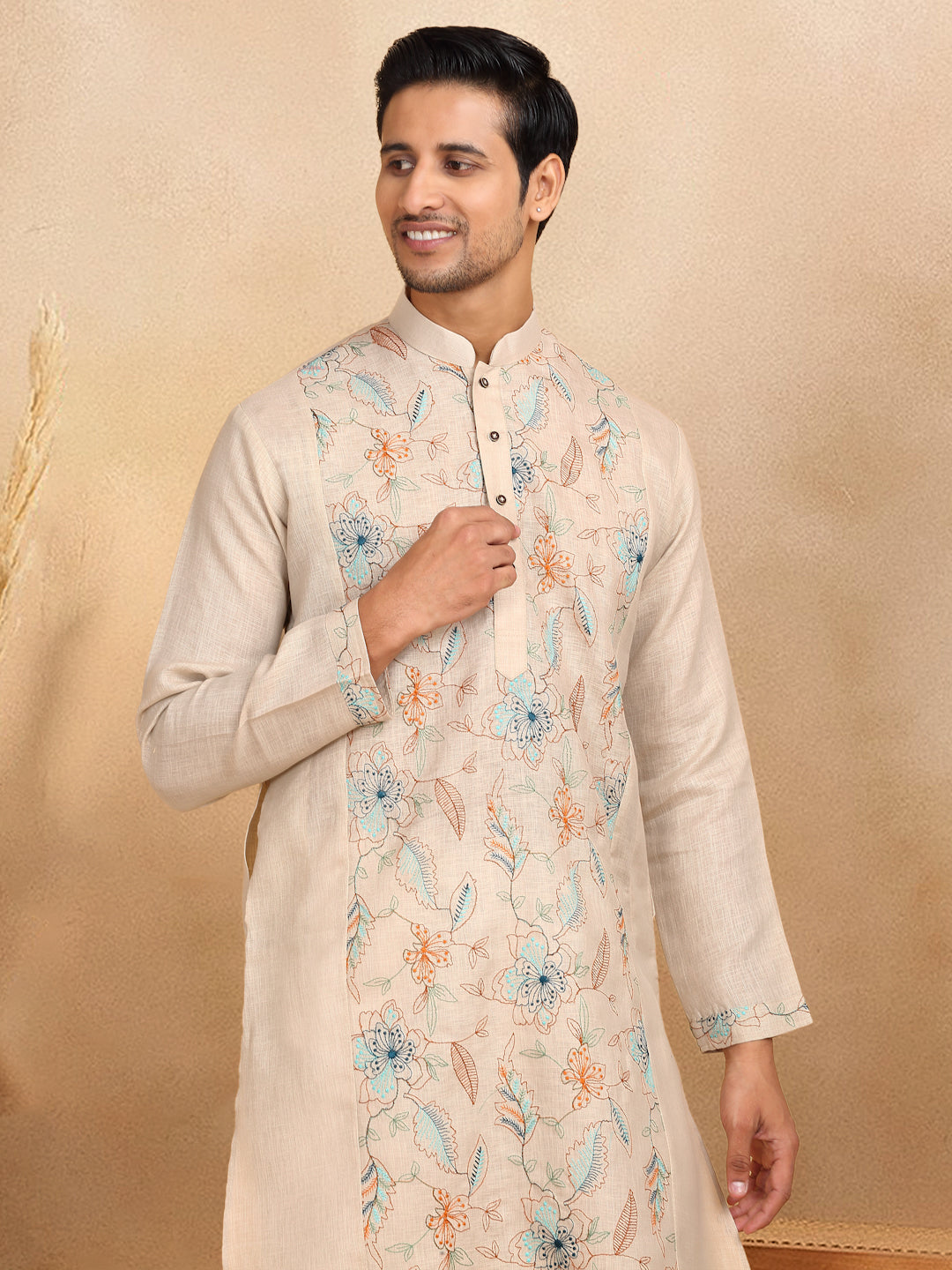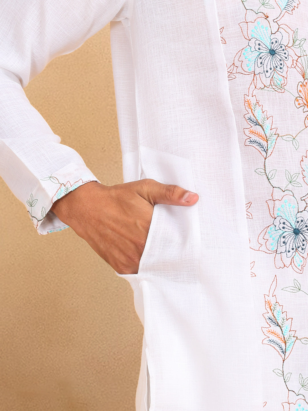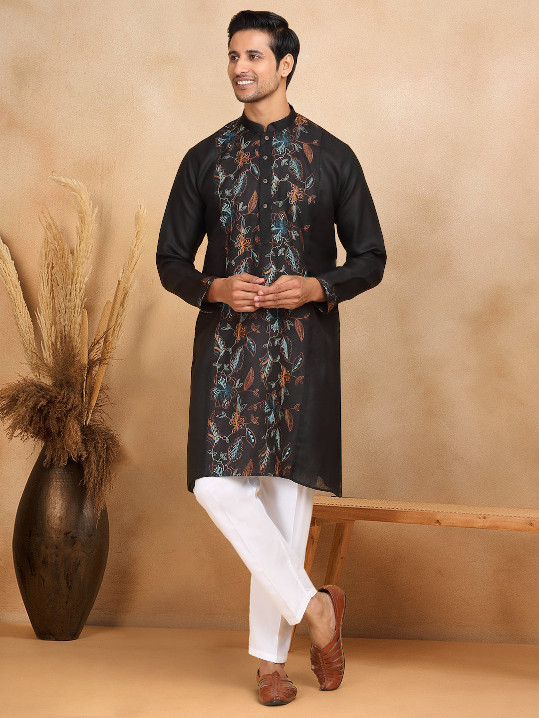 This traditional men's kurta boasts a knee-length, straight-fit design, made with soft and breathable cotton. With elegant floral embroidery and a mandarin collar, this long-sleeved kurta also features a convenient side pocket for added functionality. Perfect for any cultural or formal occasion.