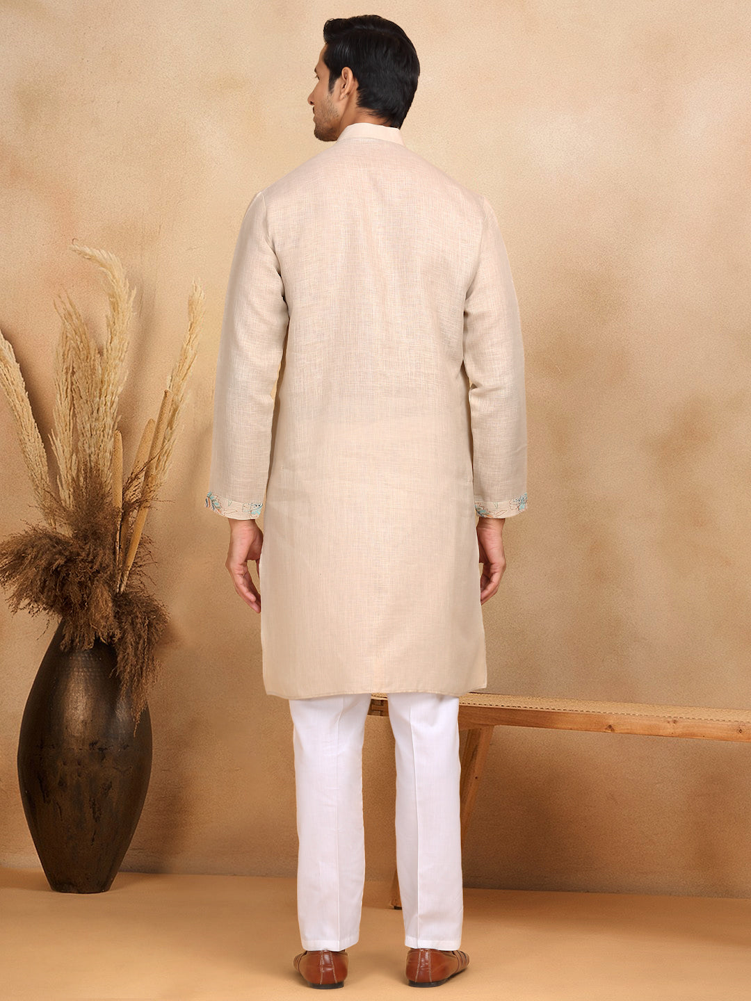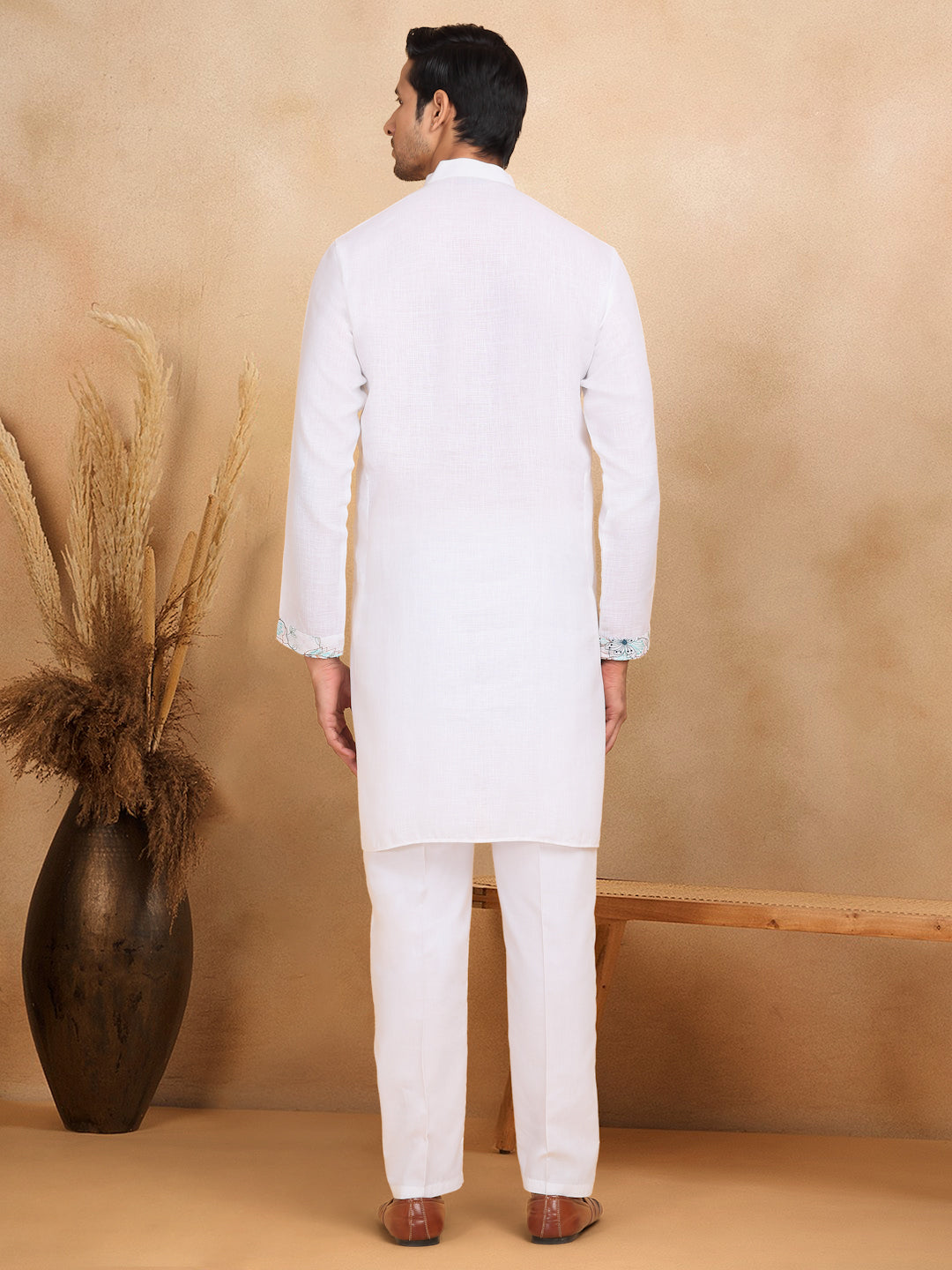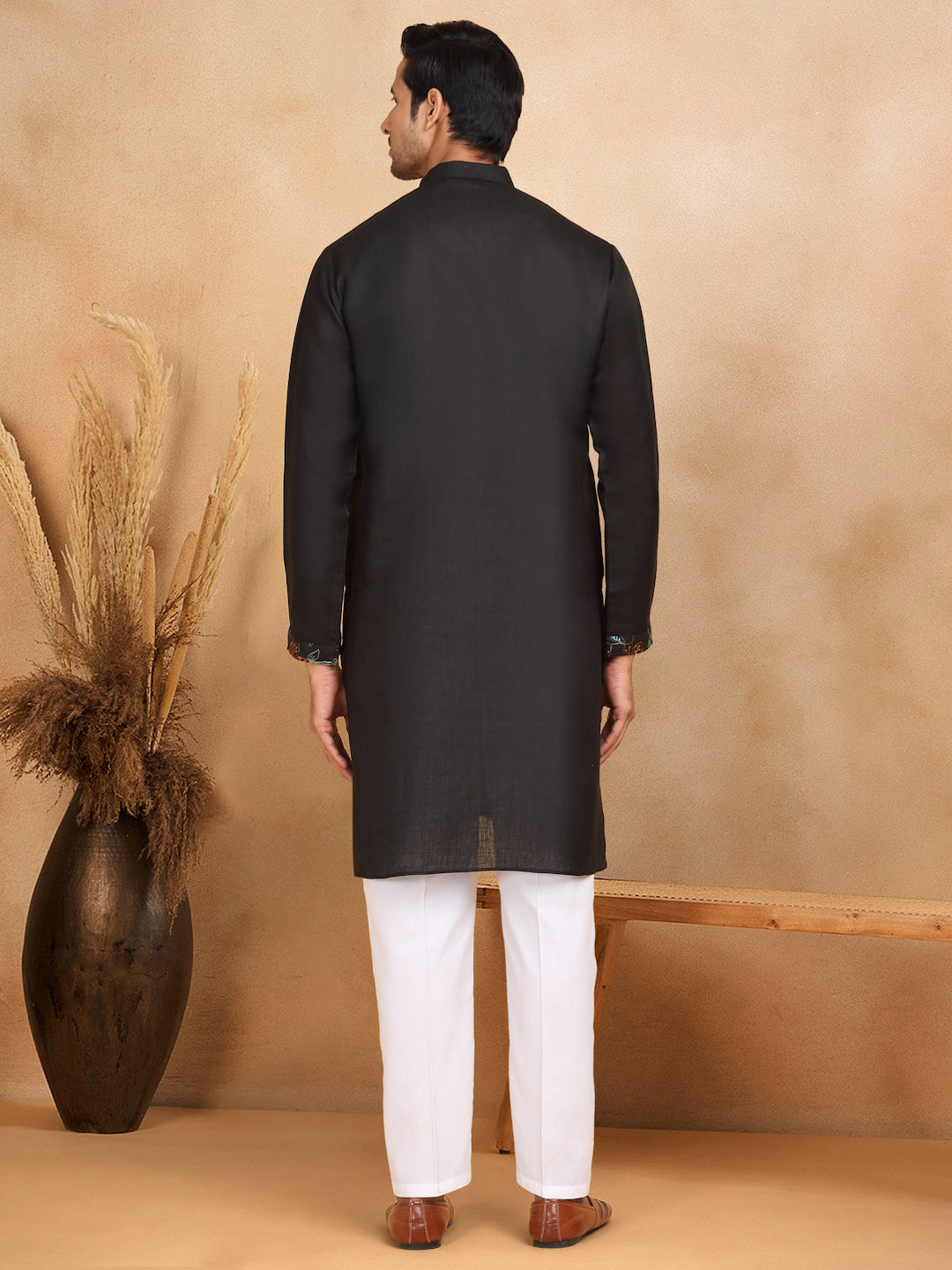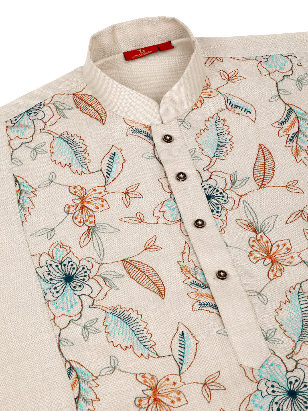 This traditional men's kurta boasts a knee-length, straight-fit design, made with soft and breathable cotton. With elegant floral embroidery and a mandarin collar, this long-sleeved kurta also features a convenient side pocket for added functionality. Perfect for any cultural or formal occasion.