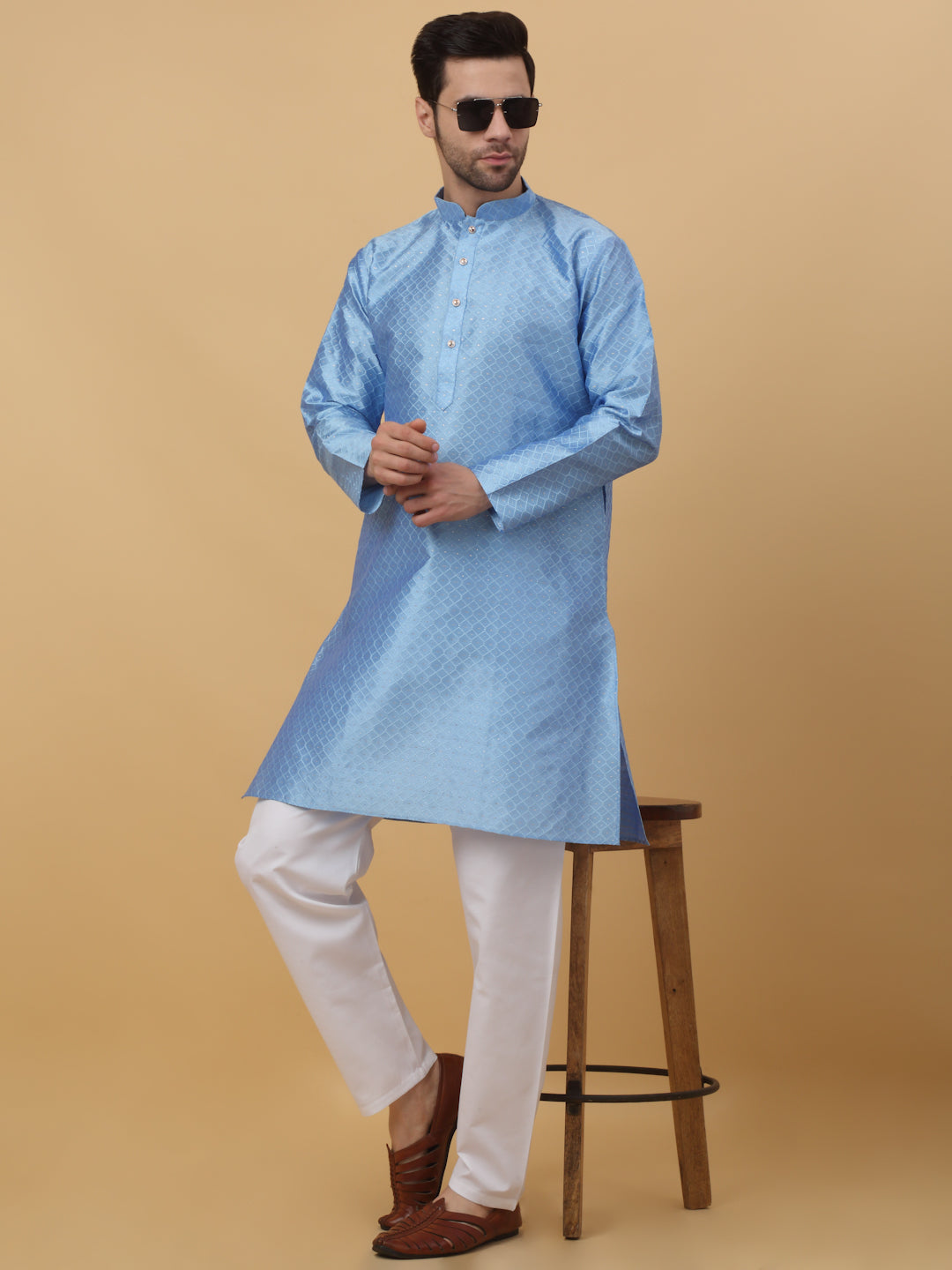 Straight Long kurta, has a mandarin collar, long sleeves, side pockets, button closure, side slits, straight hem