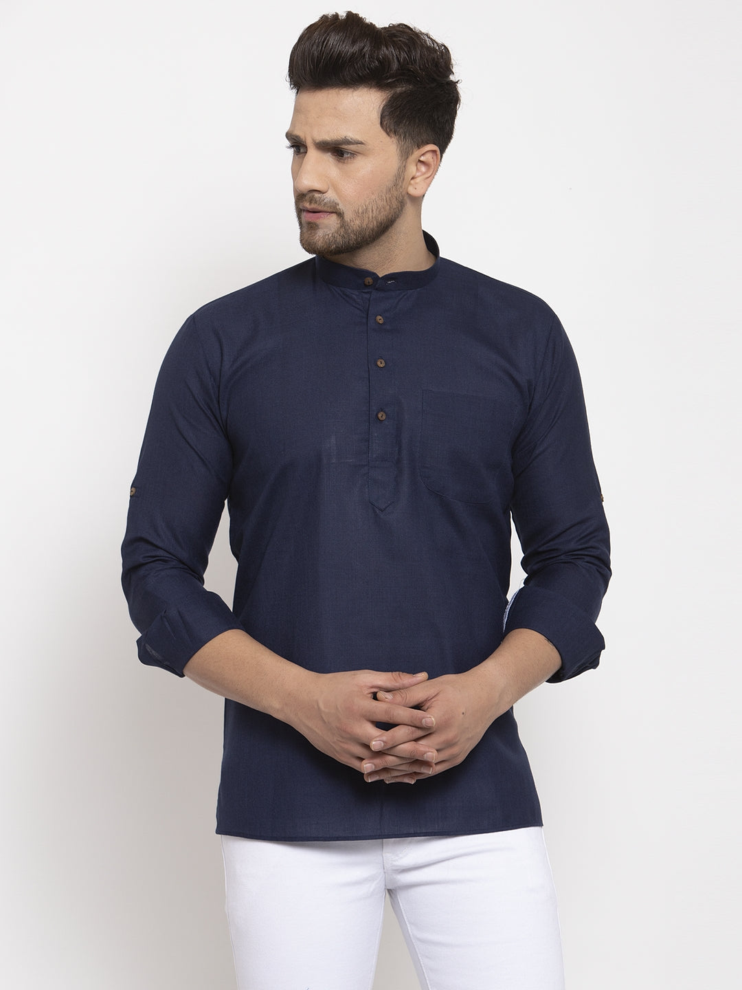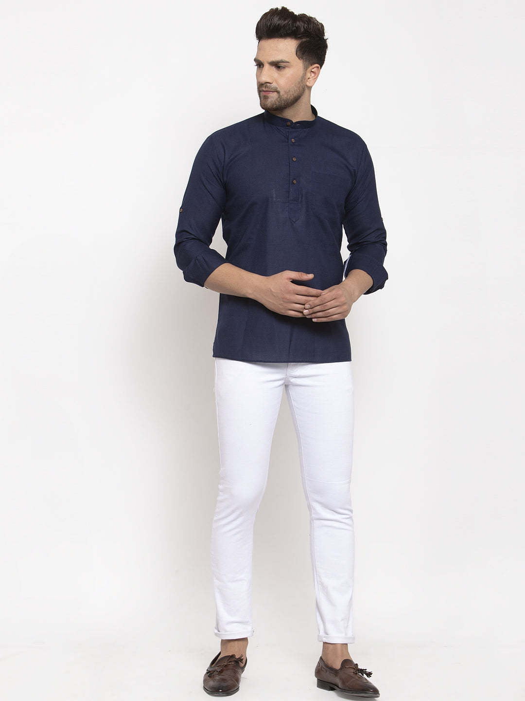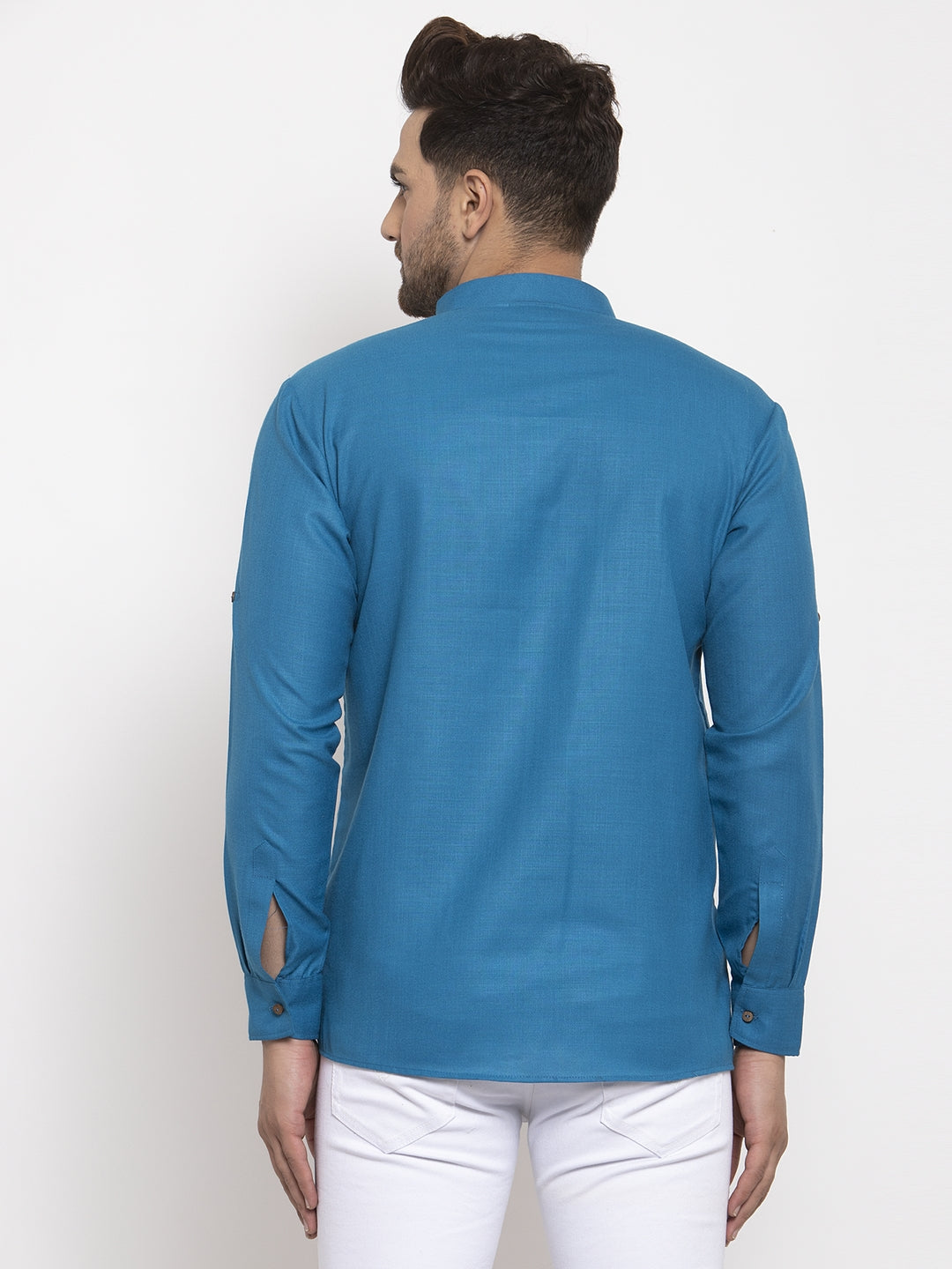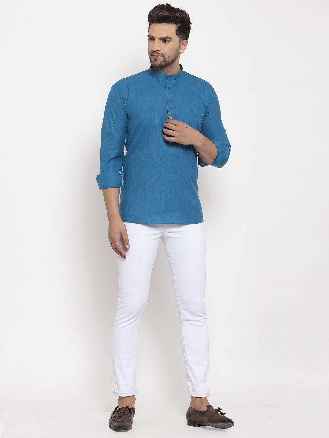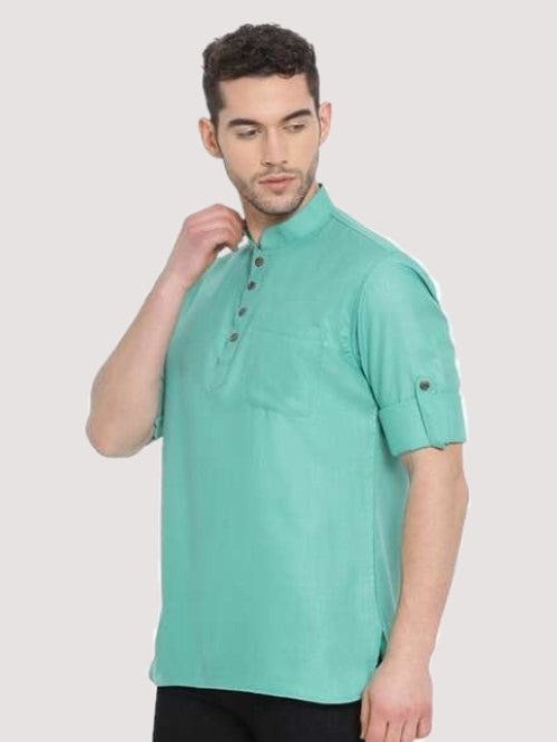 Straight short kurta, has a mandarin collar, Roll Up long sleeves, side pockets, button closure, side slits, straight hem