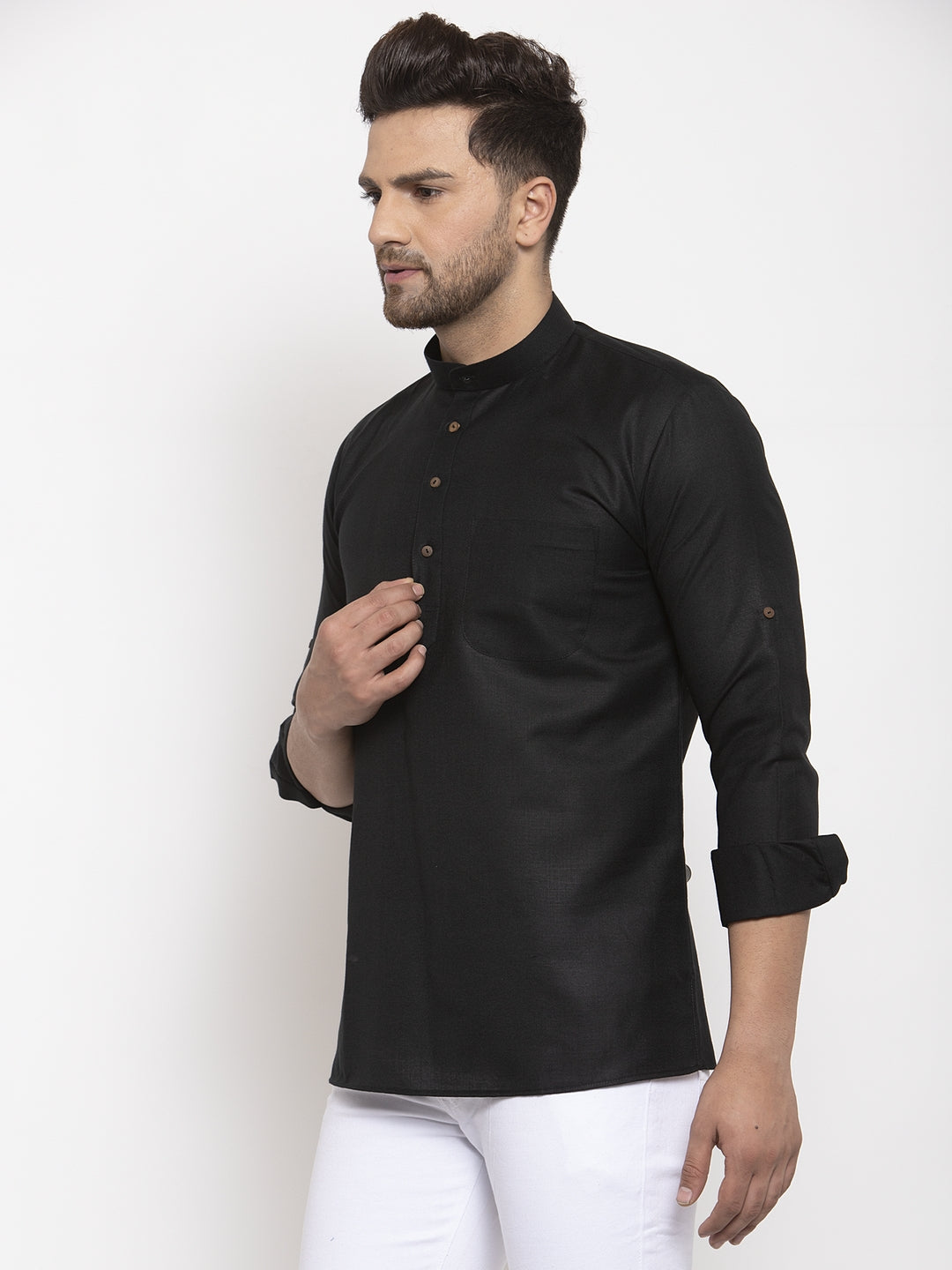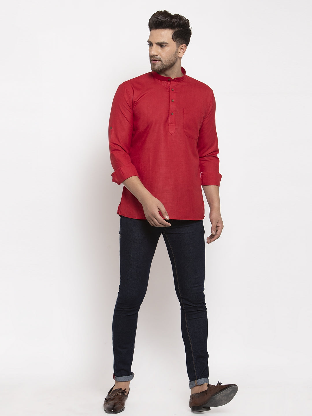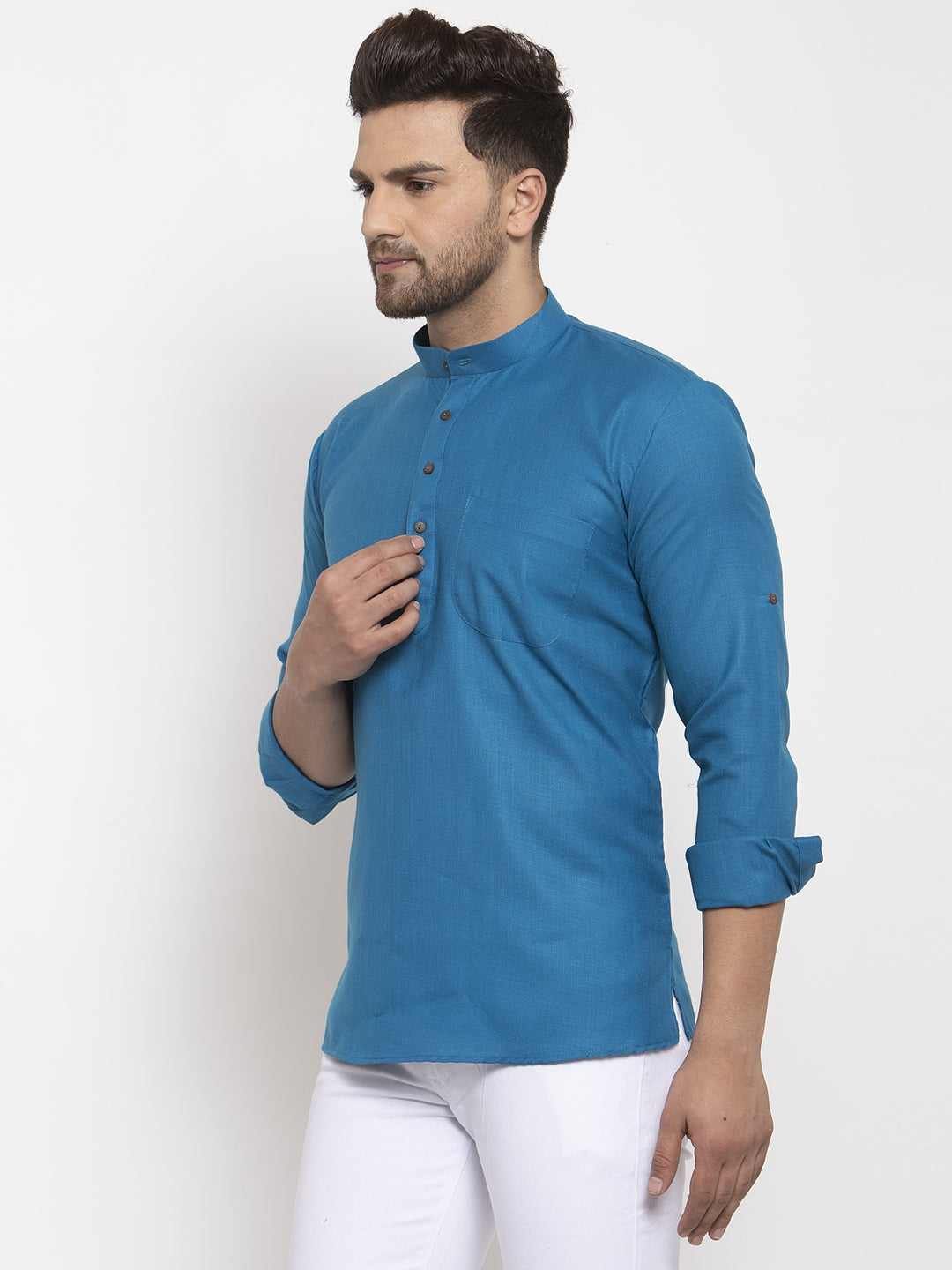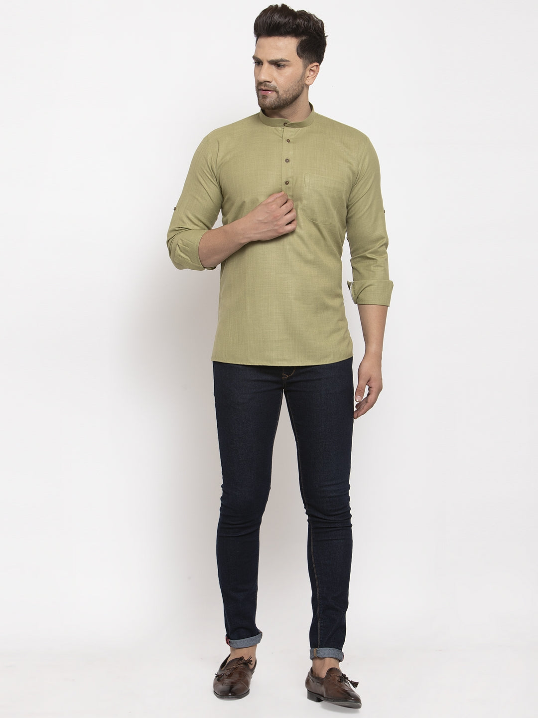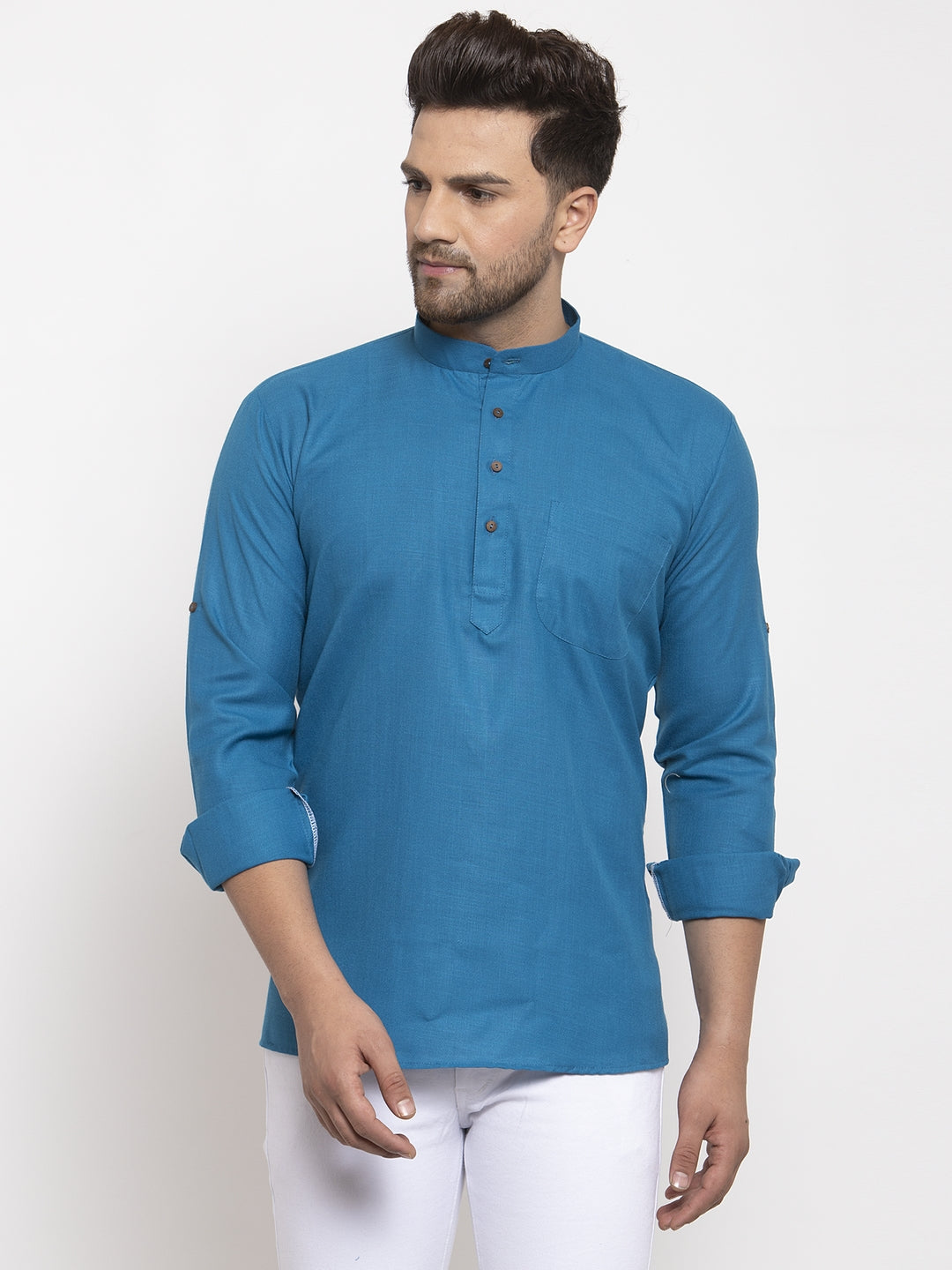 Straight short kurta, has a mandarin collar, Roll Up long sleeves, side pockets, button closure, side slits, straight hem