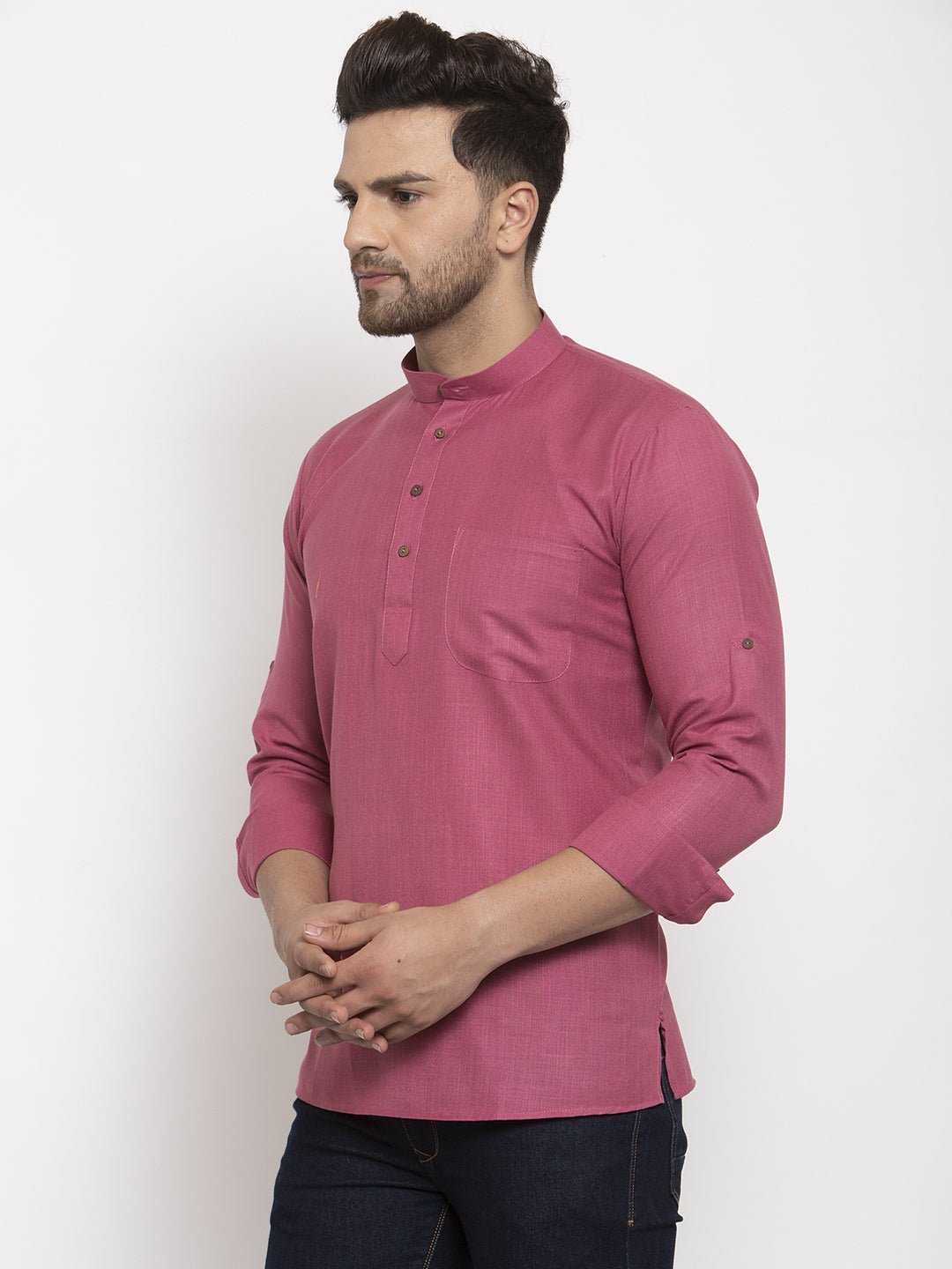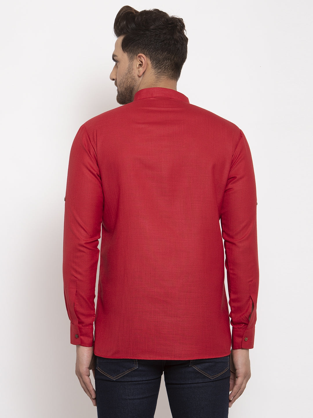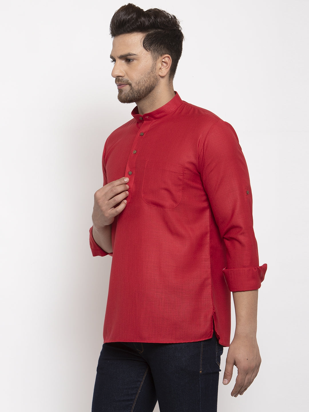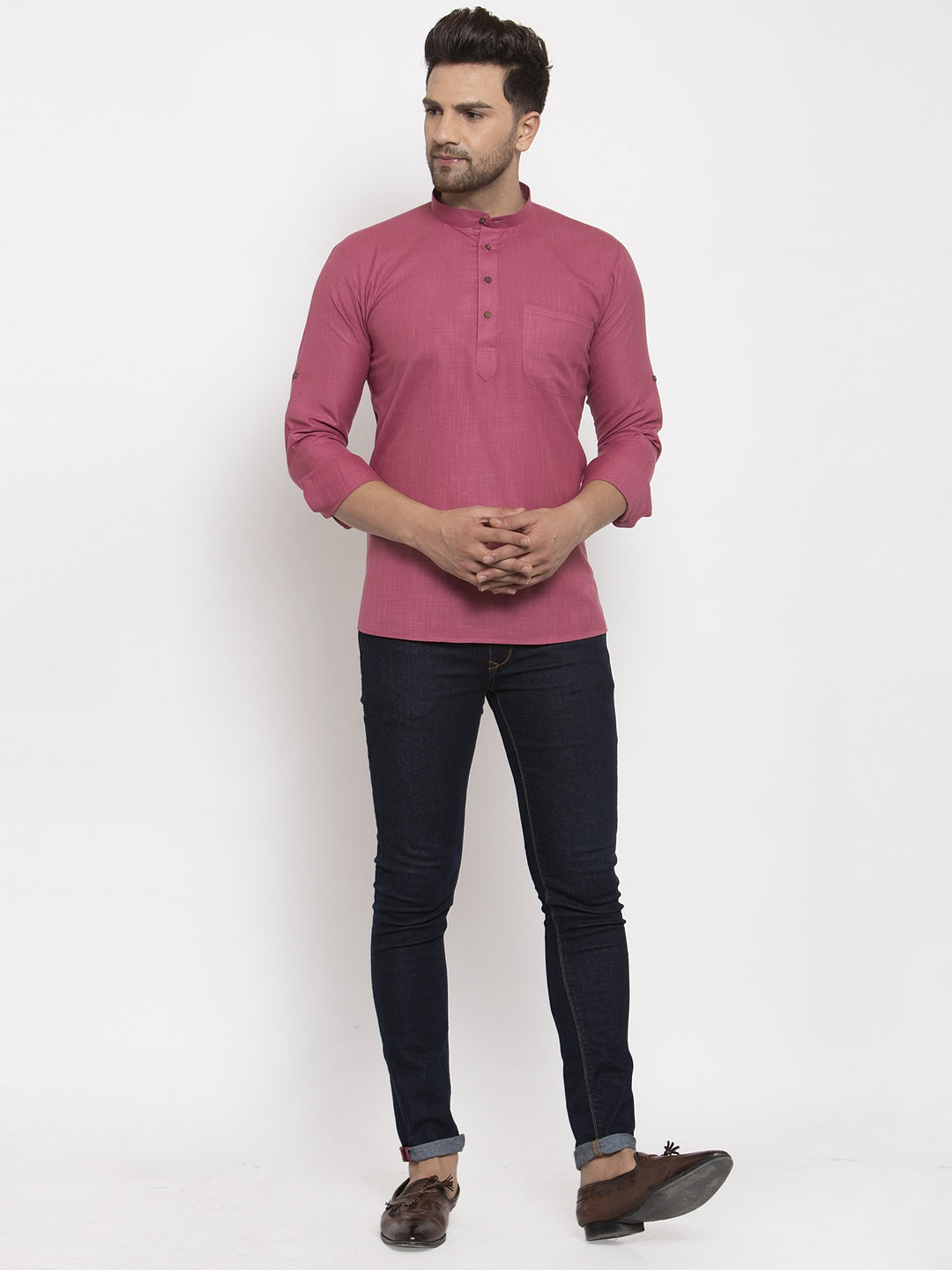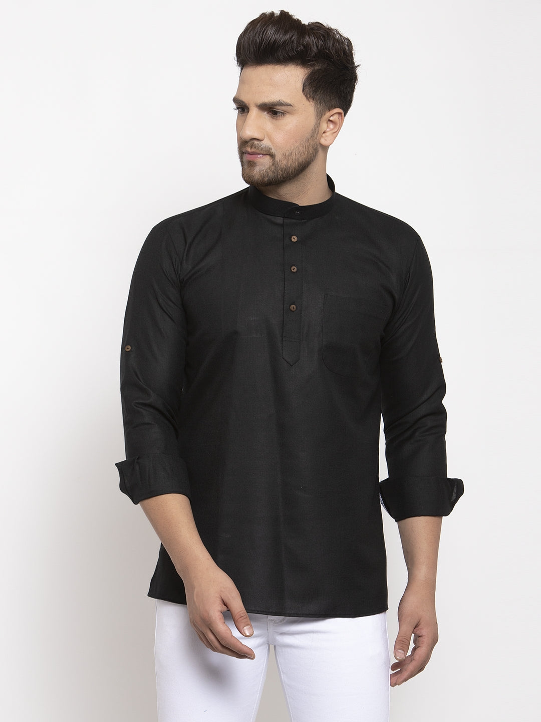 Straight short kurta, has a mandarin collar, Roll Up long sleeves, side pockets, button closure, side slits, straight hem