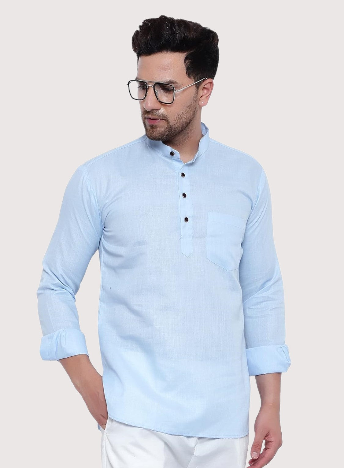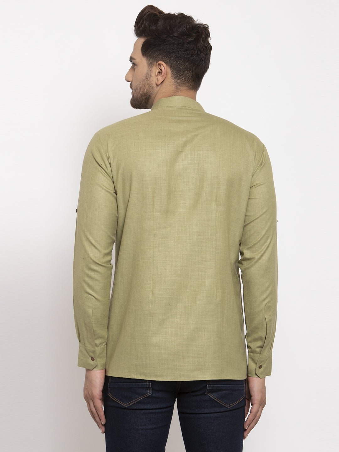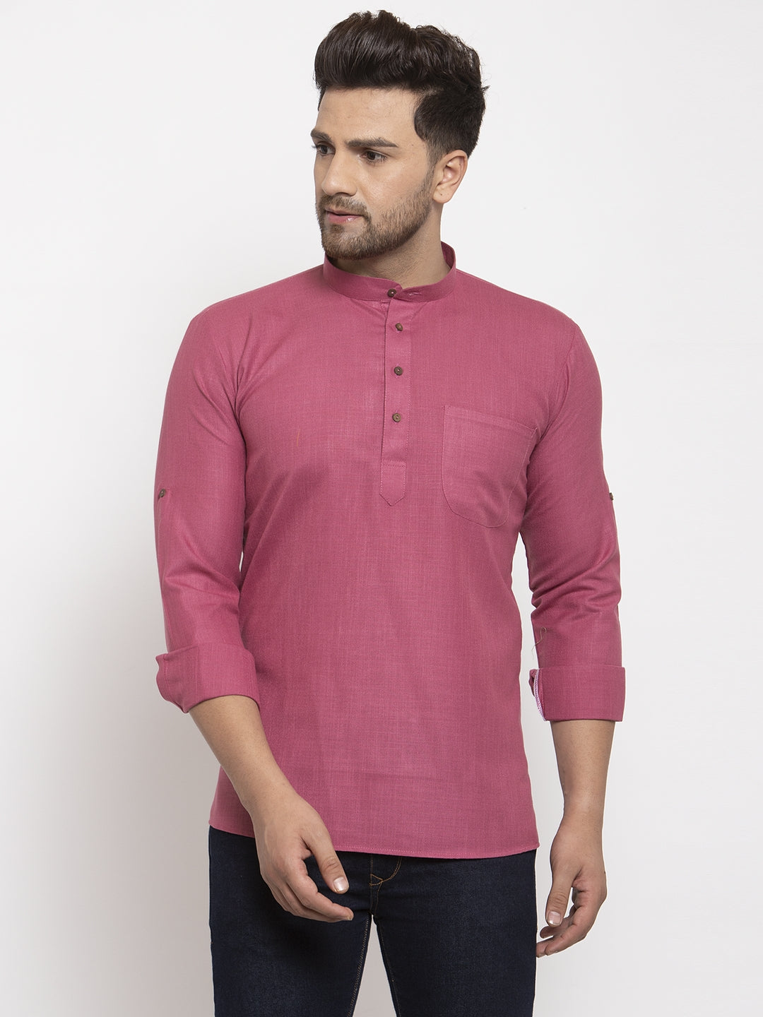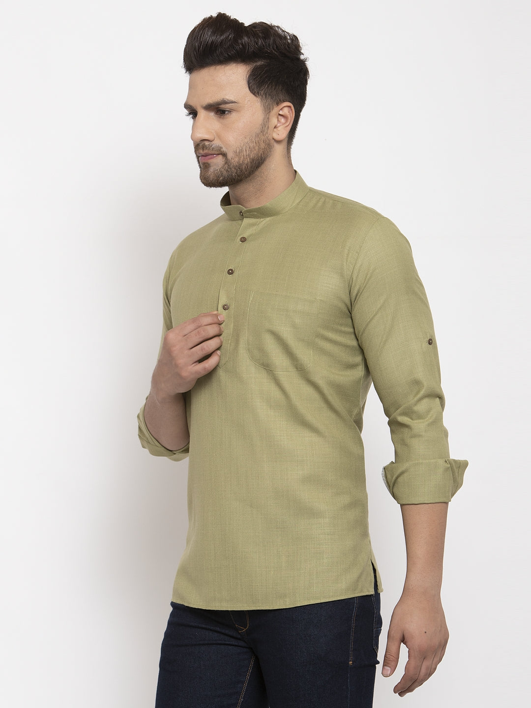 Straight short kurta, has a mandarin collar, Roll Up long sleeves, side pockets, button closure, side slits, straight hem