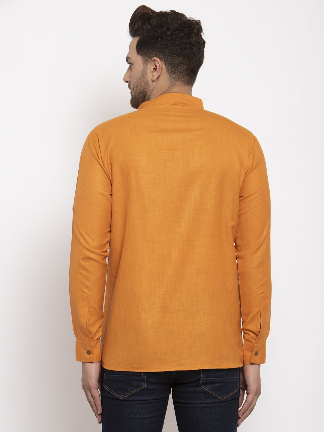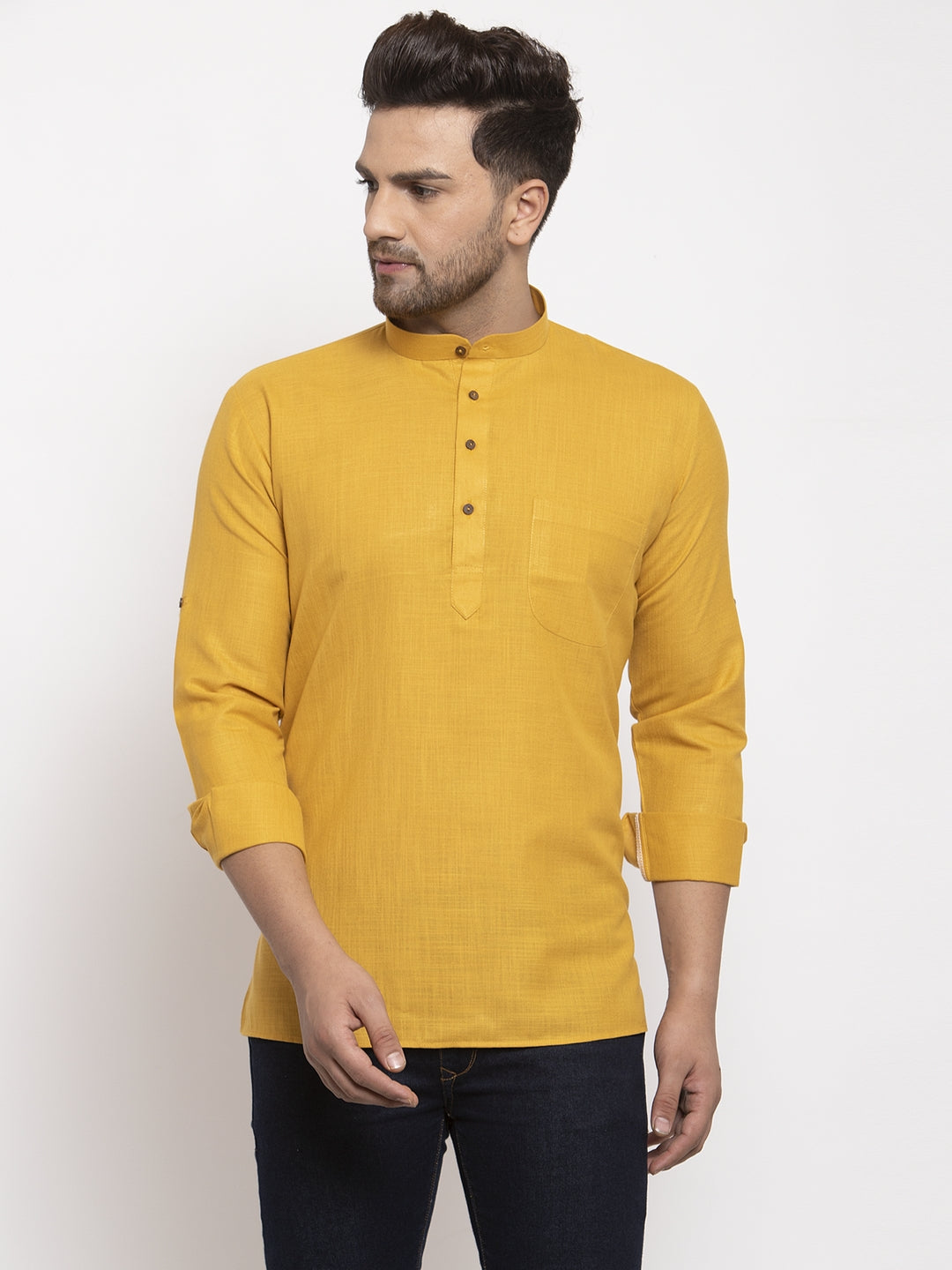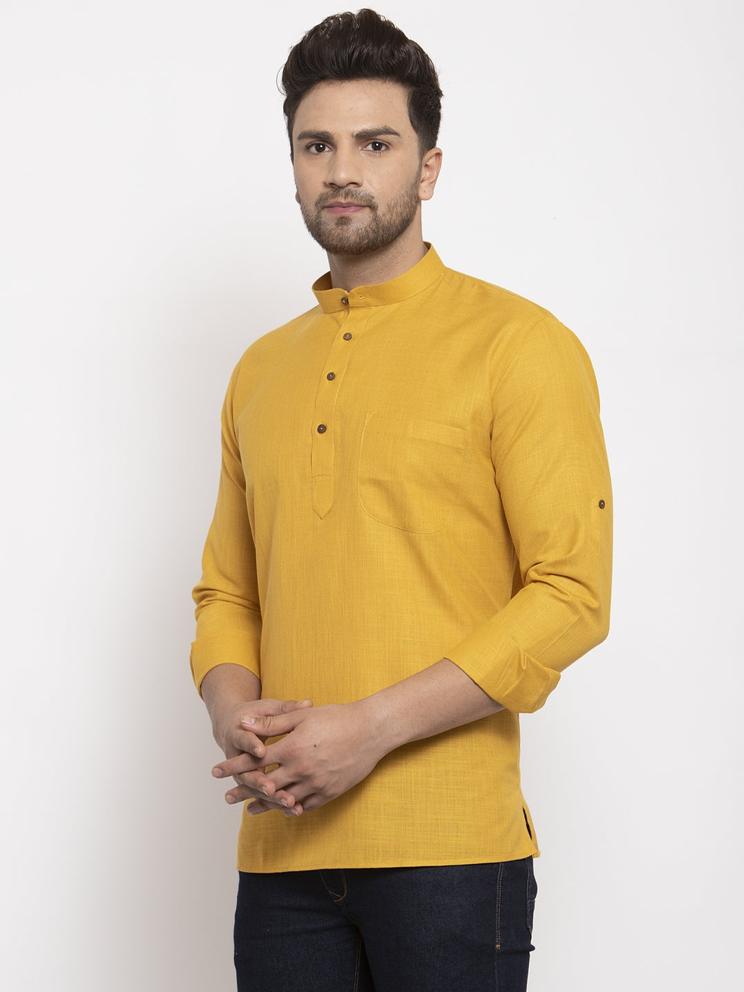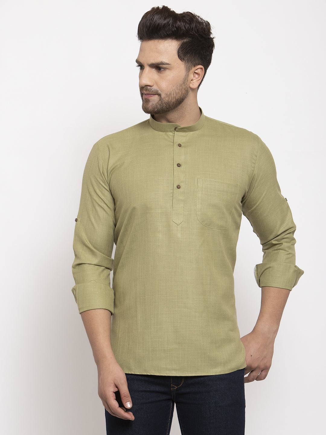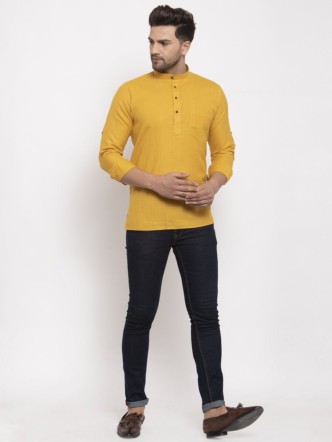 Straight short kurta, has a mandarin collar, Roll Up long sleeves, side pockets, button closure, side slits, straight hem