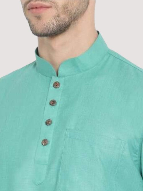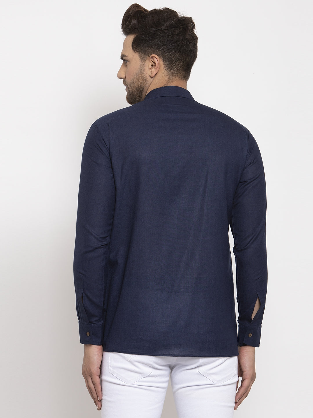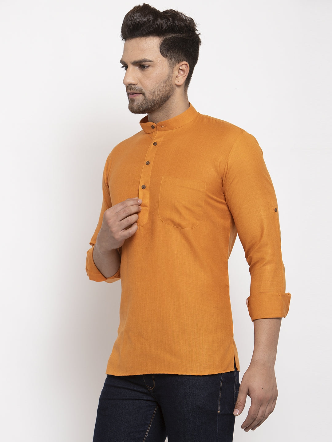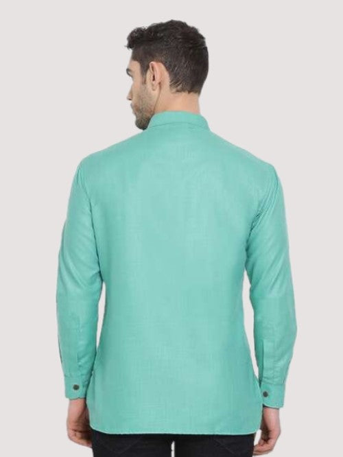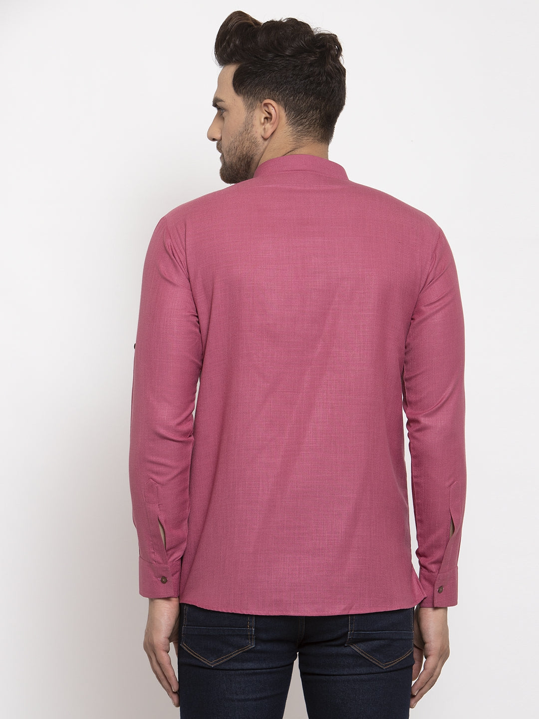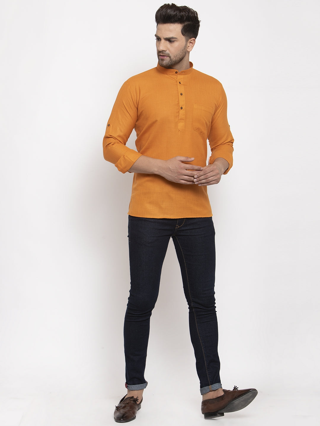 Straight short kurta, has a mandarin collar, Roll Up long sleeves, side pockets, button closure, side slits, straight hem