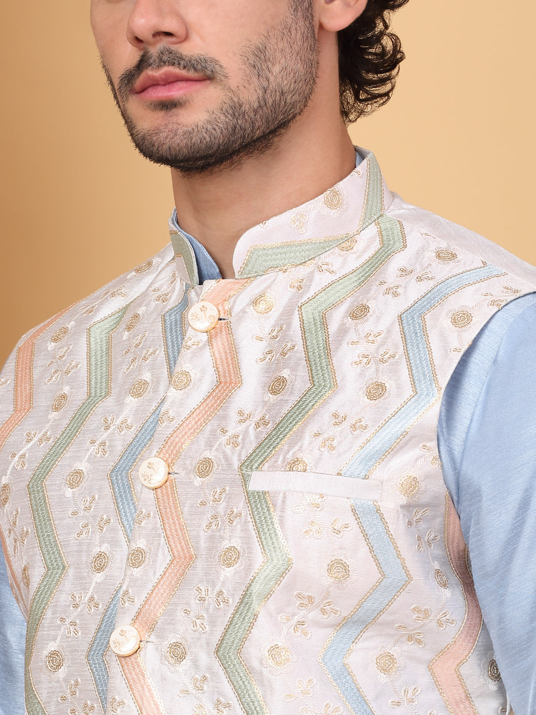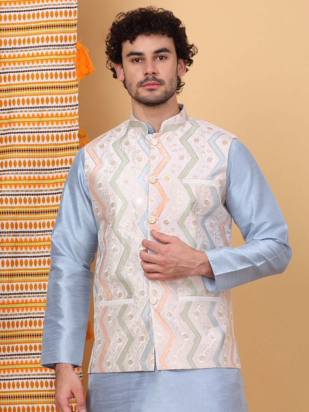 LUXE- Silk Blend Cream Chevron Embroidered Sleeveless Nehru Jacket