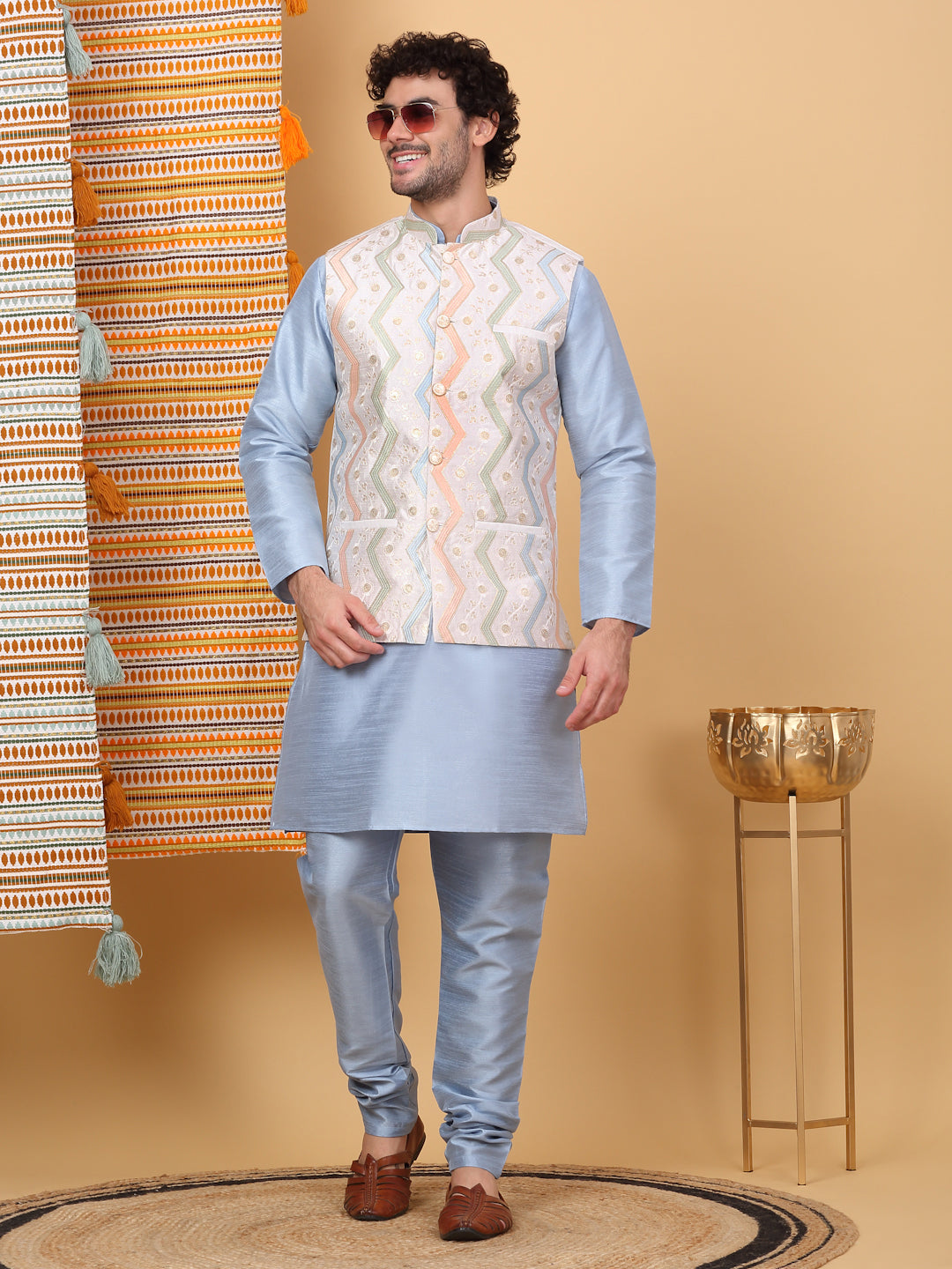 Enhance your formal attire with our Men's Silk Blend Nehru Jacket. Made from a luxurious blend of silk and cotton, this jacket features a stylish cream chevron embroidered design and a sleek mandarin collar for a sophisticated look. The sleeveless design and satin lining provide both comfort and style. With a convenient front pocket and button closure, this jacket is the perfect addition to any outfit.