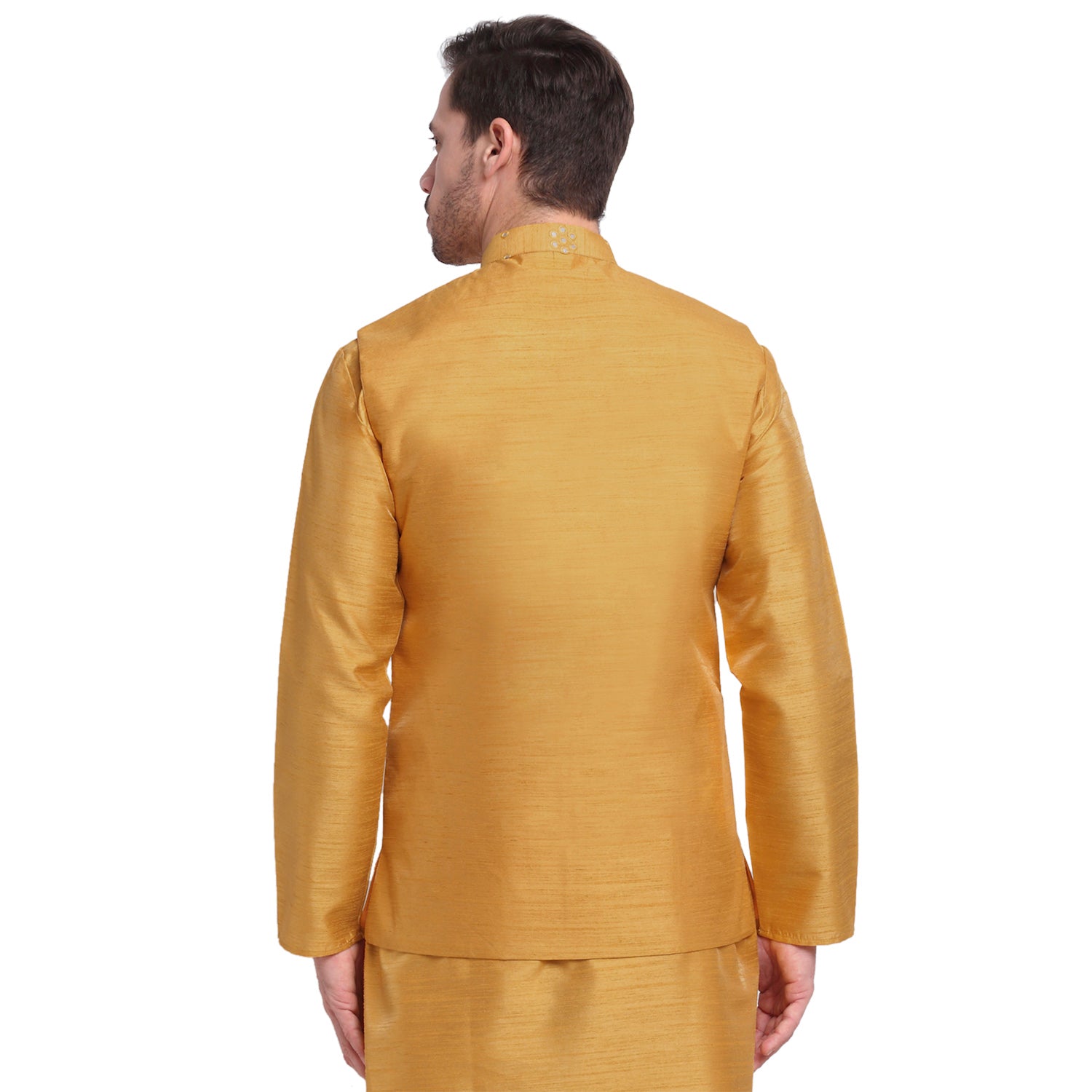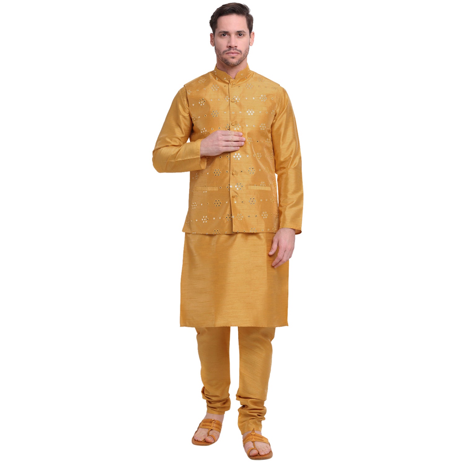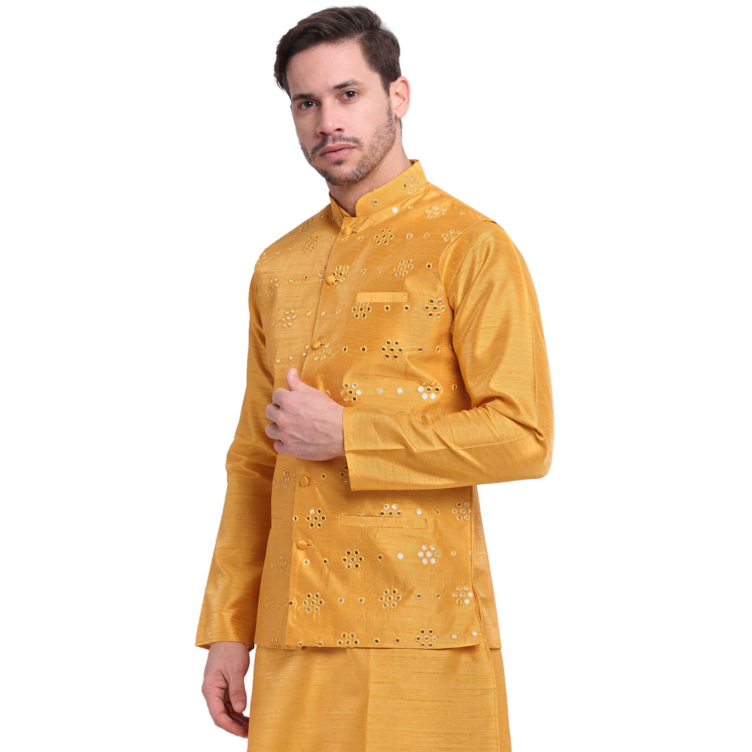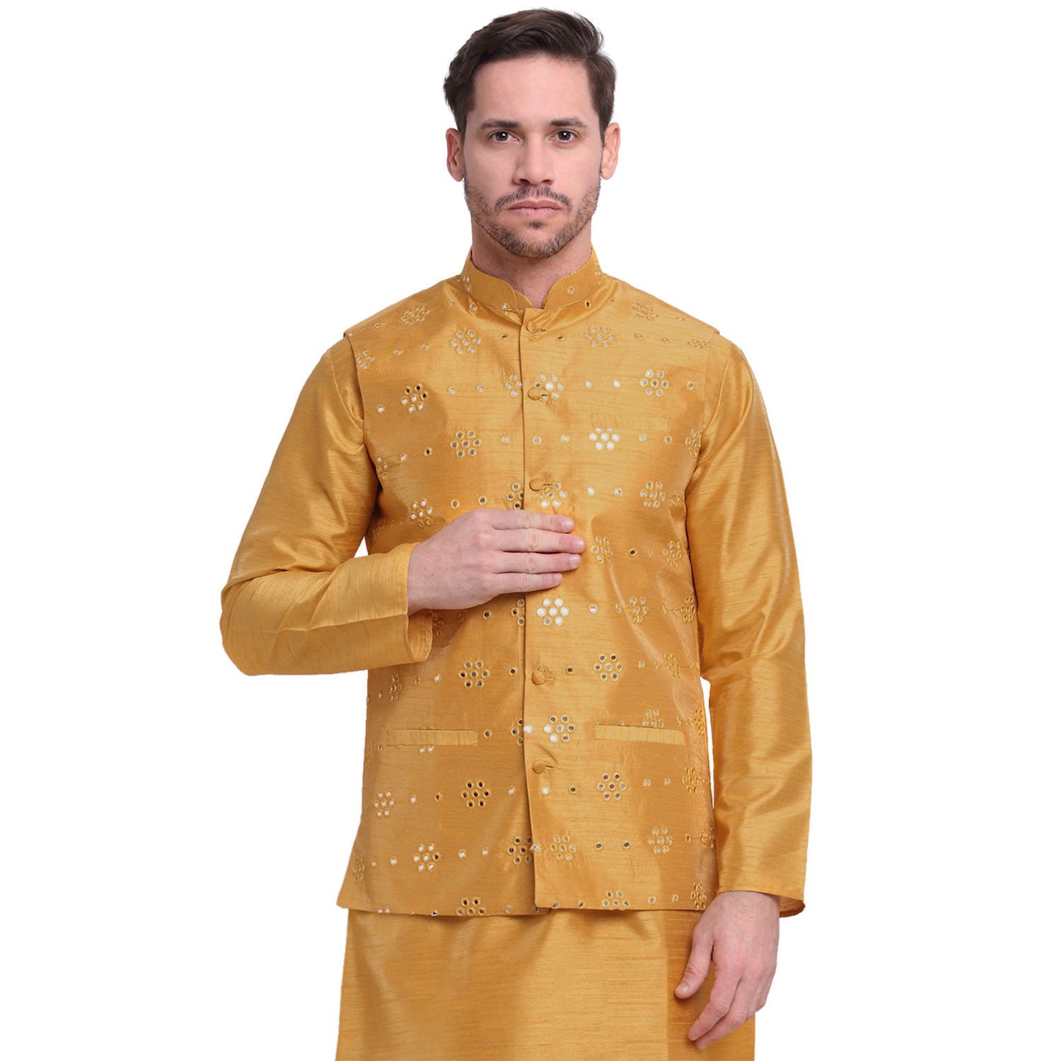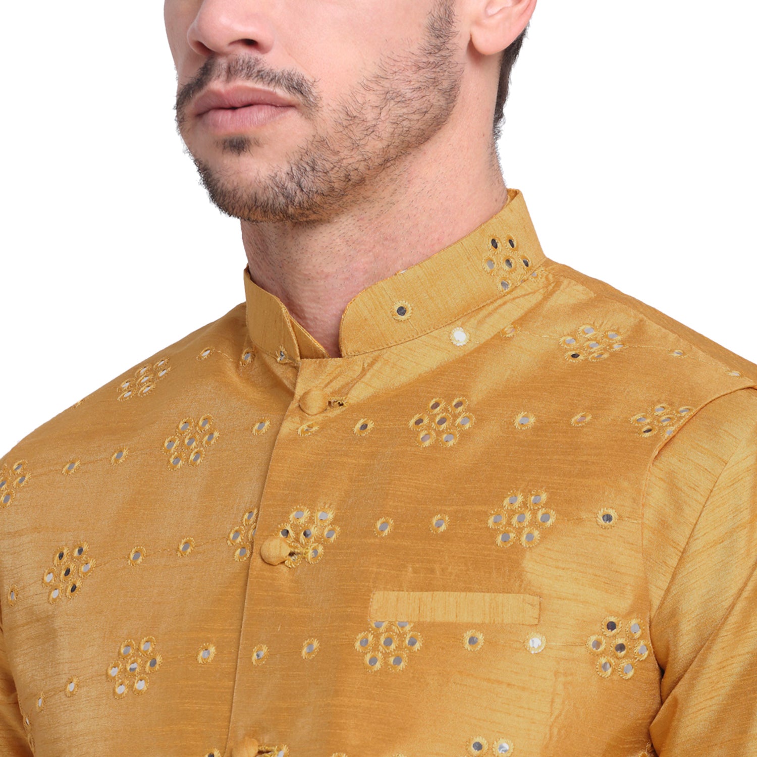 Men's Gold Silk Blend Mirror Work Nehru Jacket