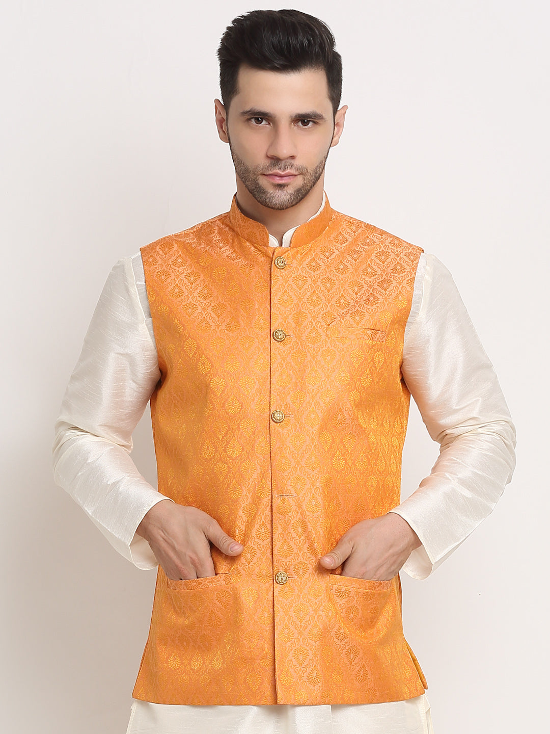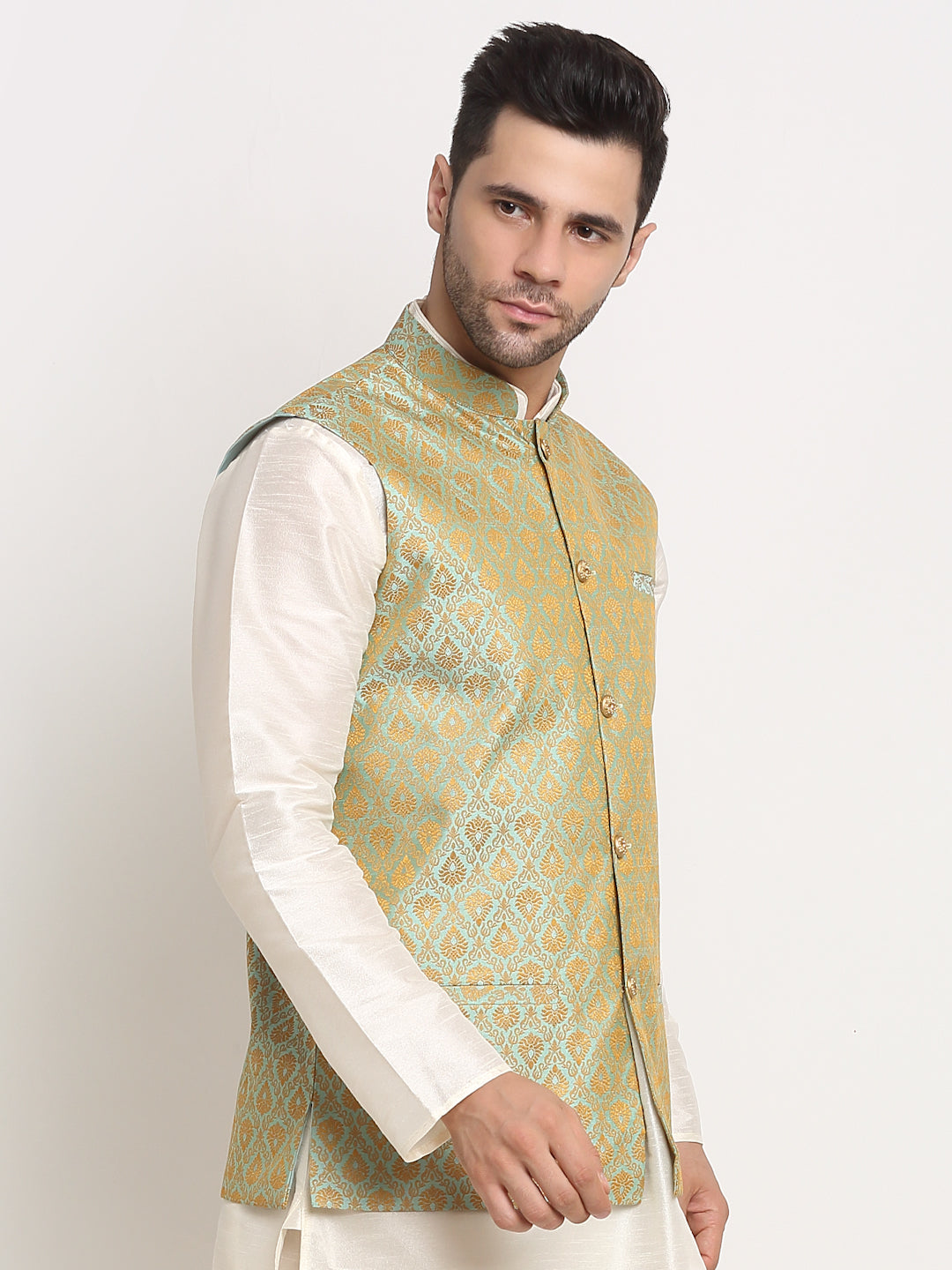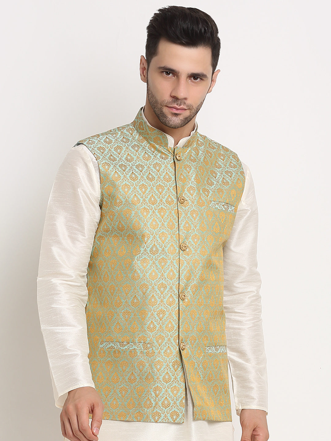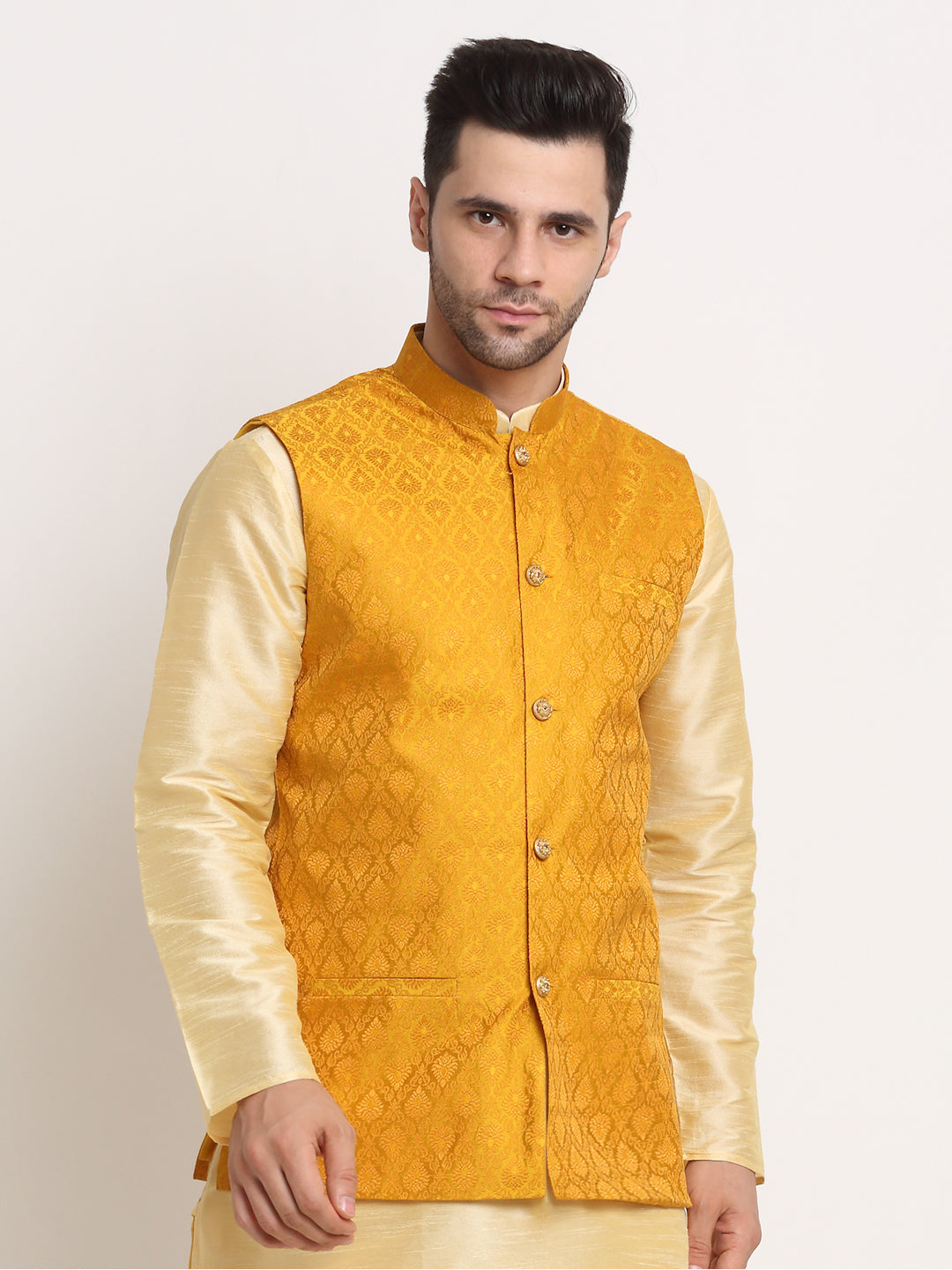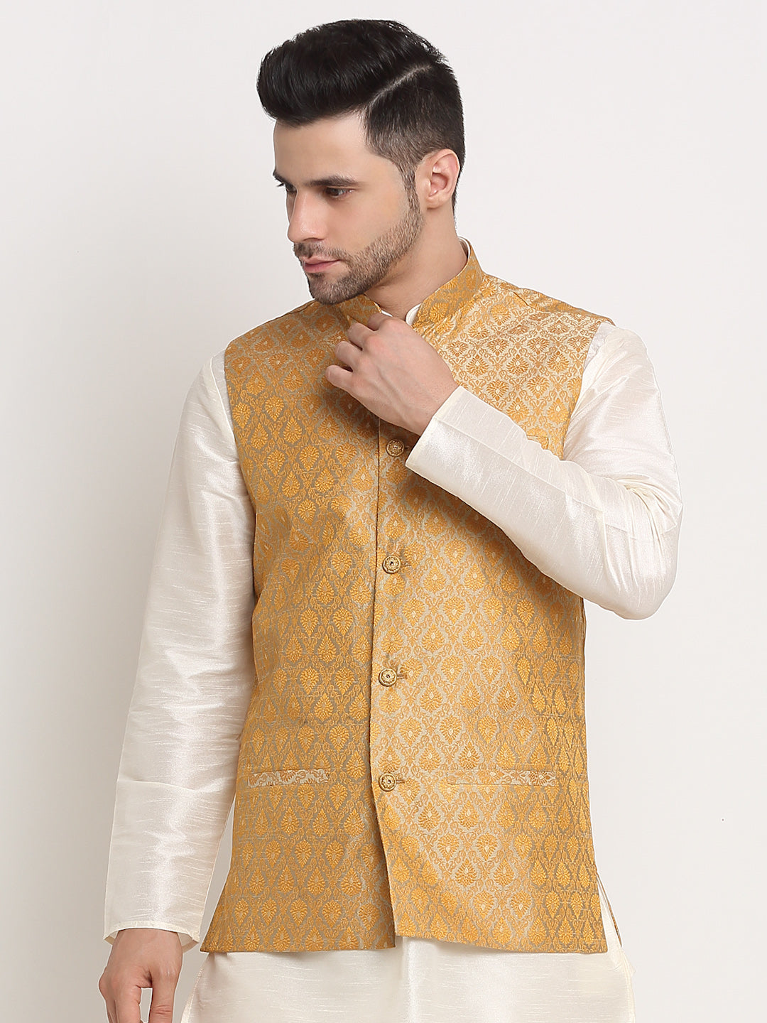 Woven Design Nehru jacket, has a mandarin collar, is sleeveless, button closure, three pockets, and an attached lining.
